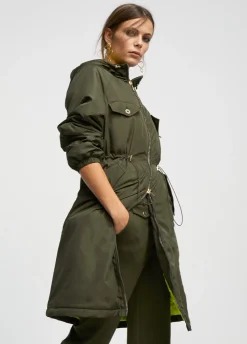 Anorak acolchado con capucha. Cierre con cremallera dorada de doble carro. Bolsillos frontales con tapete y botón. Cintura ajustable. Logo a contraste en espalda e interior acolchado en color lima.
