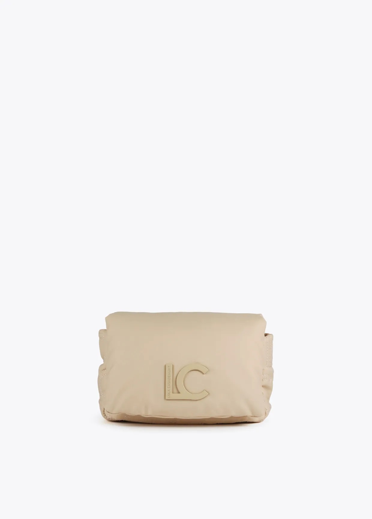 Bolso tipo bandolera acolchada de nylon con monograma bordado. Asa bandolera ajustable y extraíble y cierre en solapa con botones imantados.