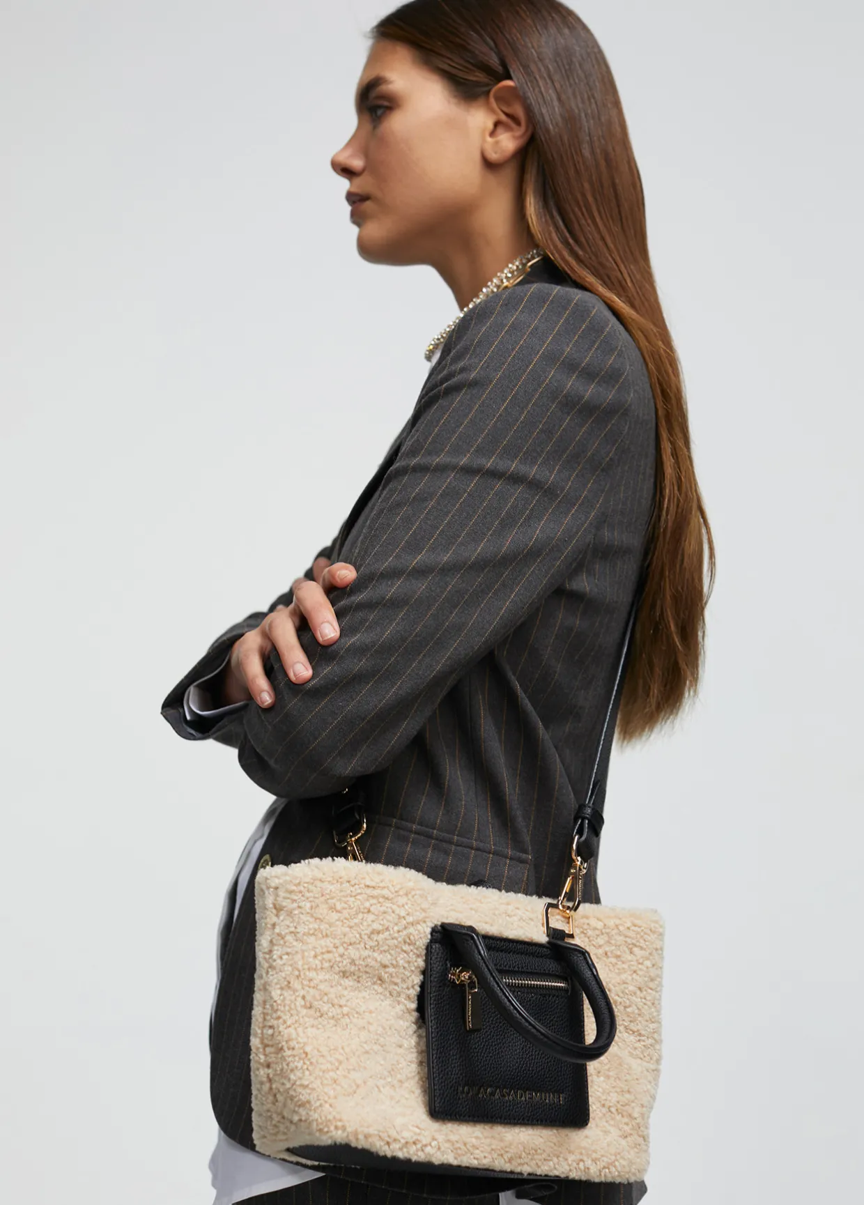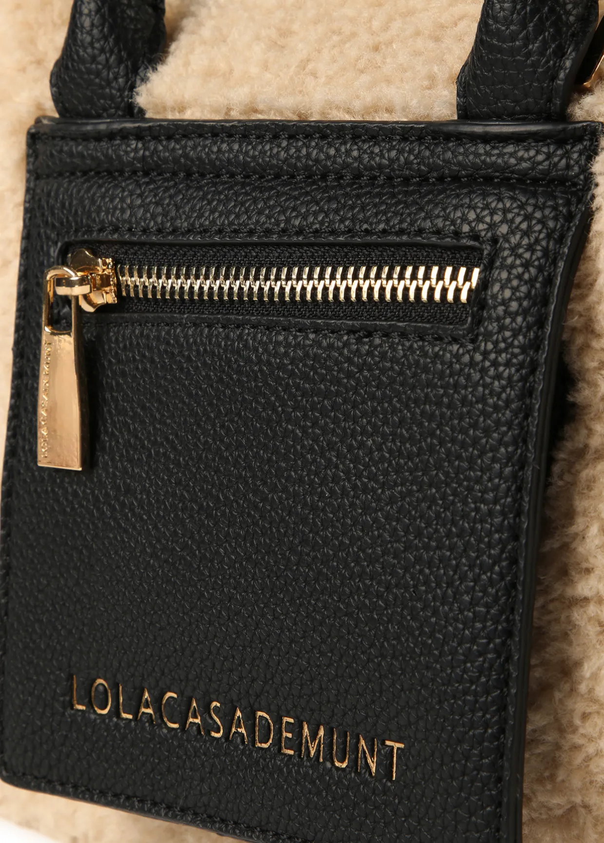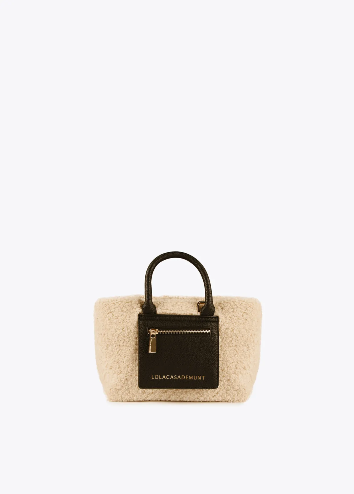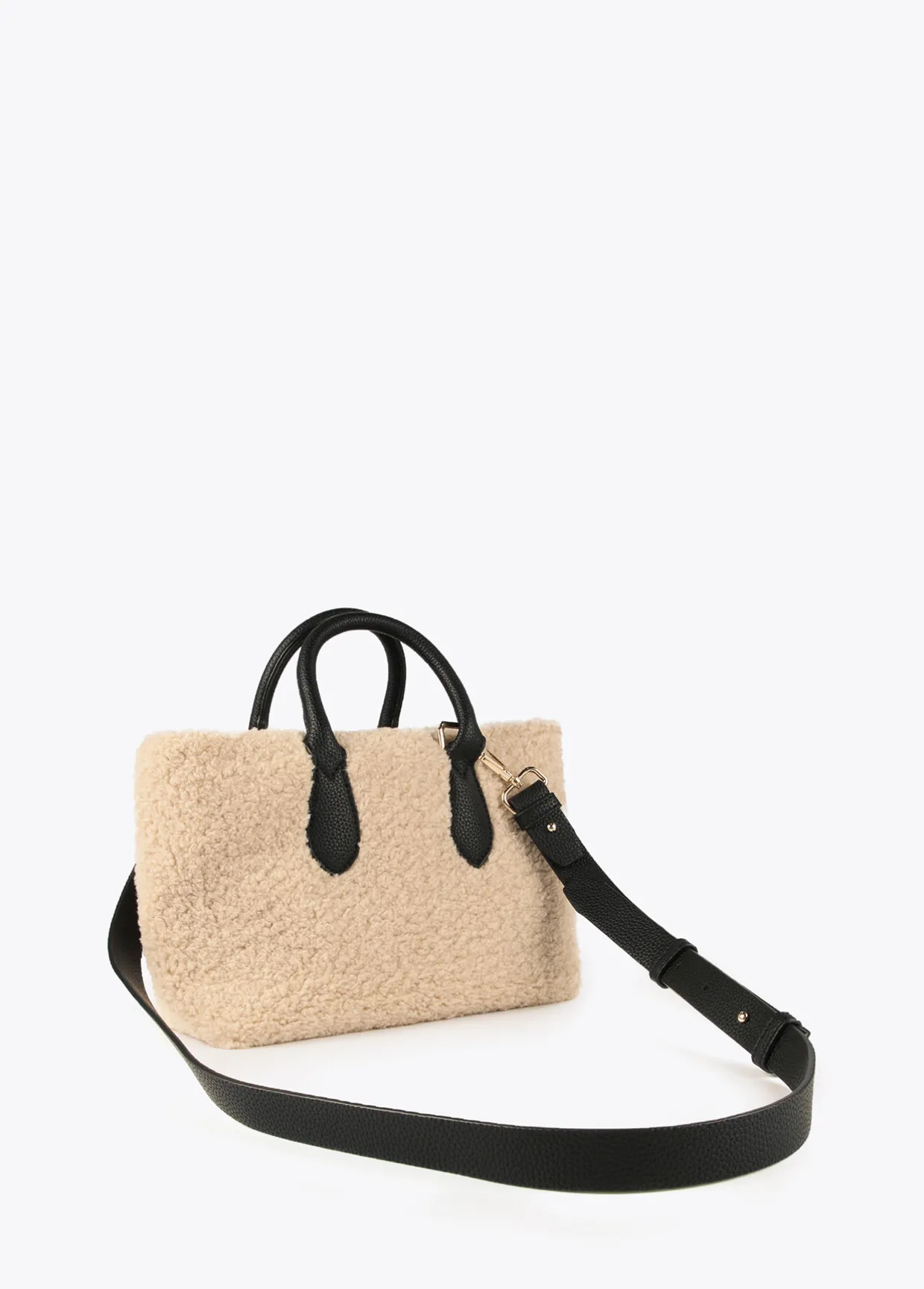 Bolso bandolera de borreguito combinada con detalles en efecto piel. Bolsillo exterior, asas de mano y asa bandolera ajustable y extraíble. Cierre con lengüeta y botón imantado.