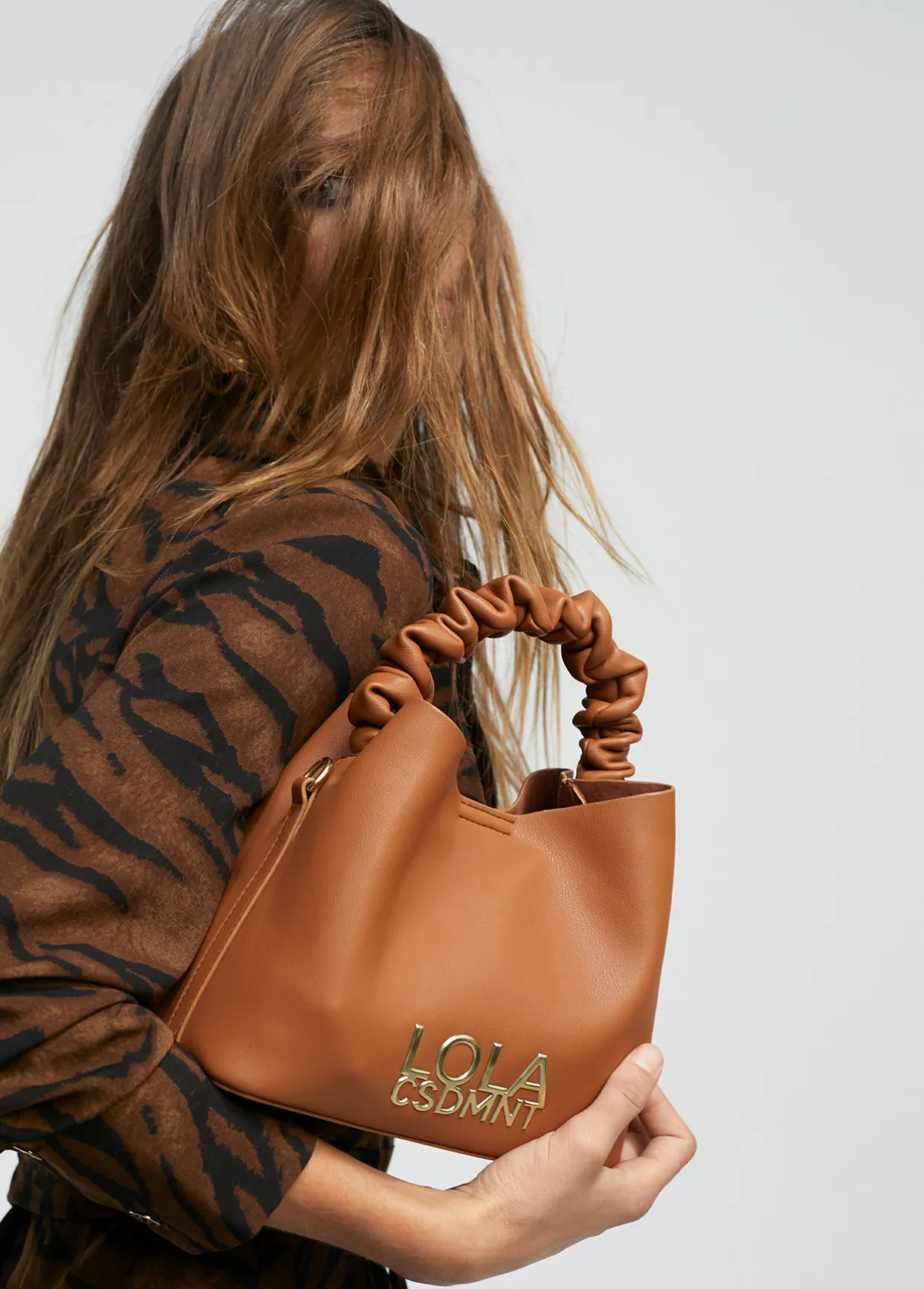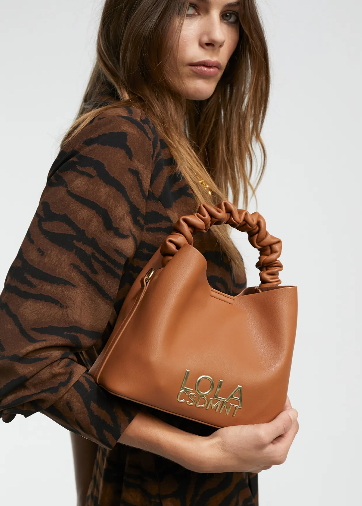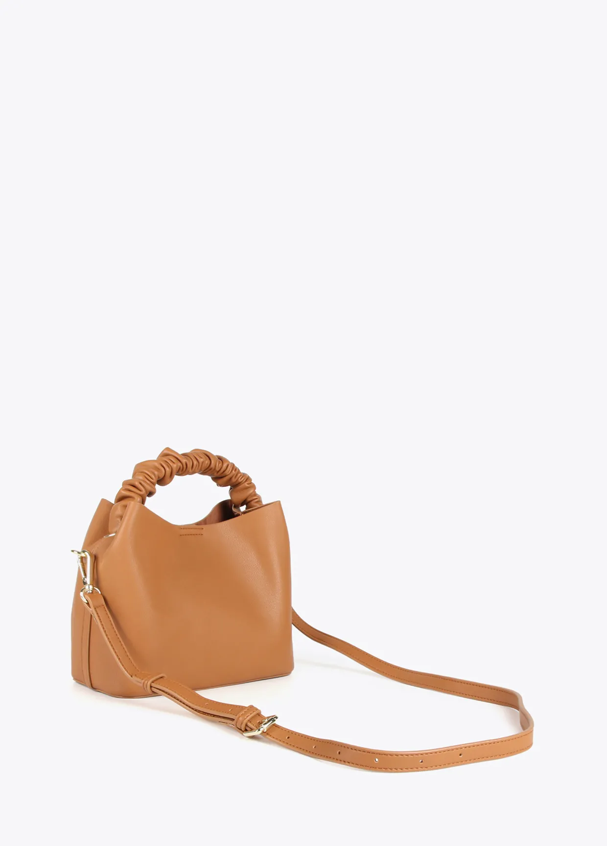 Bolso tipo bandolera en efecto piel con asa fruncida y mega logo dorado en parte frontal. Cierre con cremallera y asa bandolera ajustable y extraíble.