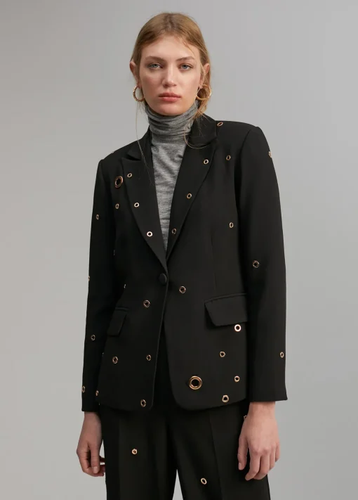 Blazer con eyelets metálicos en dorado. Cuello solapa, tapetes frontales y cerrada con botón.