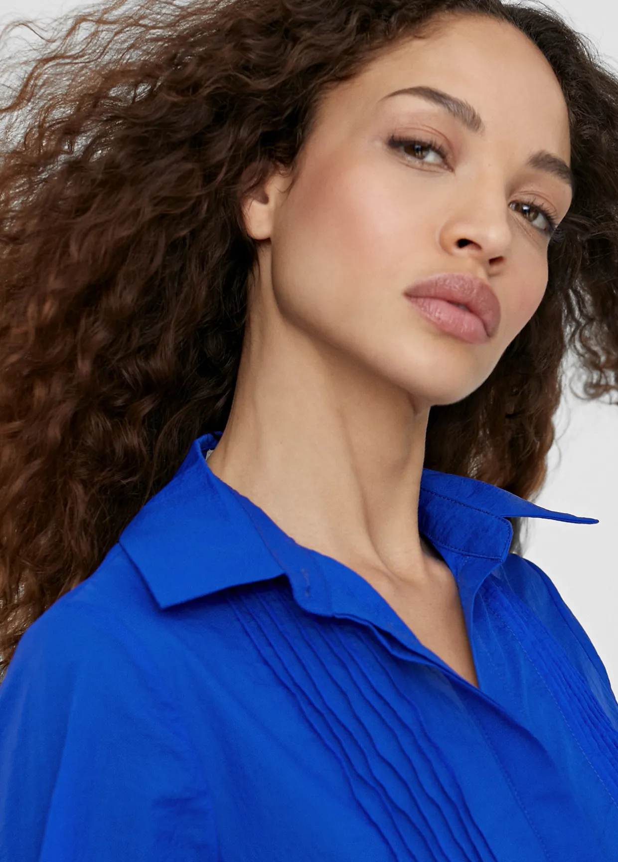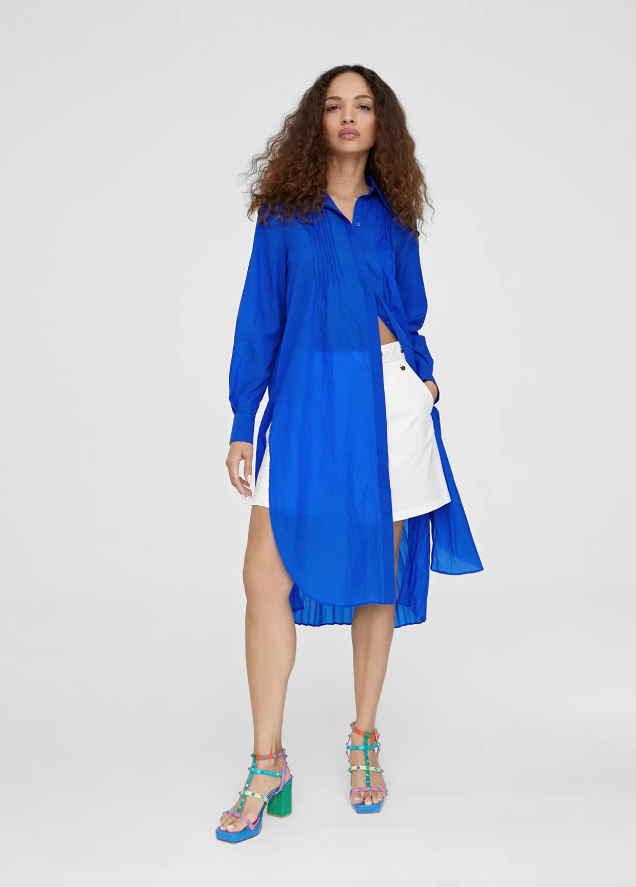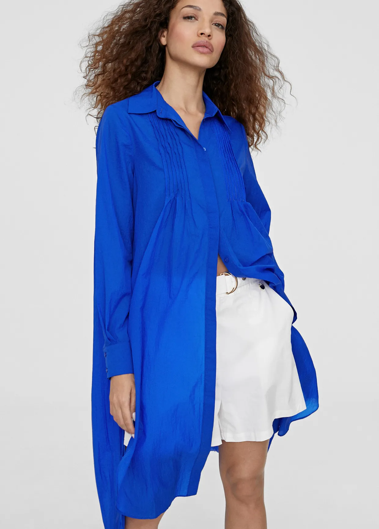 Blusón largo monocolor. Cuello y puños camiseros. Detalle de jaretas en pecho. Aberturas laterales en bajo.