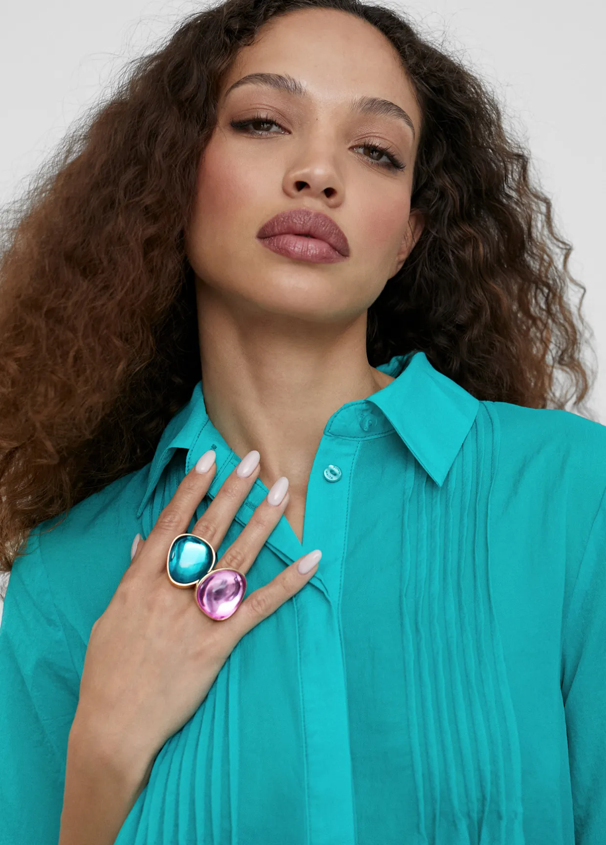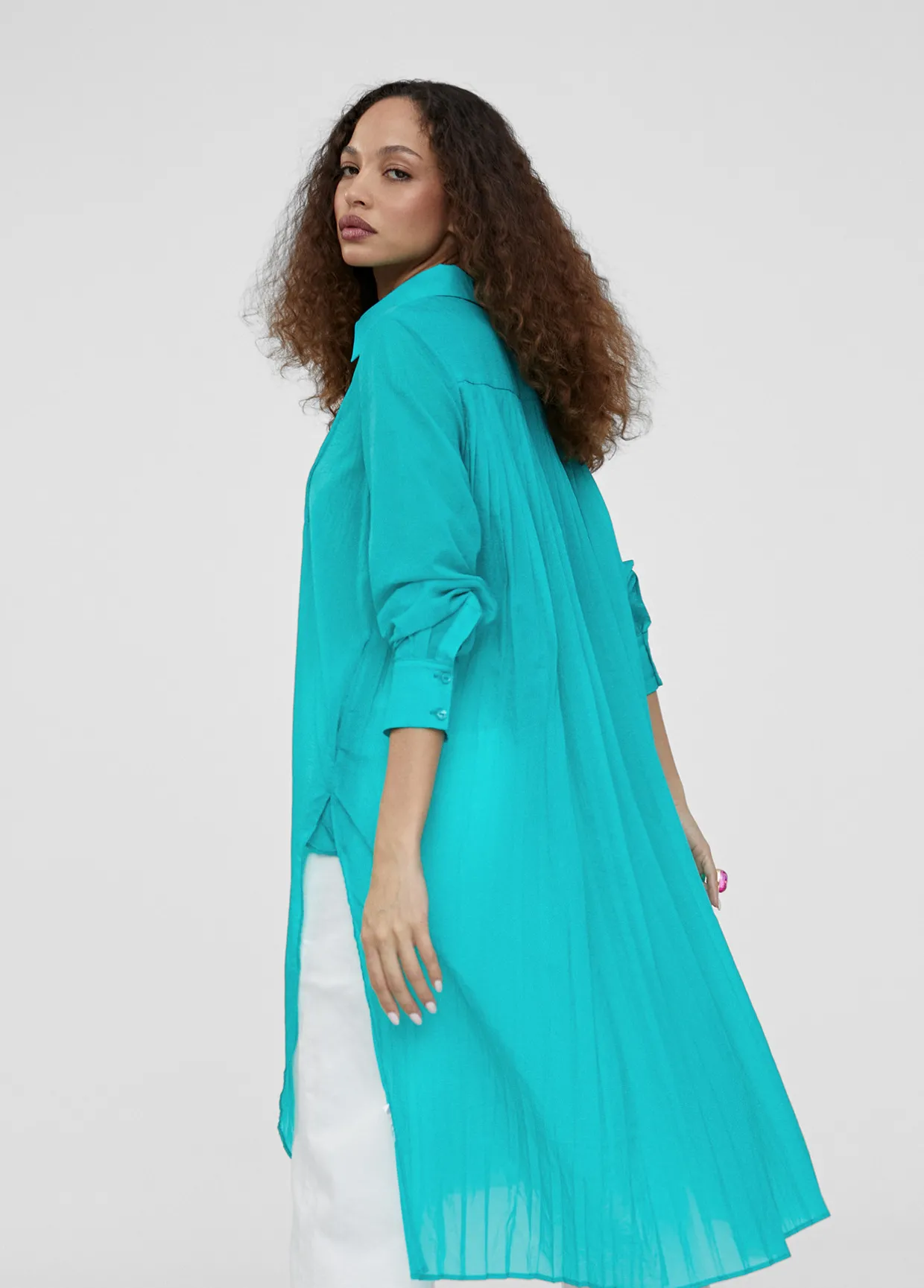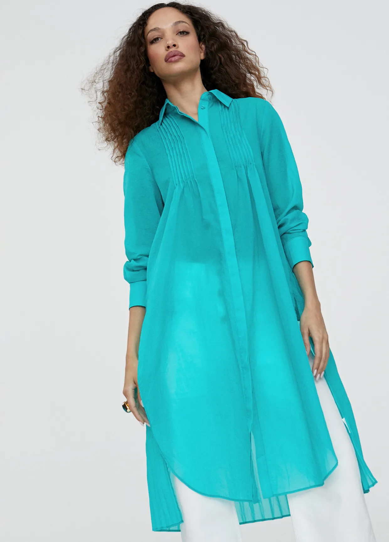 Blusón largo monocolor. Cuello y puños camiseros. Detalle de jaretas en pecho. Aberturas laterales en bajo.