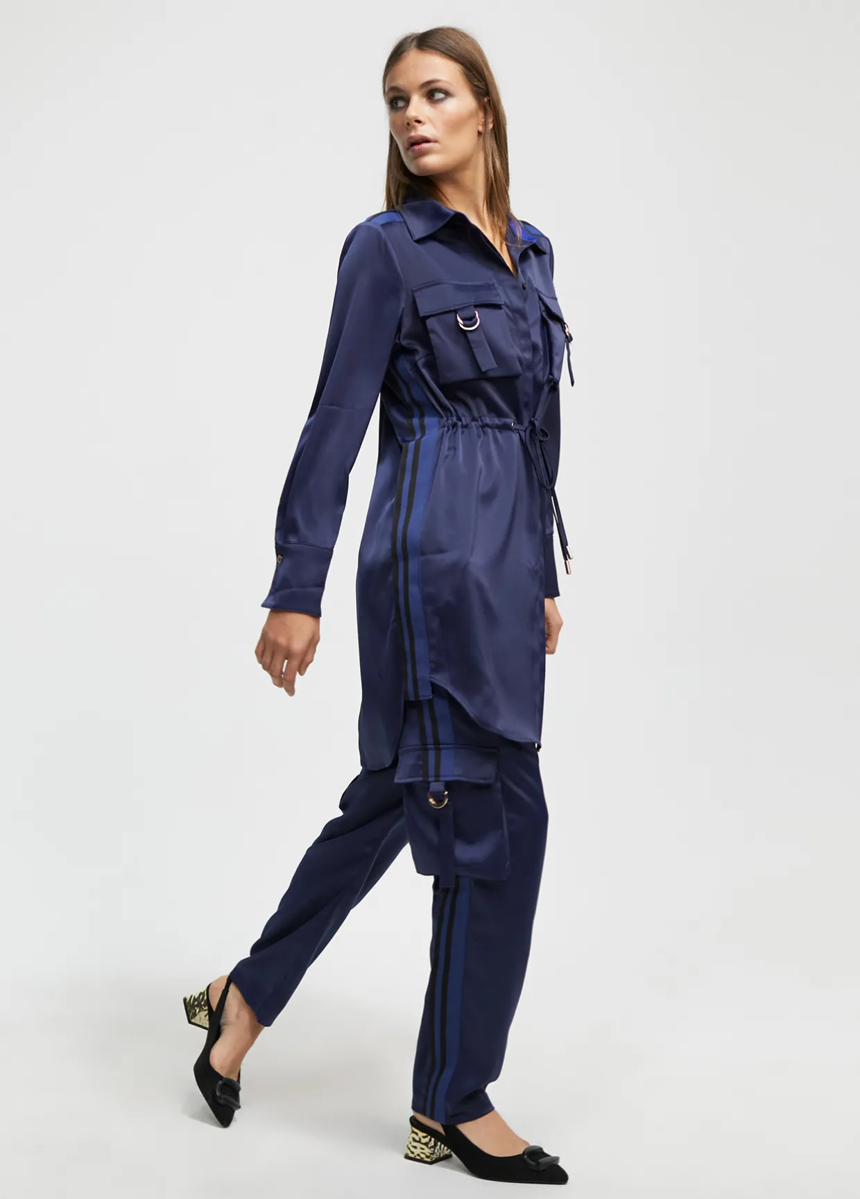 Blusón satinado con cuello y puños camiseros. Abierto con botones bajo tapete hasta cintura. Bolsillos plastrón con tapete y hebilla metálica. Cintura ajustable.