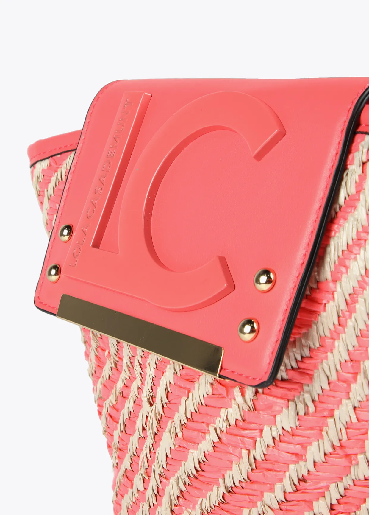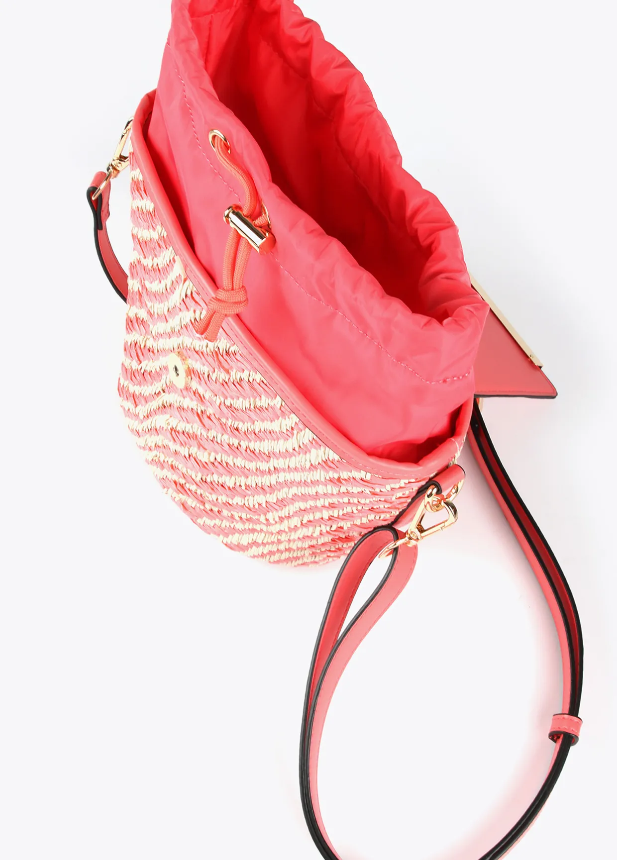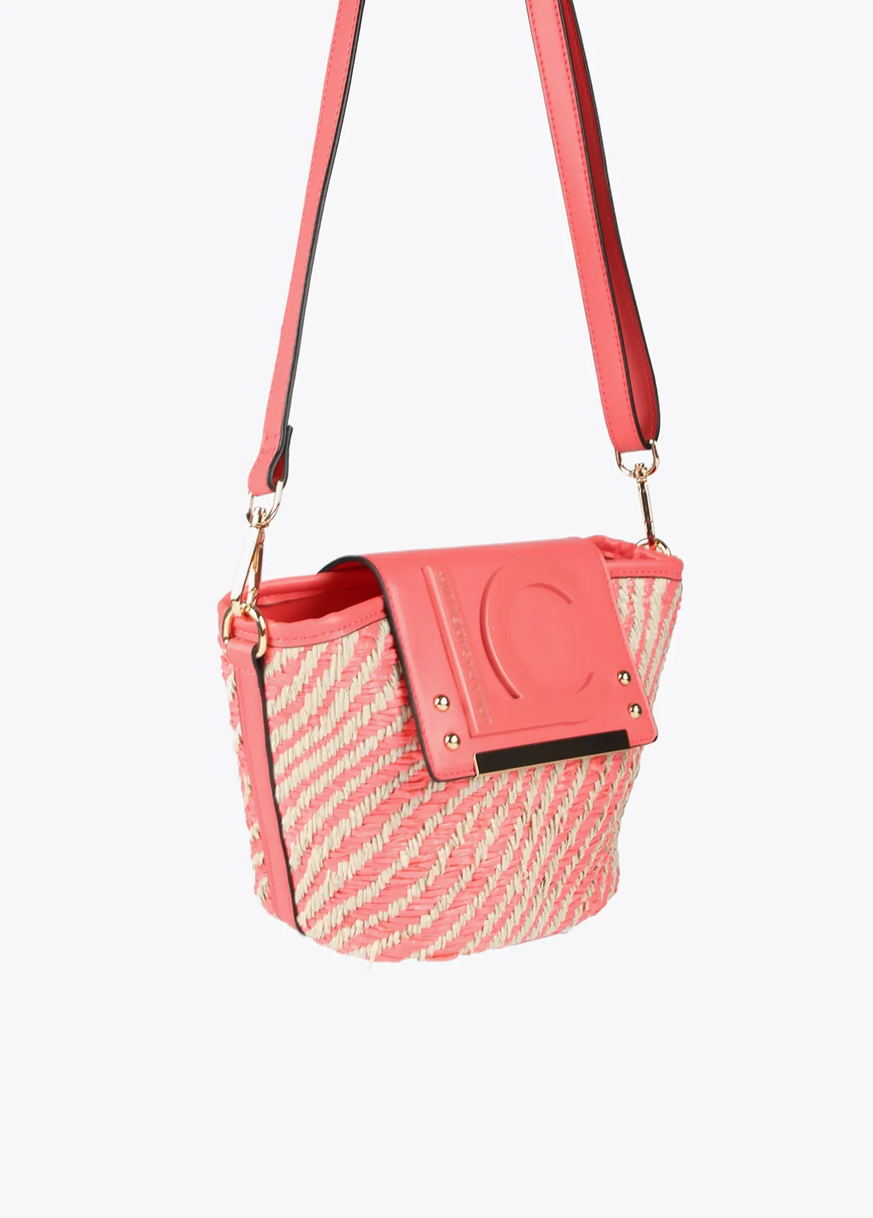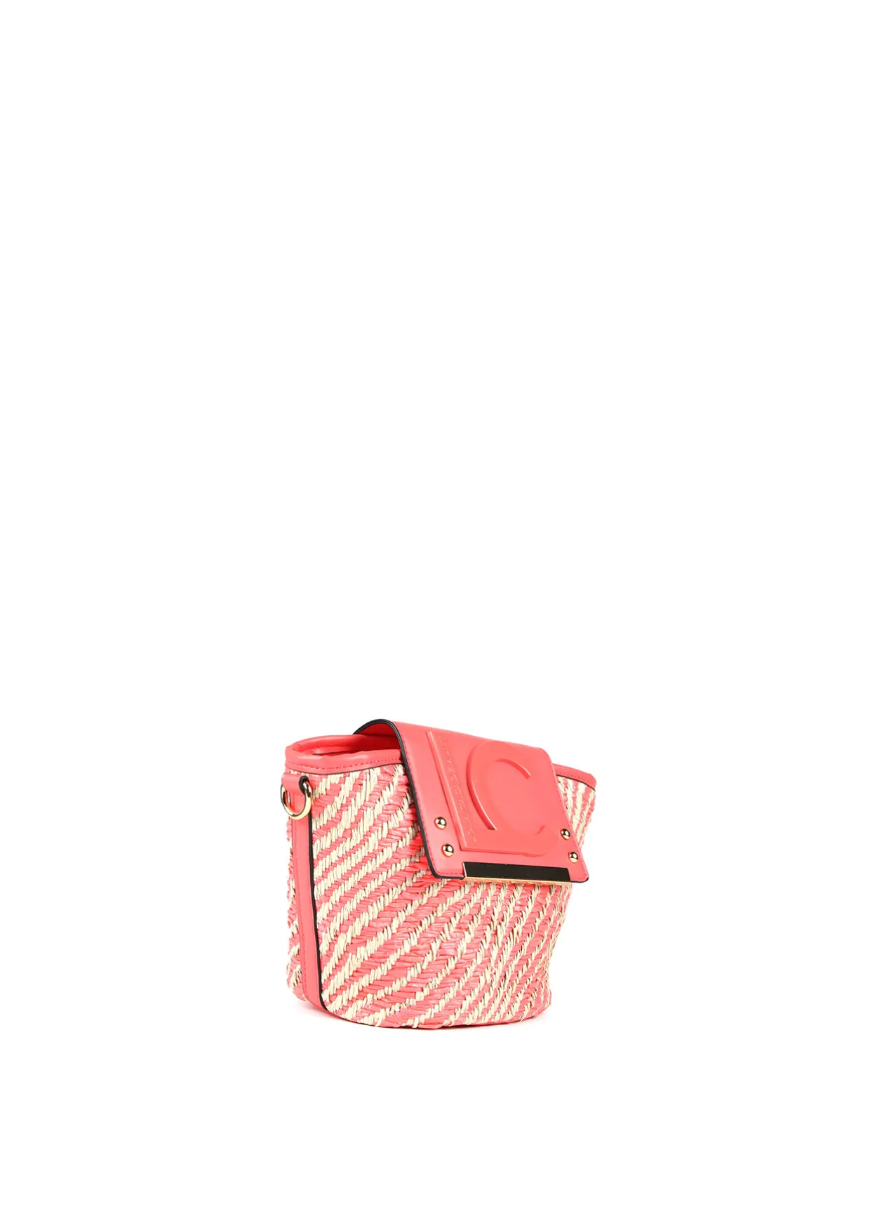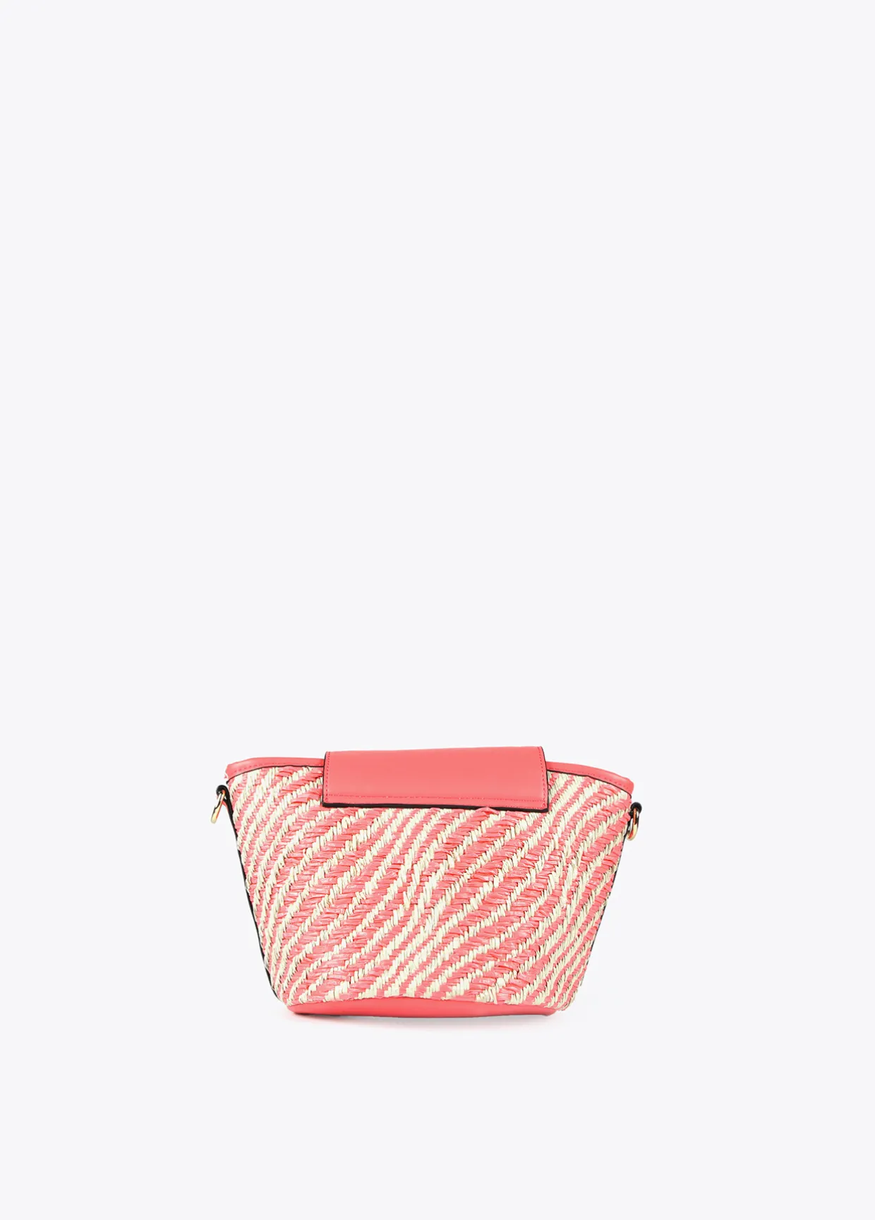 Bolsito bandolera tipo cesta en efecto rafia y detalles en efecto piel. Asa bandolera ajustable y extraible. Cierre con solapa logotipada y botón imantado. Bolsa interior protectora con cierre de cordón con mosquetón dorado.