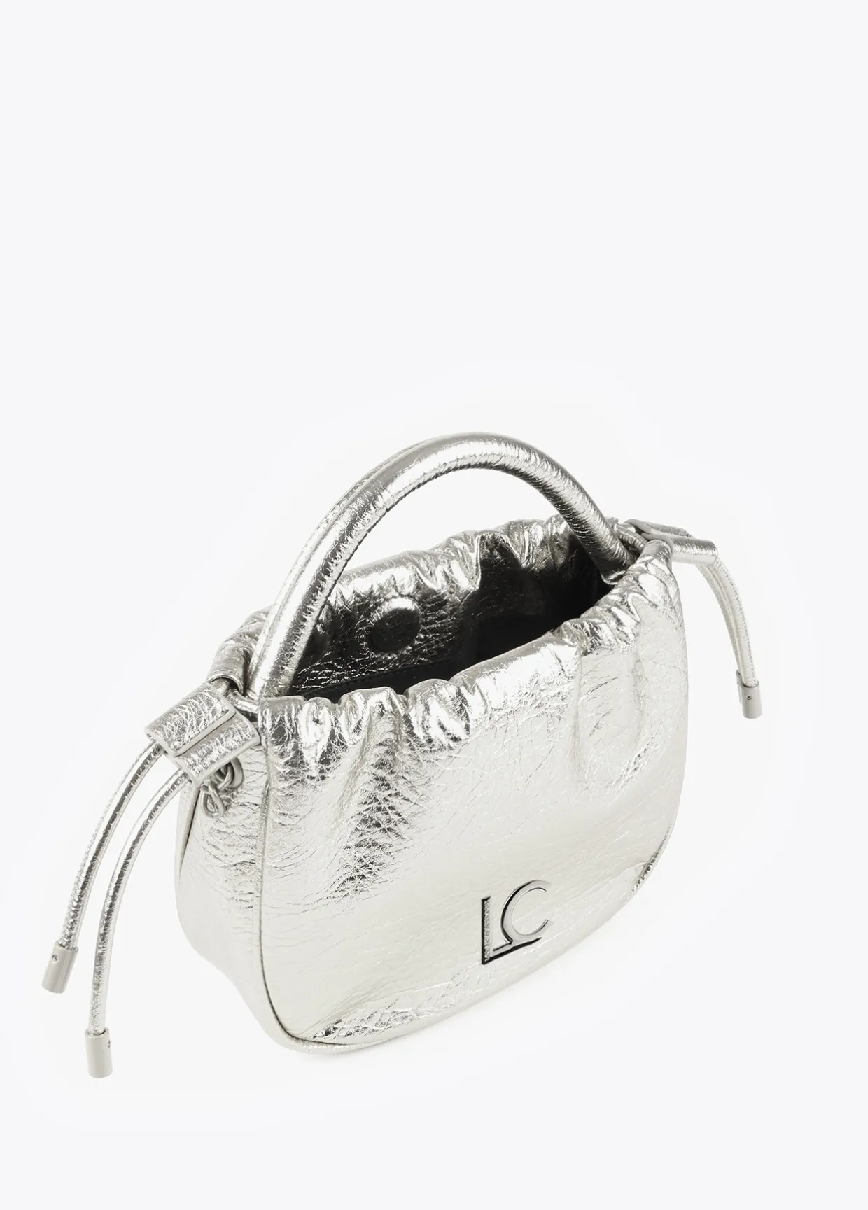 Bolso bandolera en efecto piel con logo en parte frontal. Cierre de cordón fruncido y botón imantado. Asa de mano y asa bandolera ajustable y extraible.