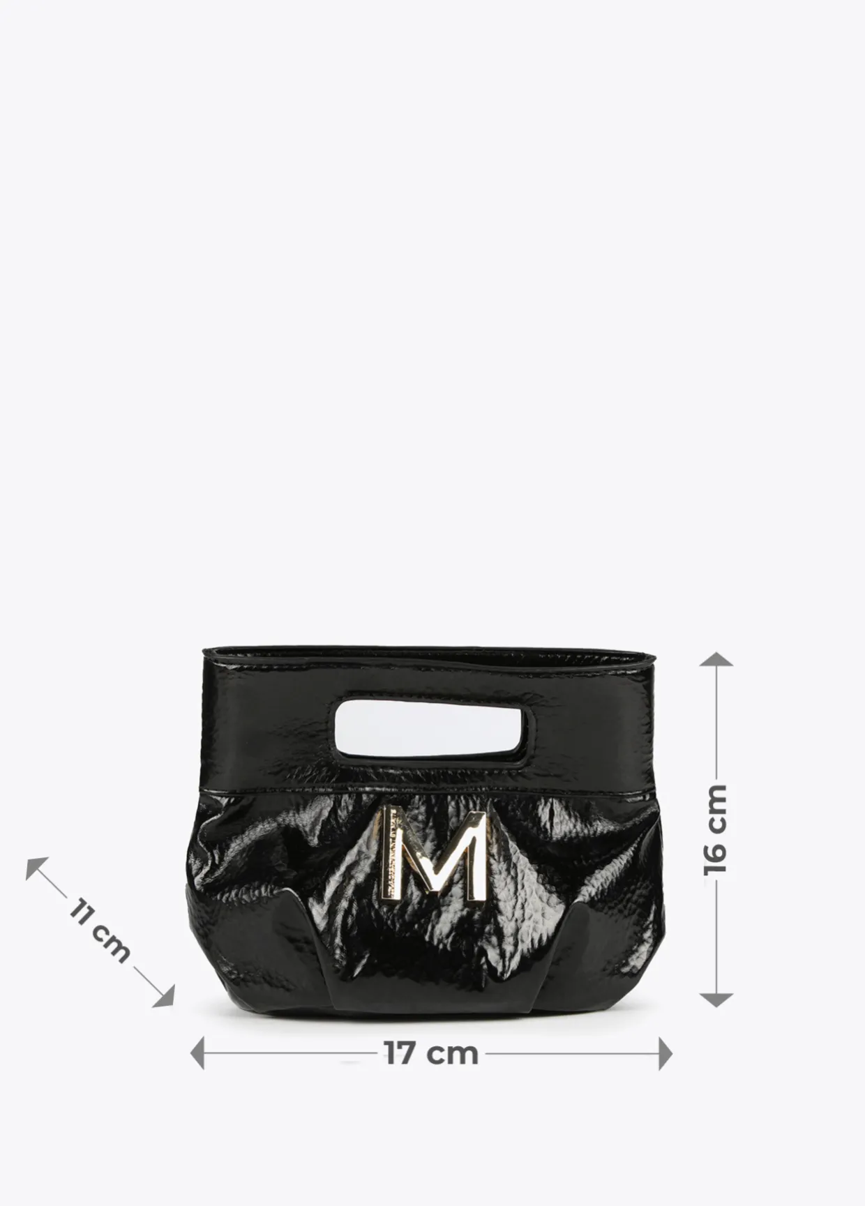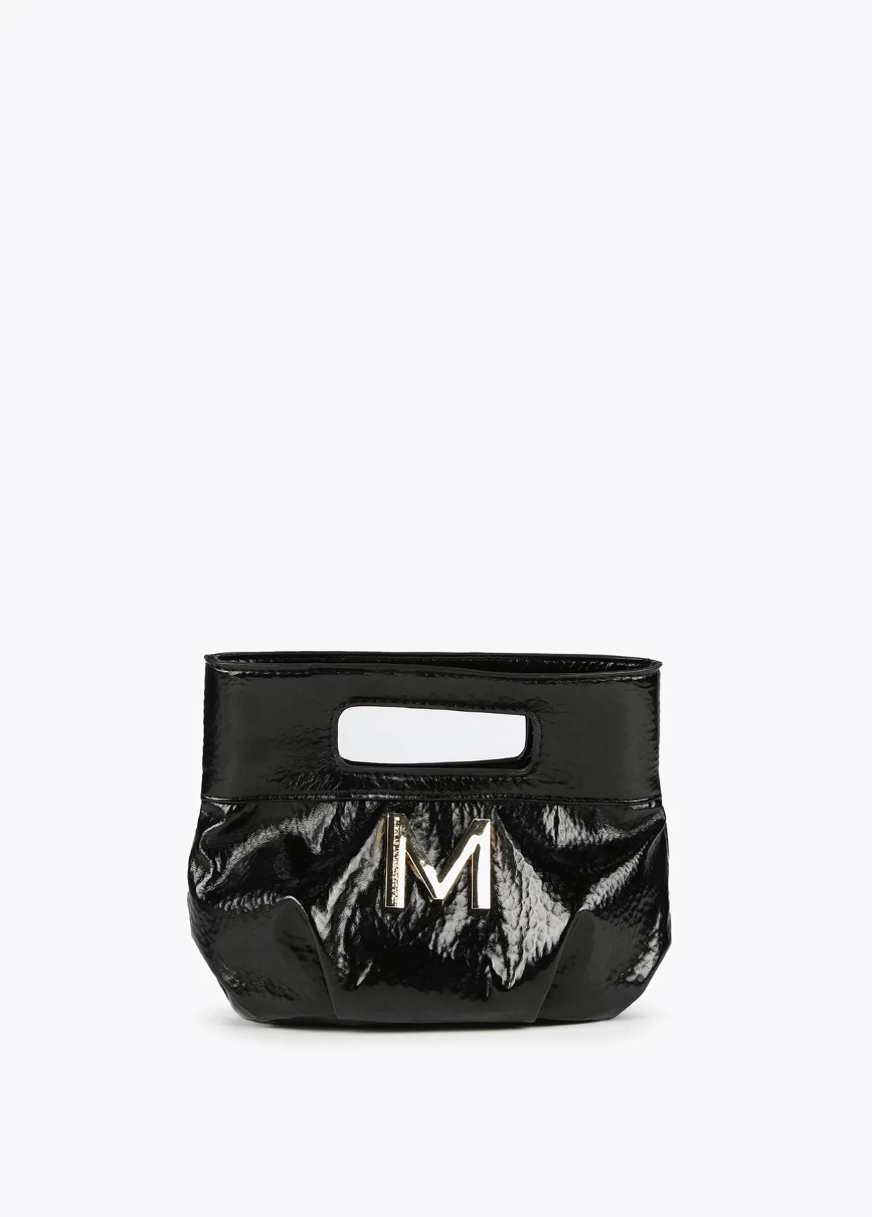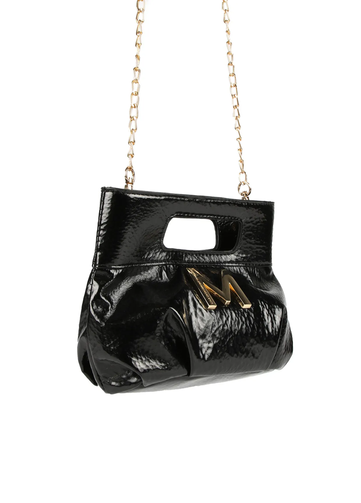 Bolsito bandolera con frunces y material brillante con asa de mano fija y asa bandolera dorada y extraible. Detalle letra logo dorado en parte frontal y cierre con botón imantado.