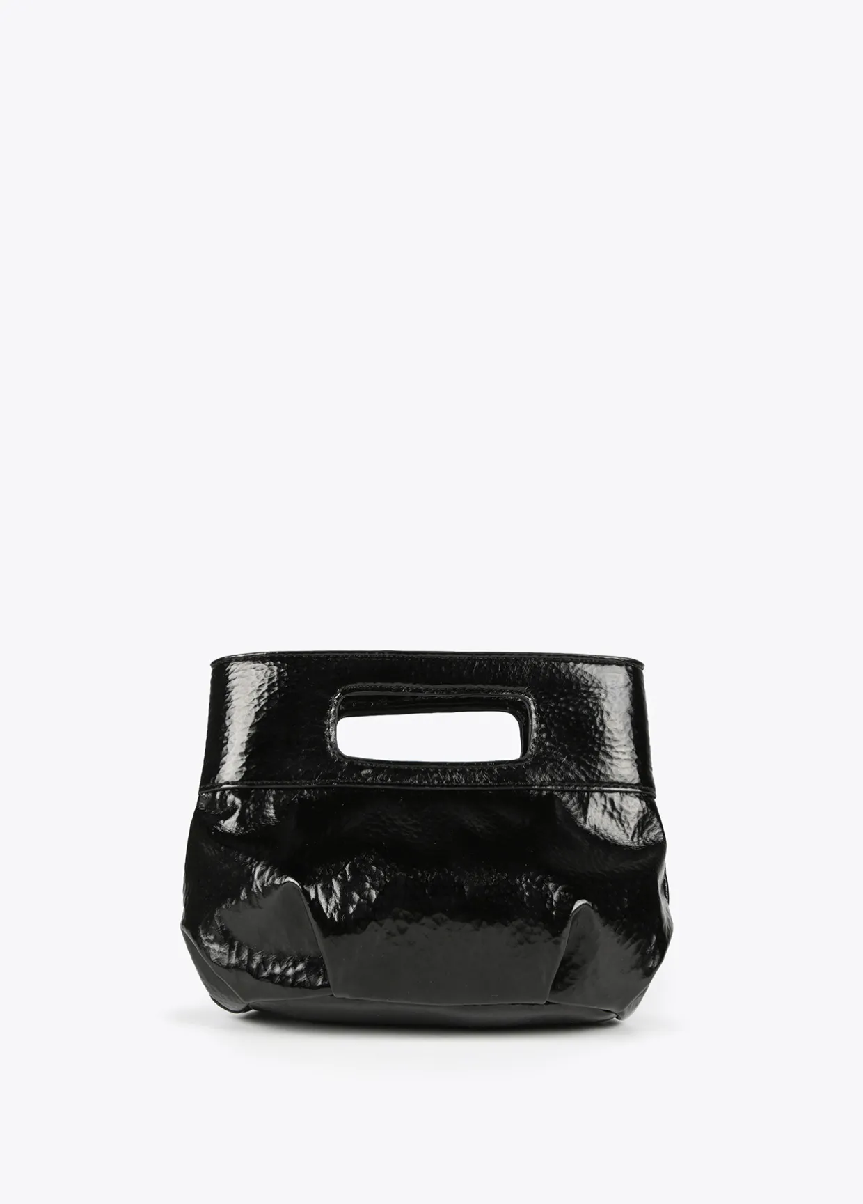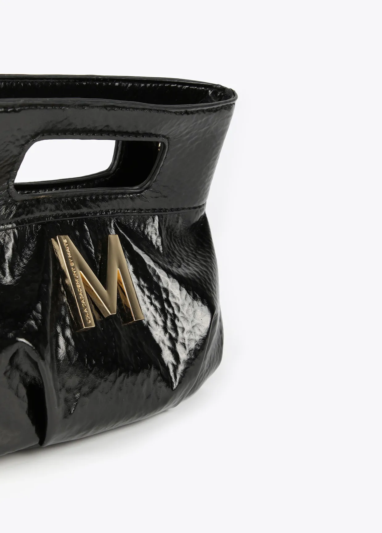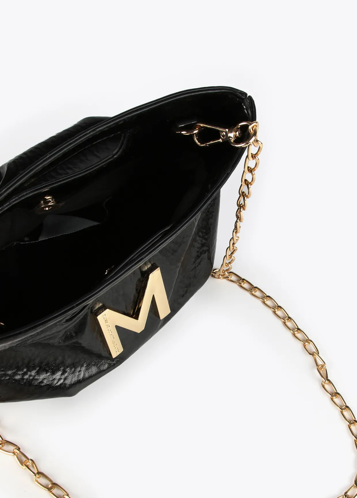 Bolsito bandolera con frunces y material brillante con asa de mano fija y asa bandolera dorada y extraible. Detalle letra logo dorado en parte frontal y cierre con botón imantado.