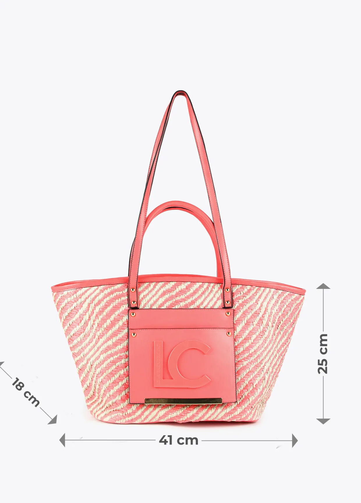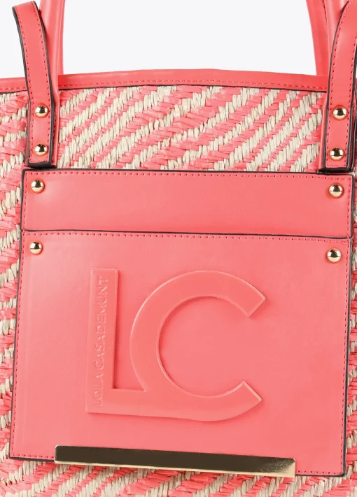 Bolso shopper tipo cesta en efecto ráfia y efecto piel combinados. Mega logo en parte frontal. Asas de mano y asas bandolera/hombro. Bolsito interior con cierre de cremallera.