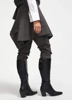 Bota negra de caña alta estilo cowboy con tacón. Cierre con cremallera en parte interior. Detalle letras logo doradas.