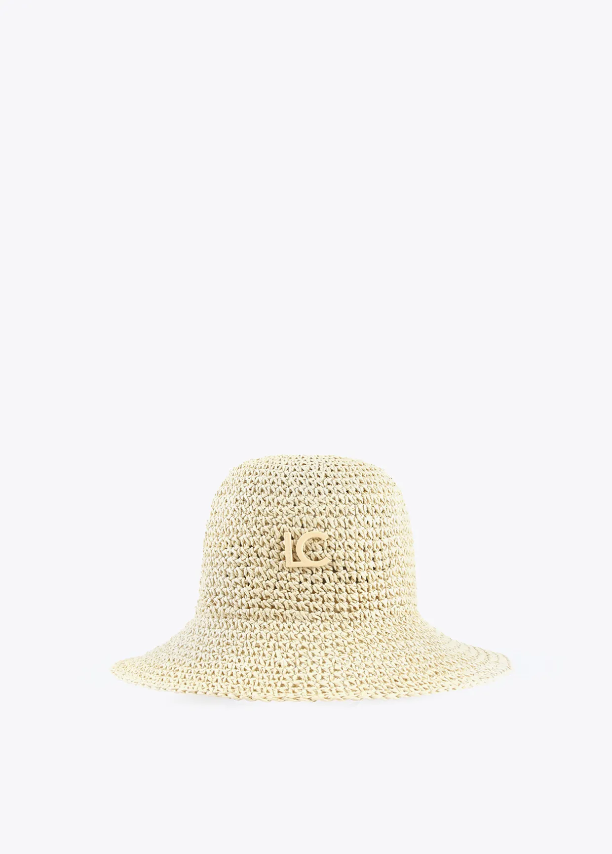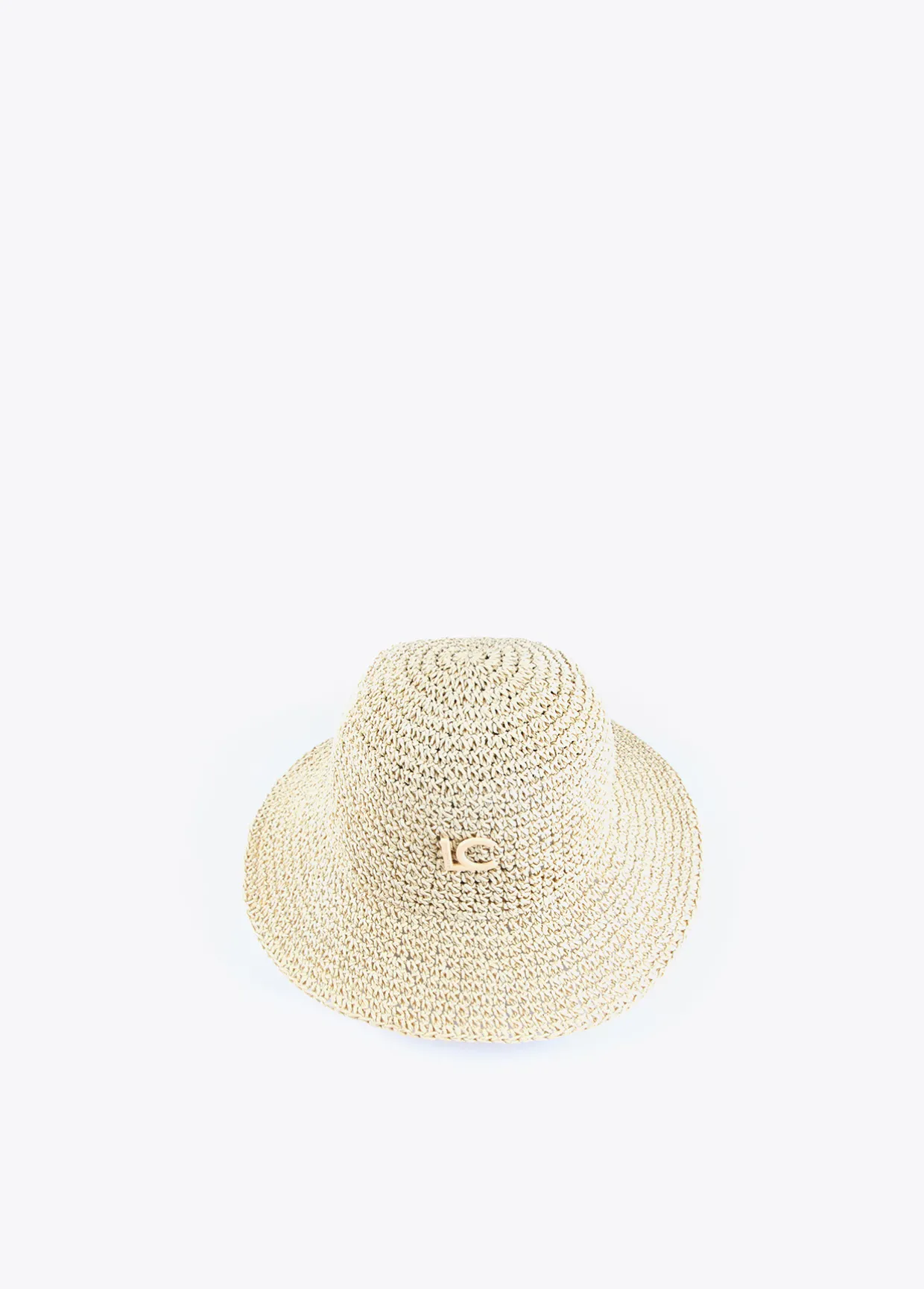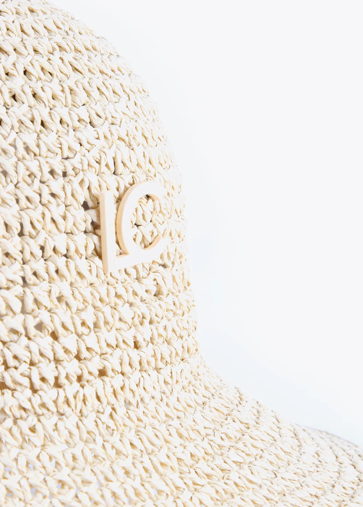Sombrero tipo bucket en efecto ráfia y crochet con letras logo lacadas en zona frontal.