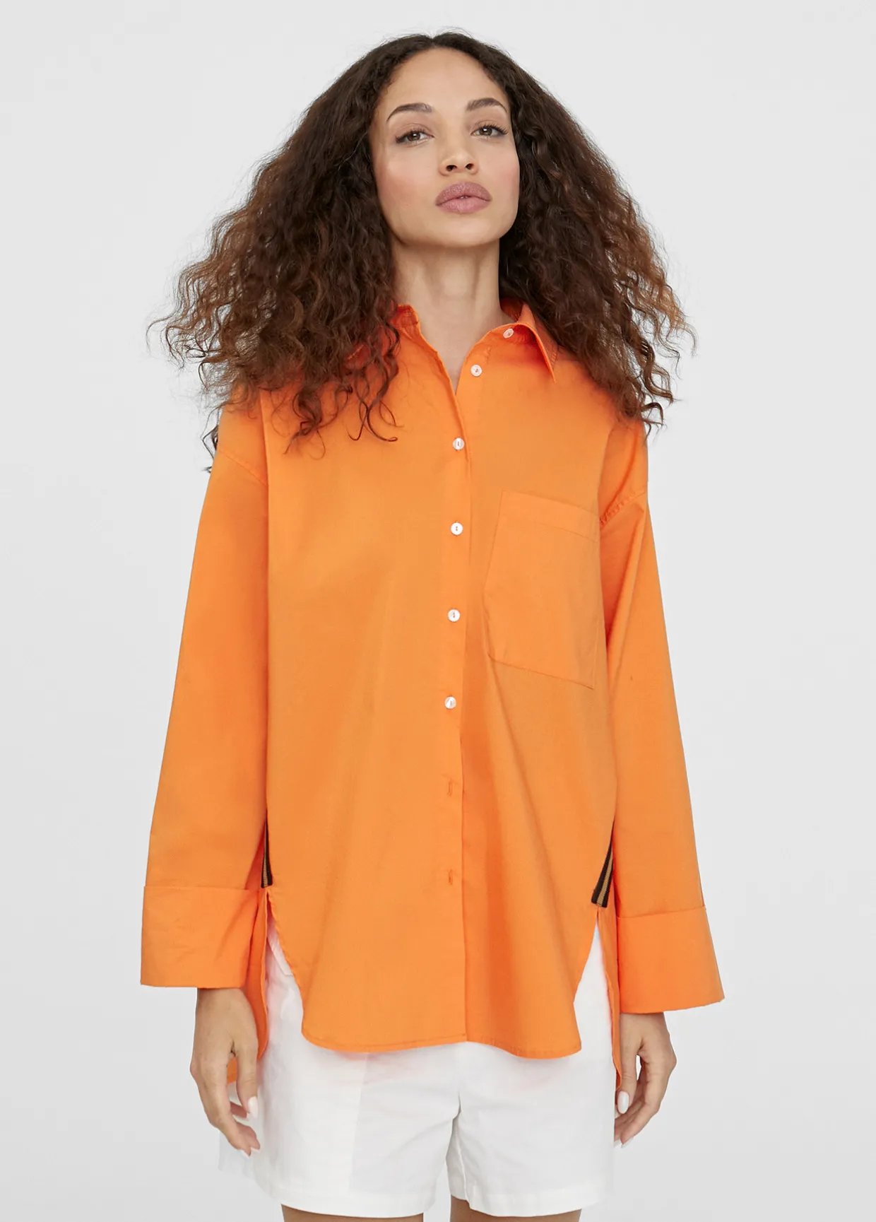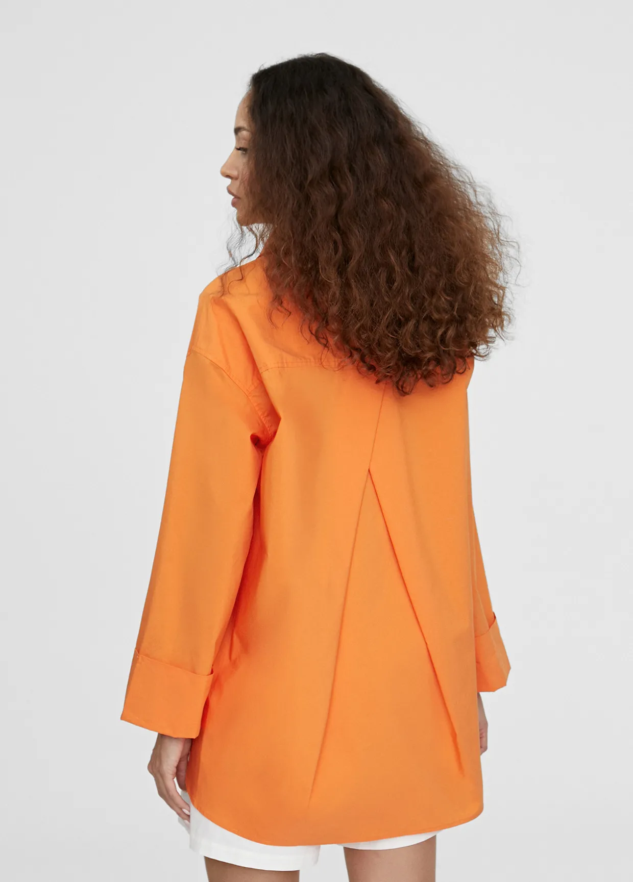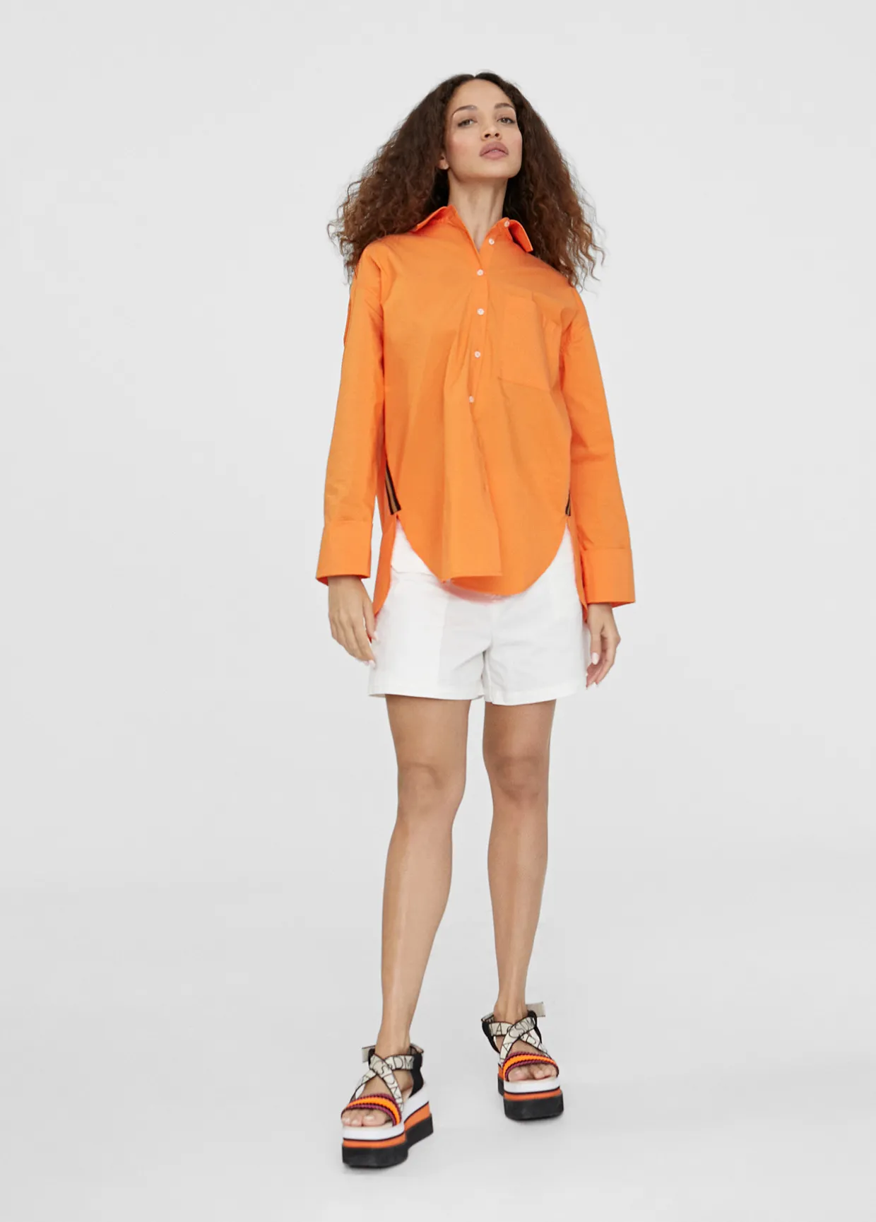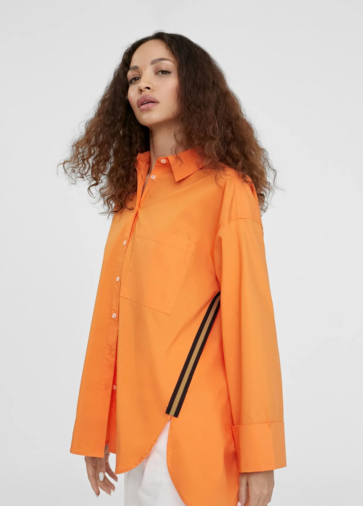Camisa amplia de cuello y puños camiseros. Único bolsillo plastrón en pecho. Banda lateral bicolor con aberturas.
