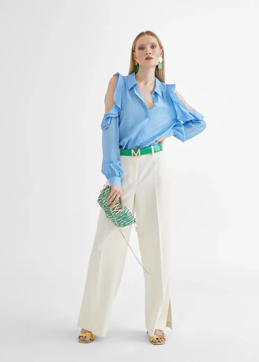 Blusa fluida con manga de volantes y hombros descubiertos. Cuello y puños camisero y cierre con botones a tono.