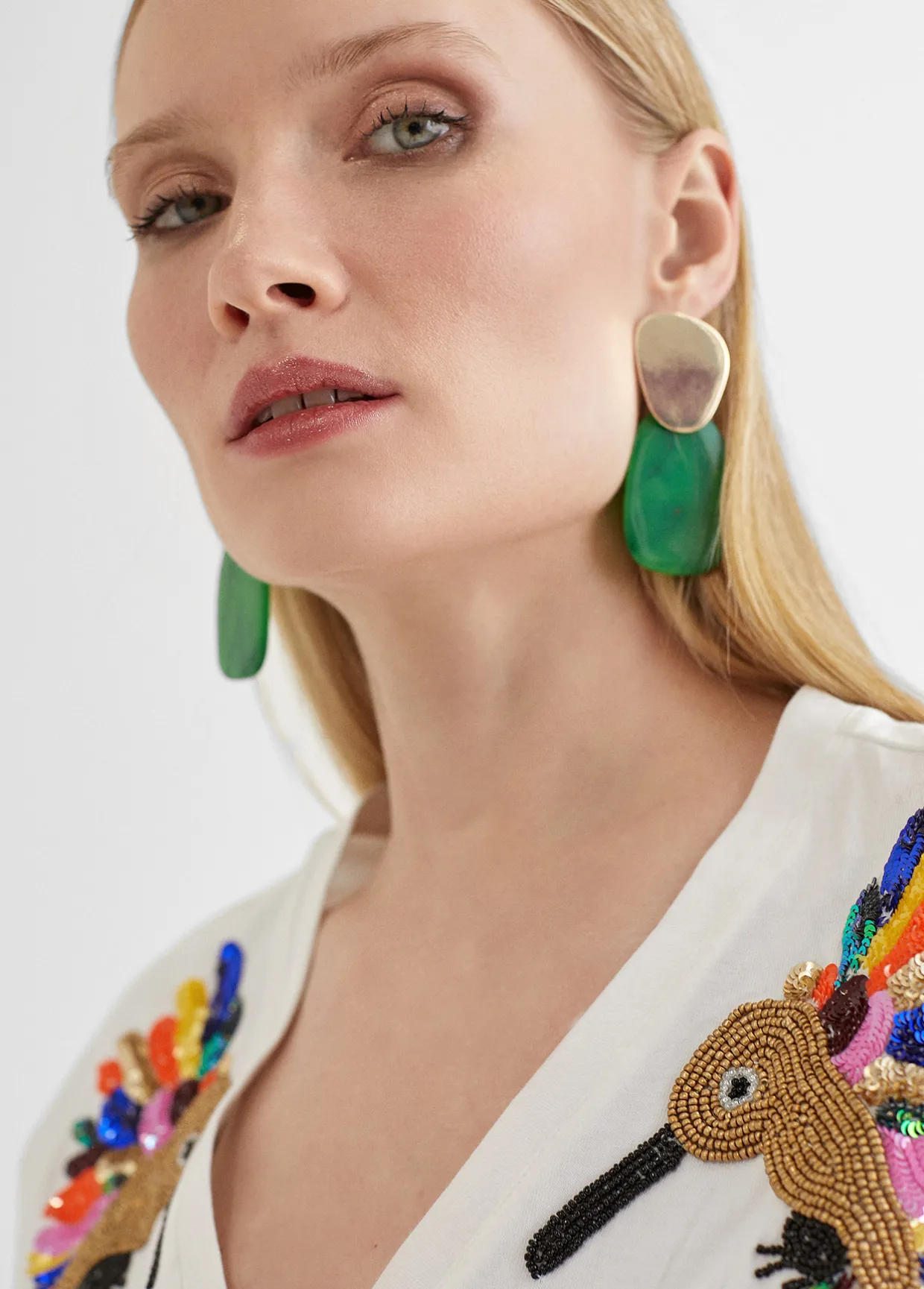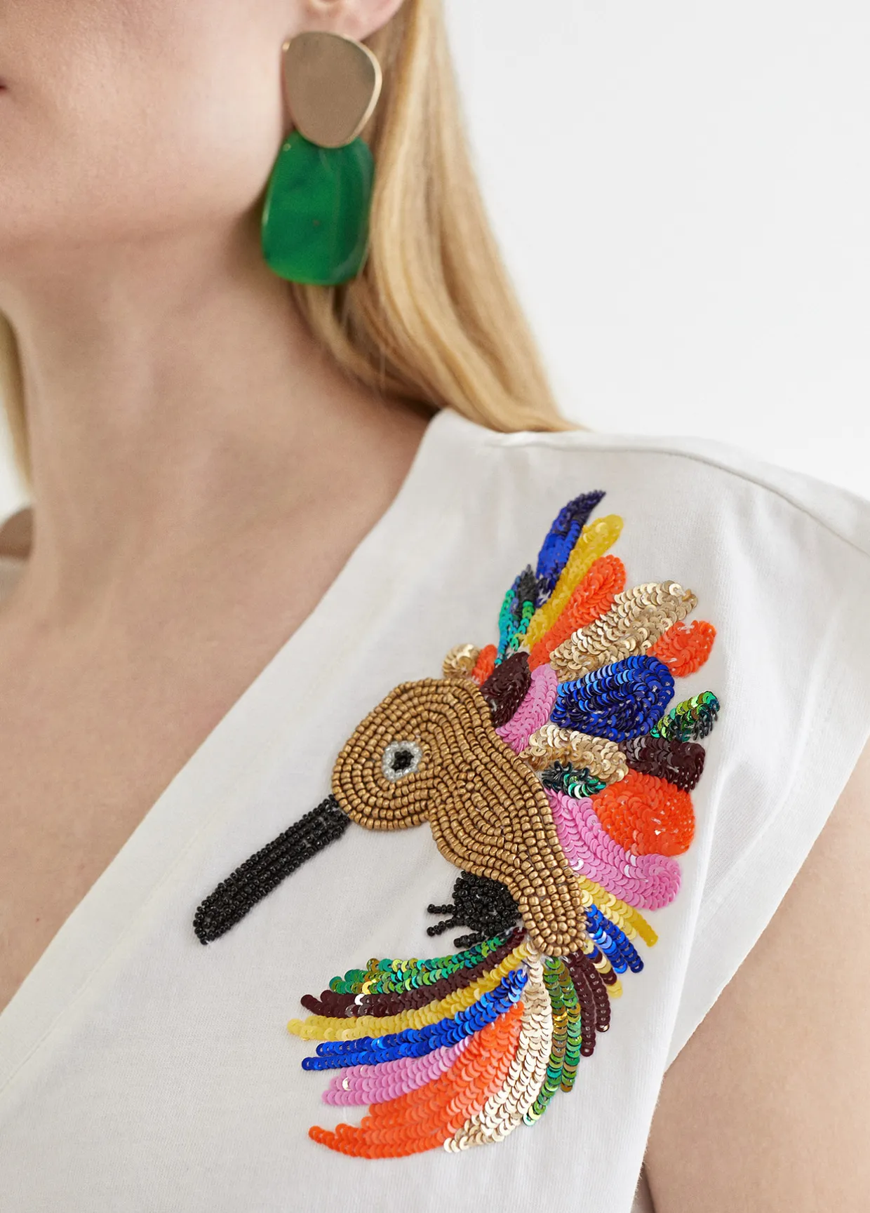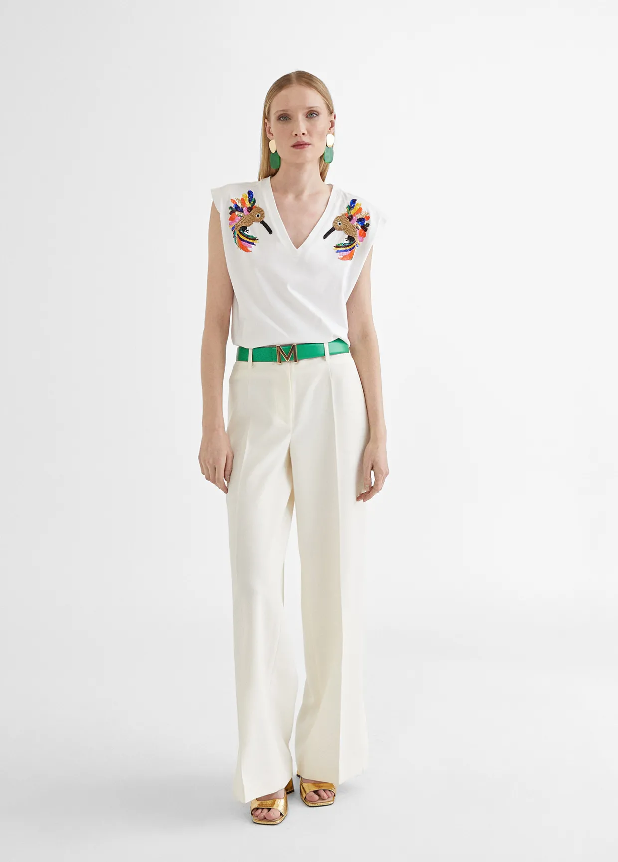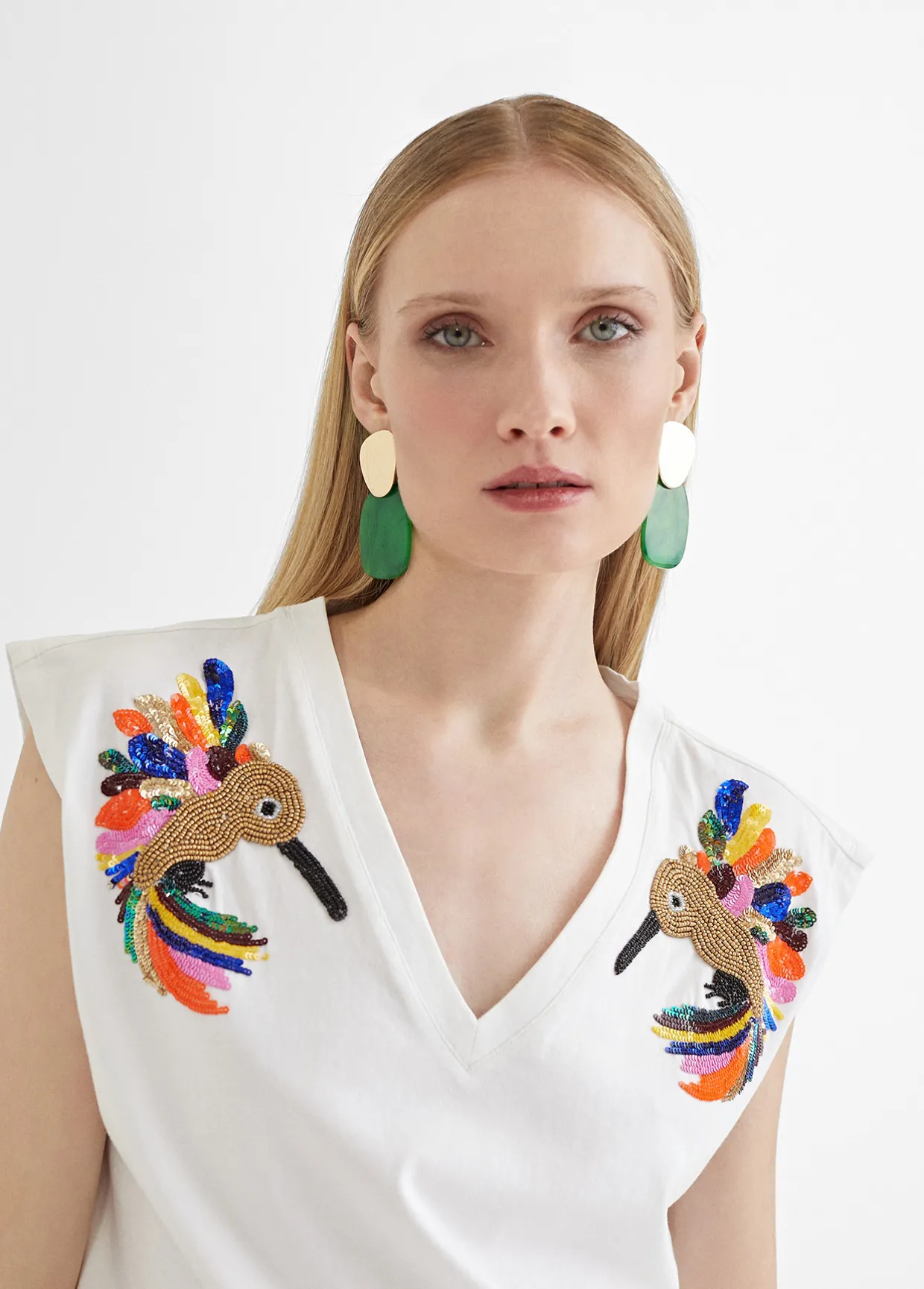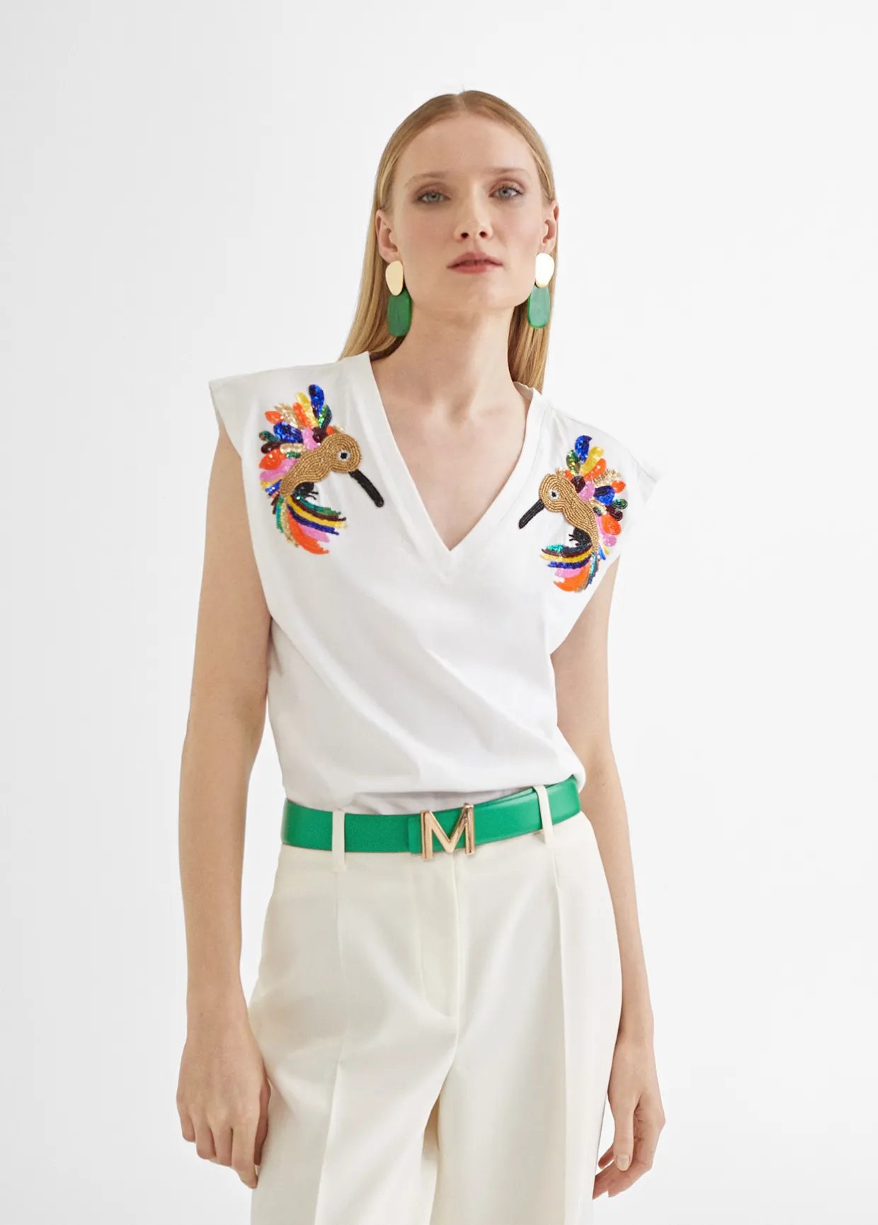Camiseta de algodón blanca con detalle multicolor en zona hombro frontal.