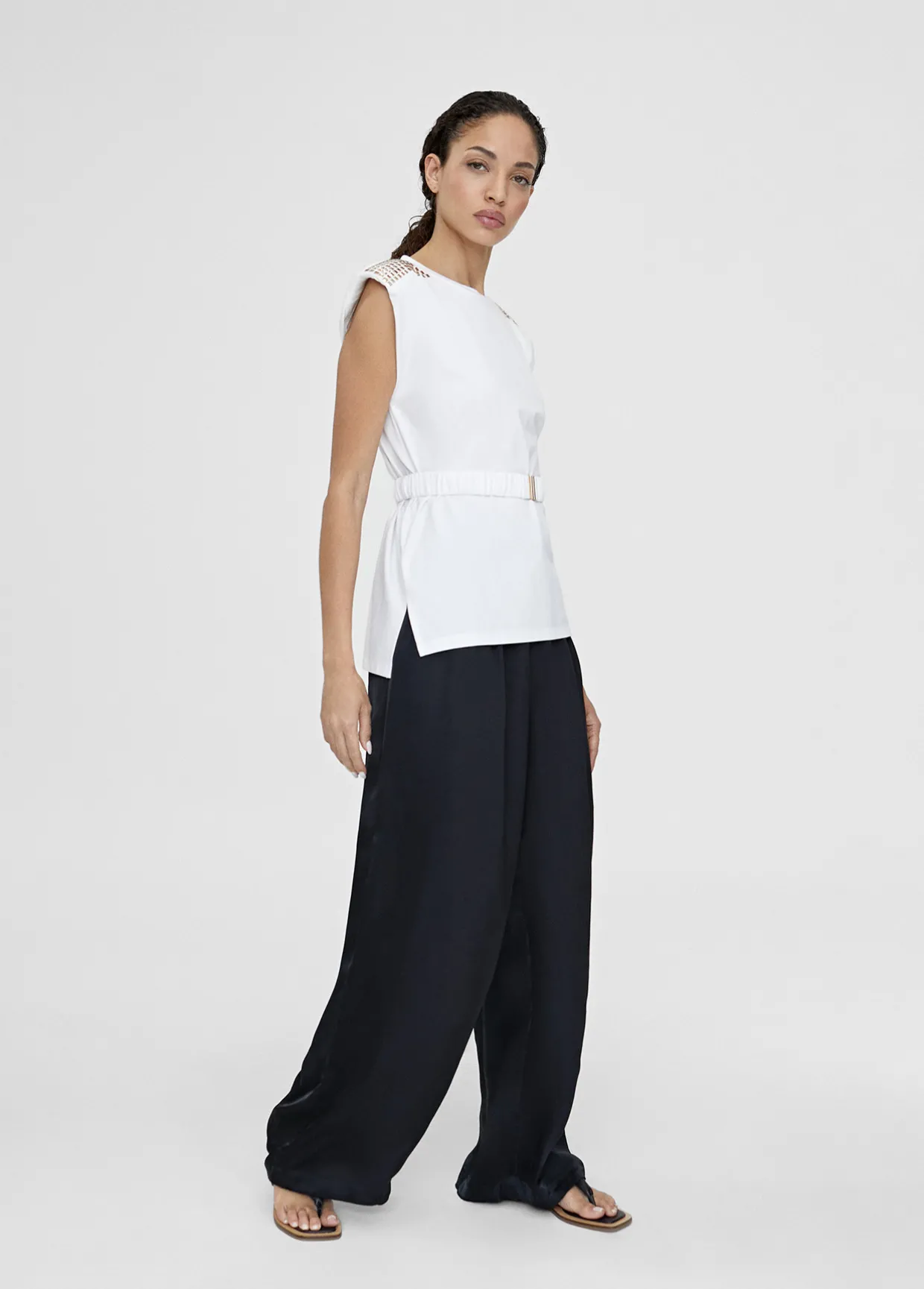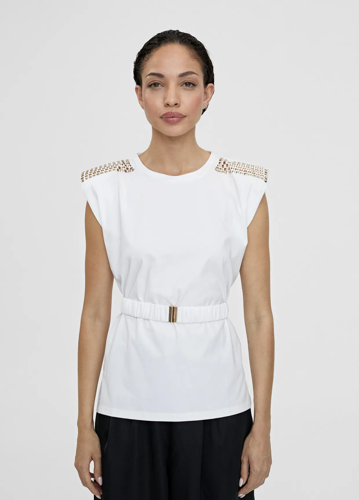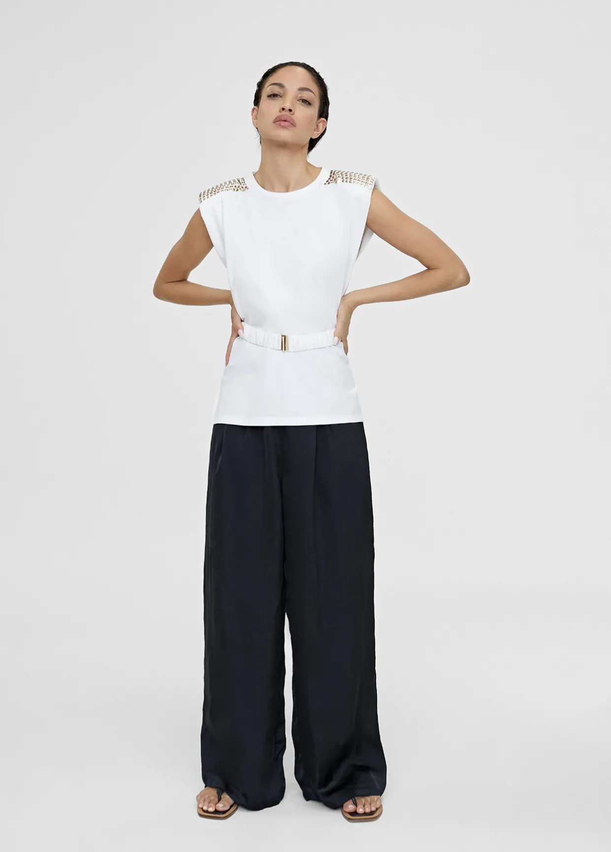 Camiseta cuello caja con manga sisa y hombreras con piezas doradas. Cinturón elástico del mismo tejido y color con hebilla metálica.