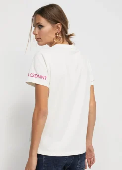 Camiseta de manga corta y cuello caja. Posicionado en frontal y manga a contraste.