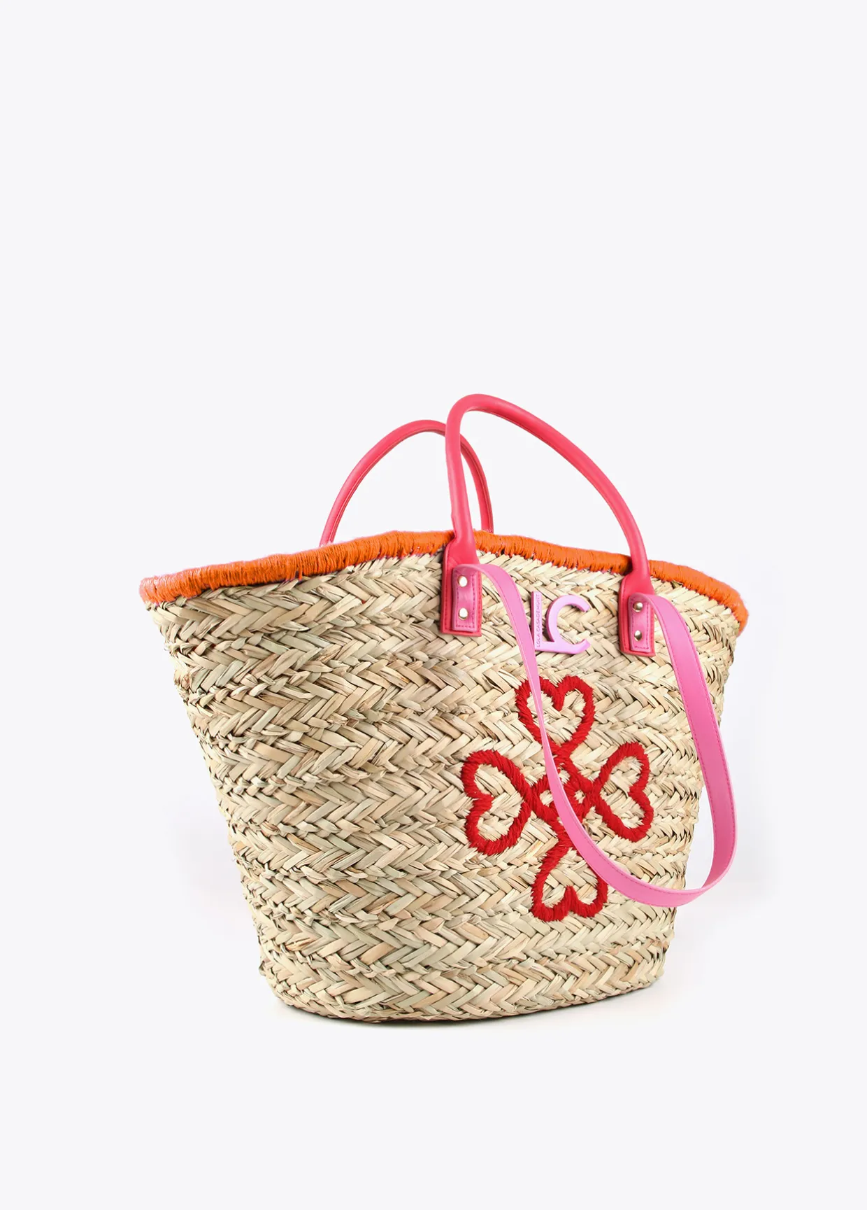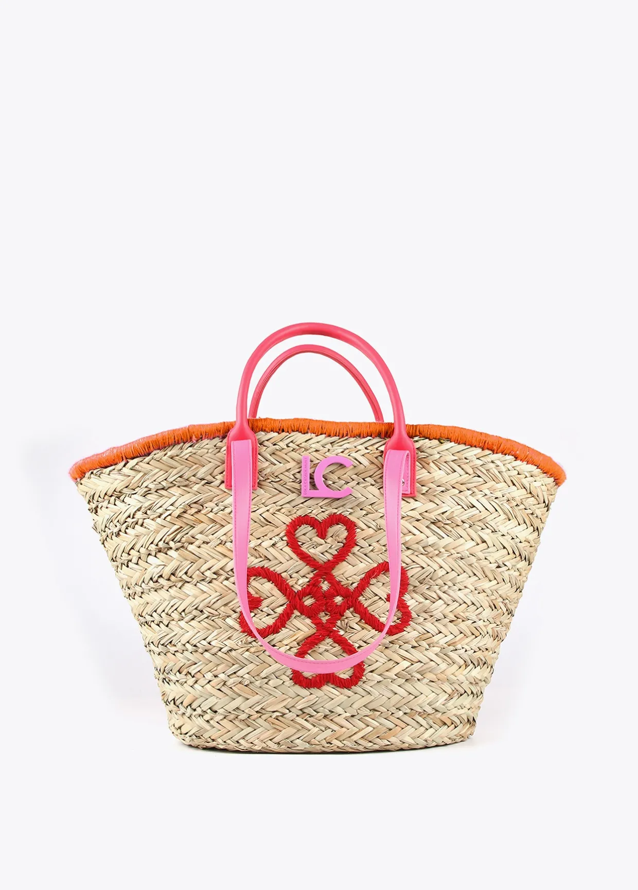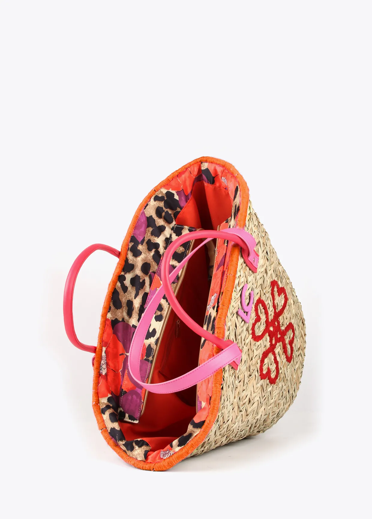 Capazo tipo cesta con bordado de corazones en parte frontal. Asas de mano y asas de hombro en efecto piel. Bolsa interior protectora estampada con cierre de cremallera.