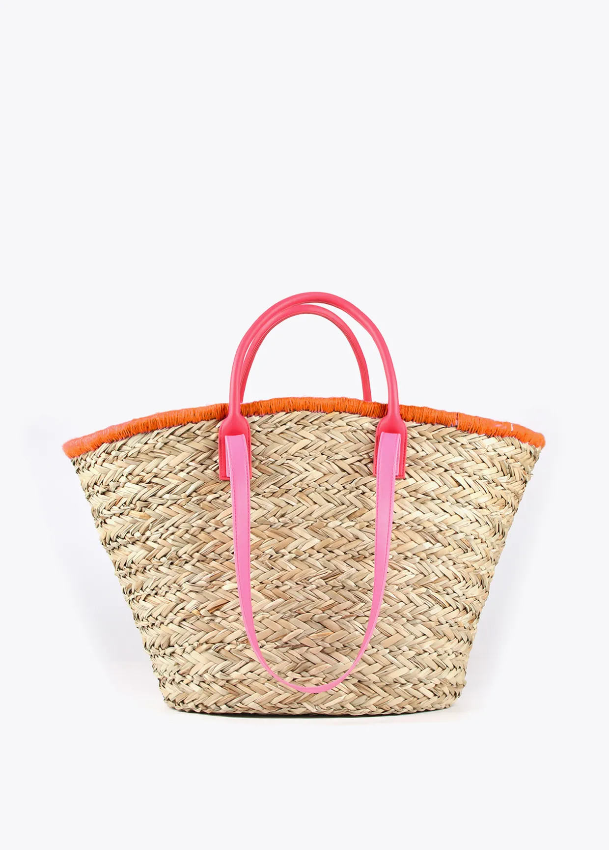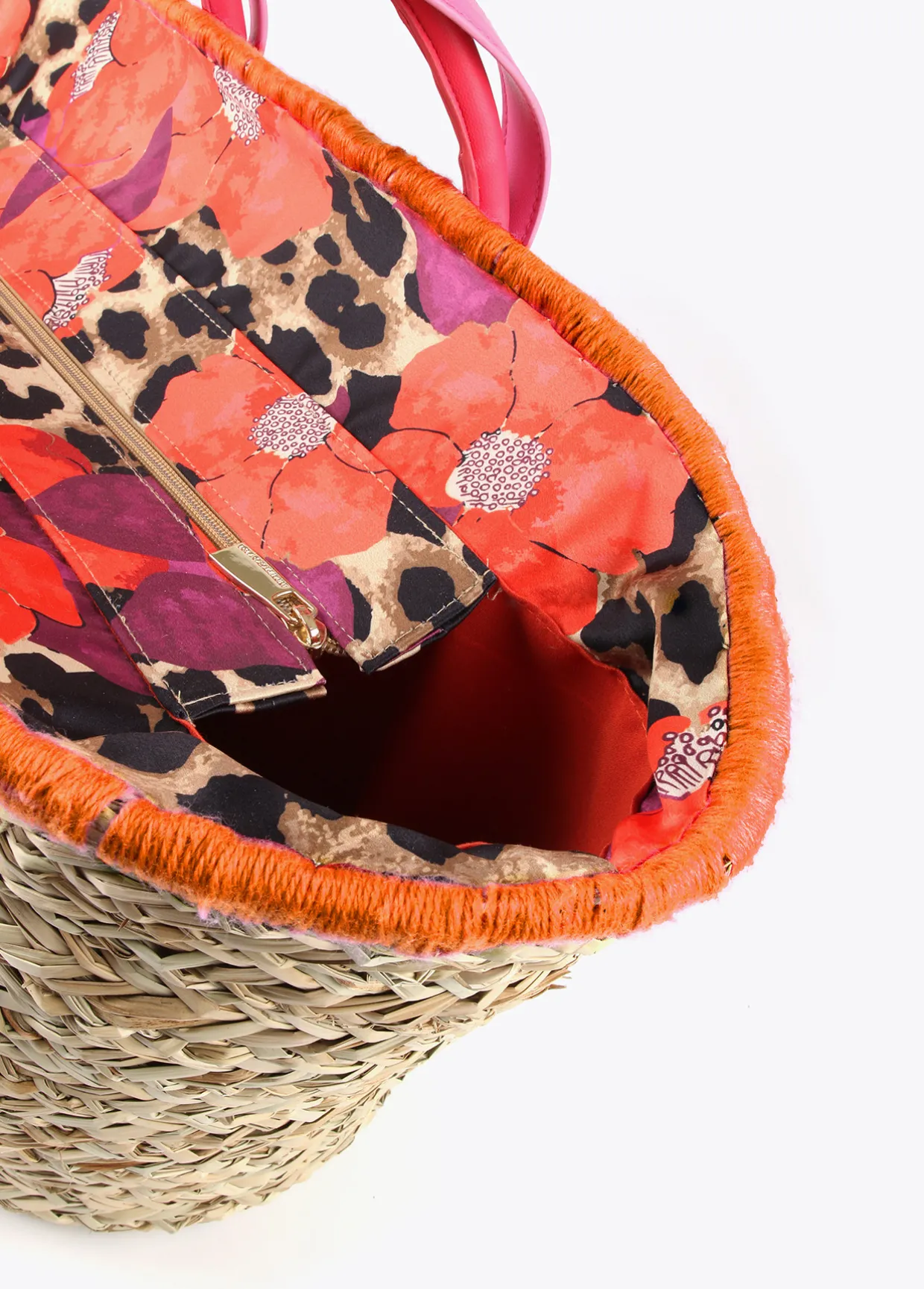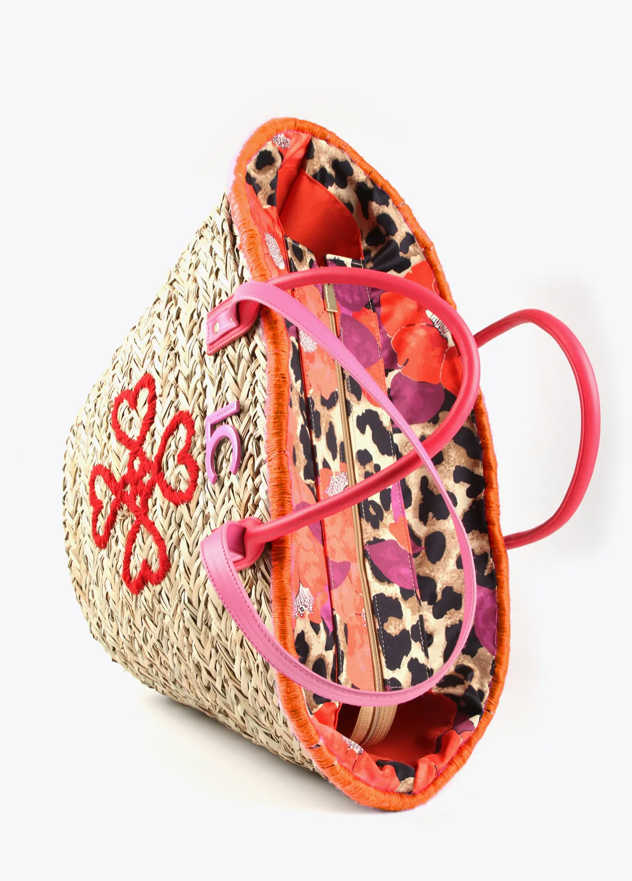 Capazo tipo cesta con bordado de corazones en parte frontal. Asas de mano y asas de hombro en efecto piel. Bolsa interior protectora estampada con cierre de cremallera.