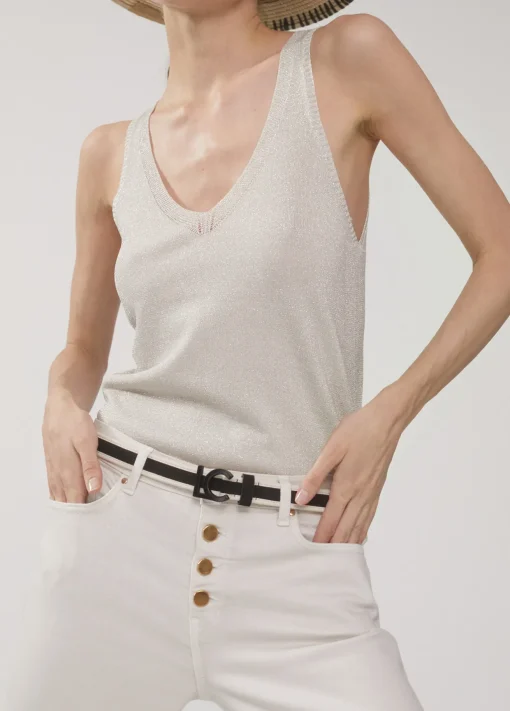 Cinturón fino en canvas y efecto piel combinados. Cierre con logo lacado.
