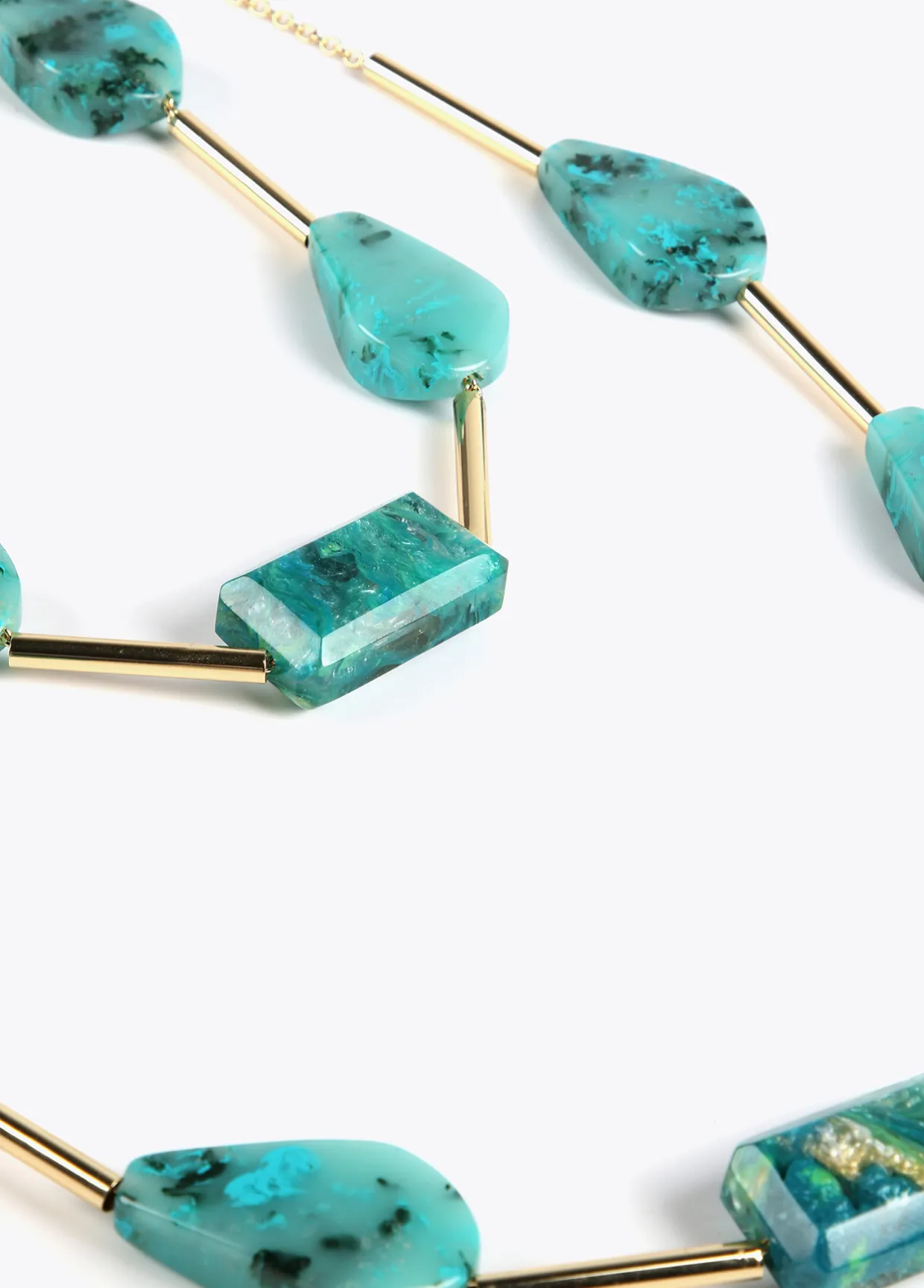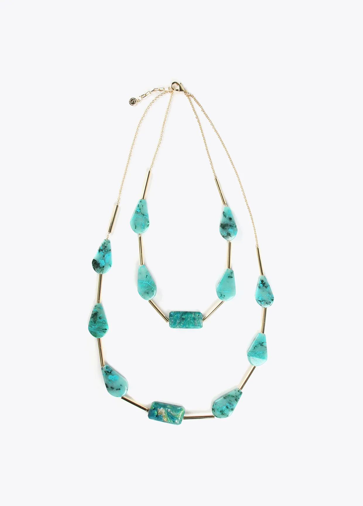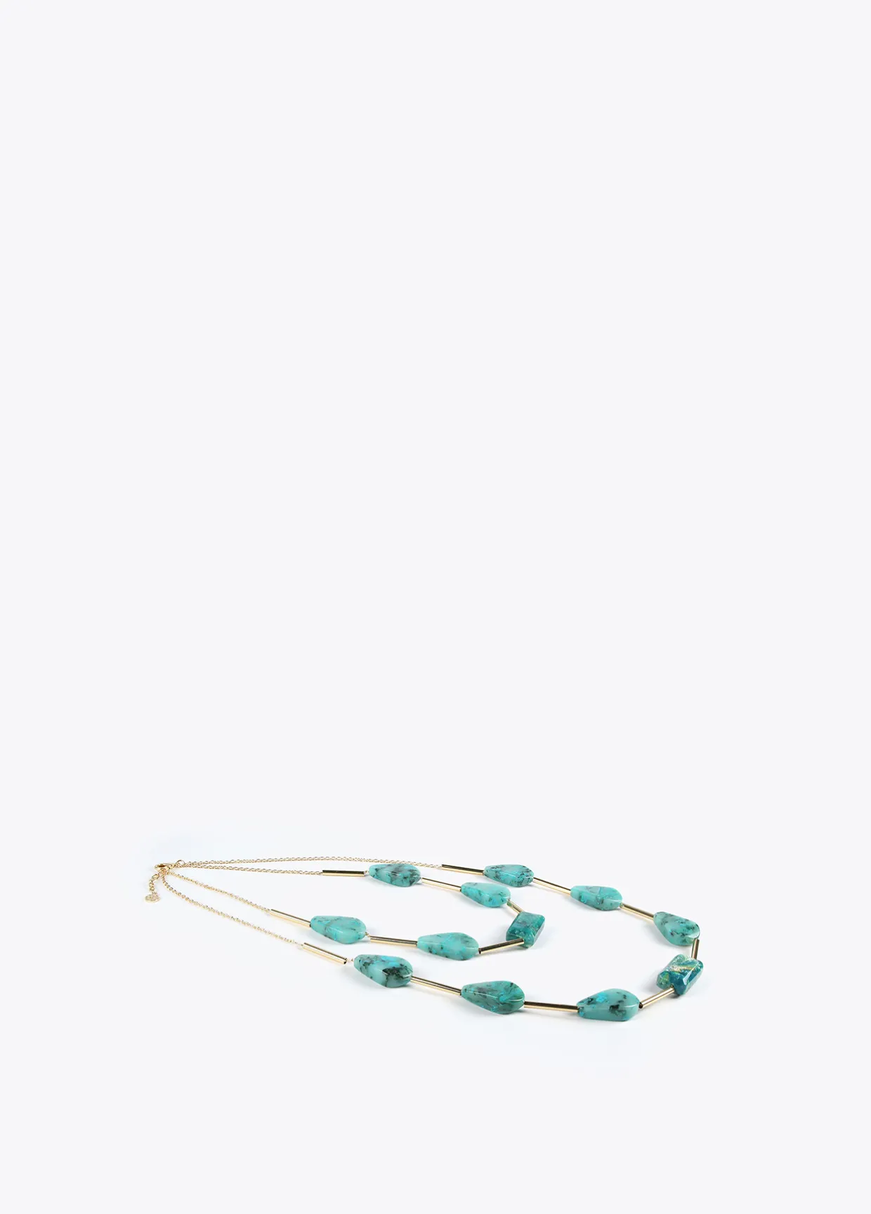 Collar doble con maxi piezas en color turquesa combinadas con detalles dorados. Cierre ajustable y medallita logotipada.