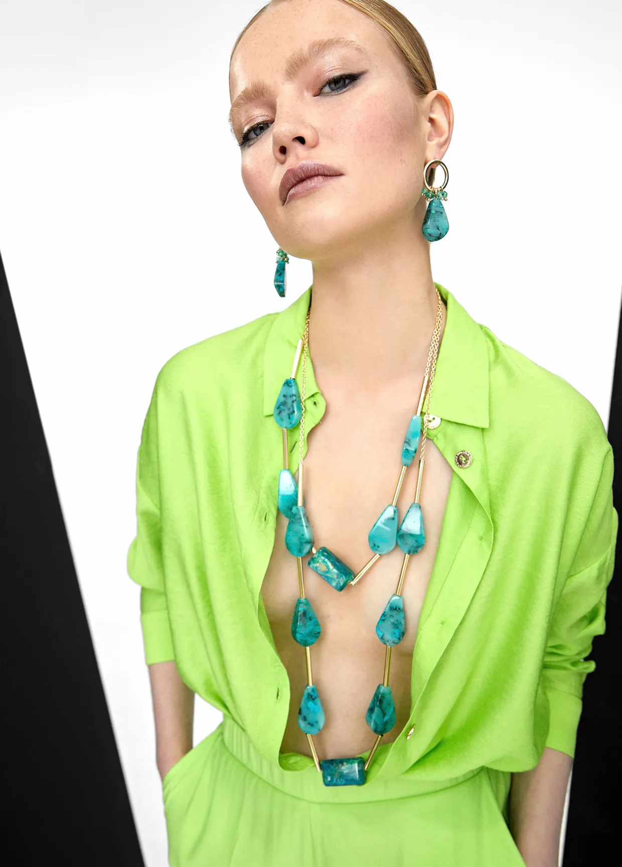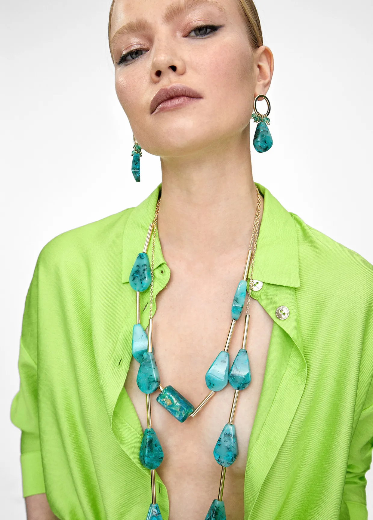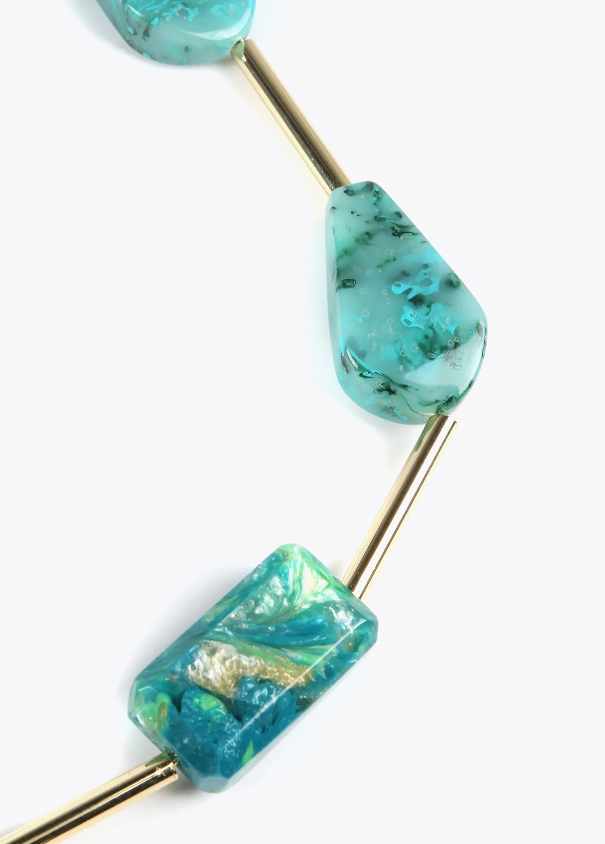 Collar doble con maxi piezas en color turquesa combinadas con detalles dorados. Cierre ajustable y medallita logotipada.