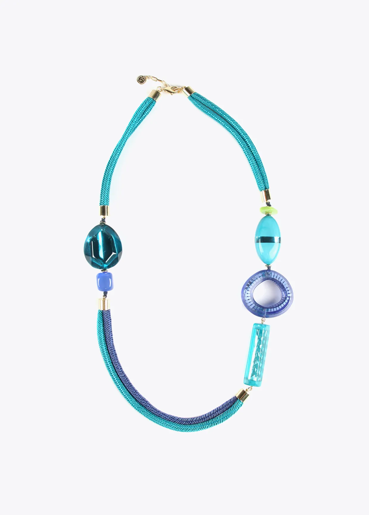 Collar largo con maxi cordóin bicolor y maxi piezas de diferentes colores. Cierre ajustable y medallita logotipada.