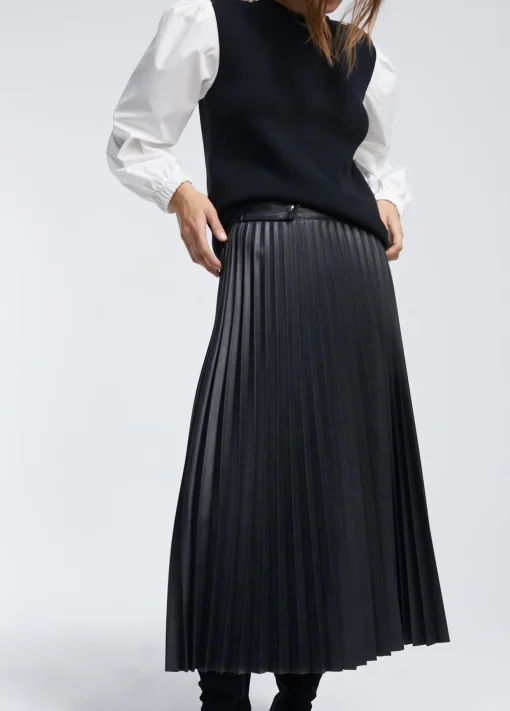 Falda de largo midi. Plisada en efecto piel. Detalle de botones metálicos en cinturilla.