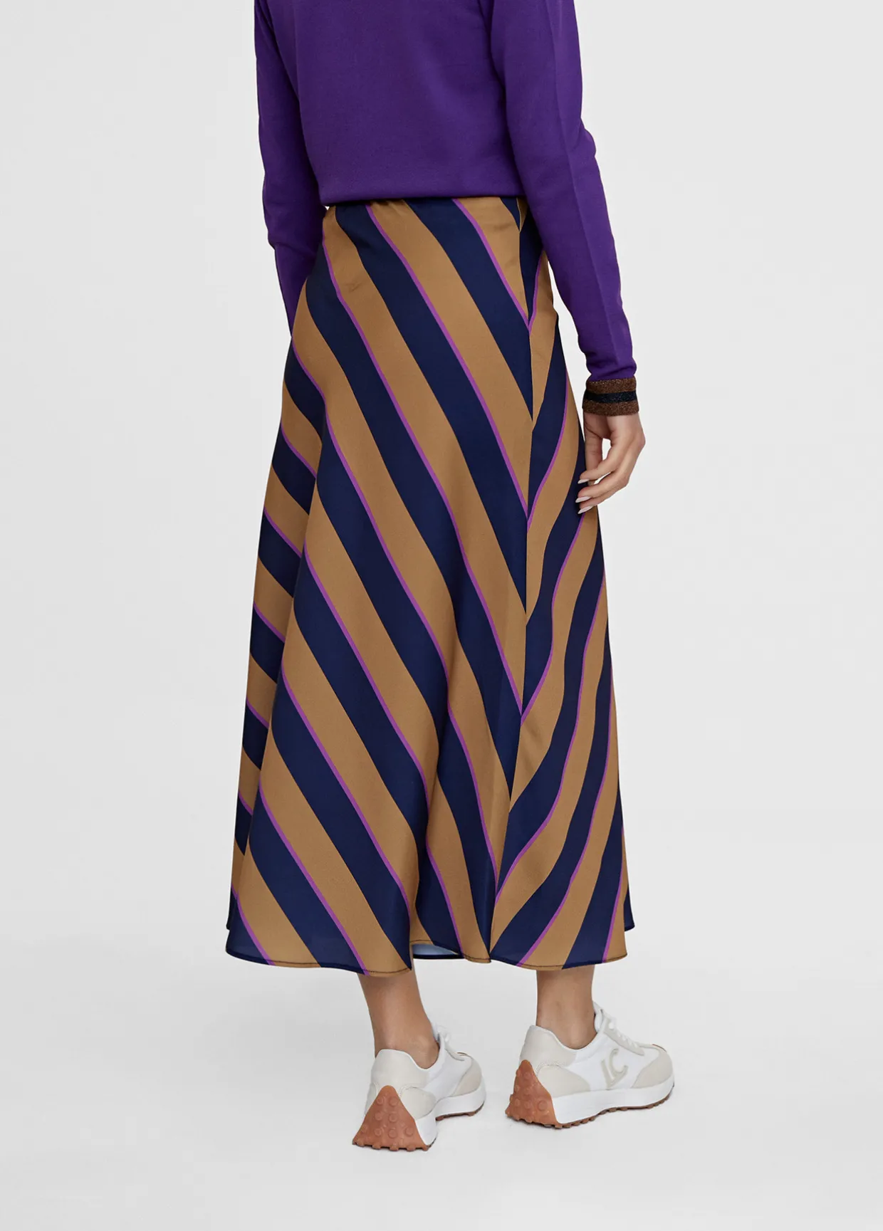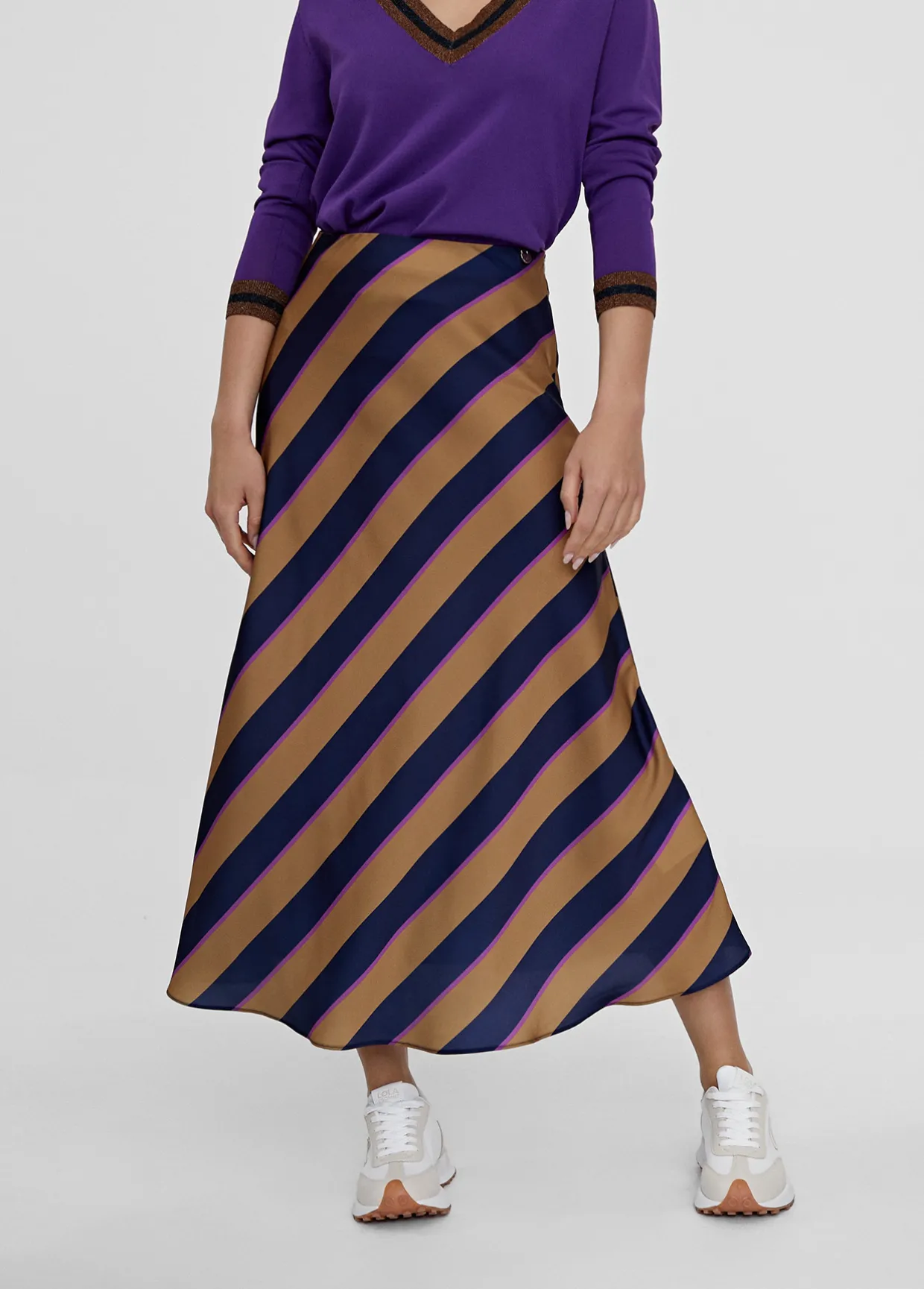 Falda de rayas en diagonal Tejido fluido. Cierre con cremallera lateral. Largo midi, evasé.