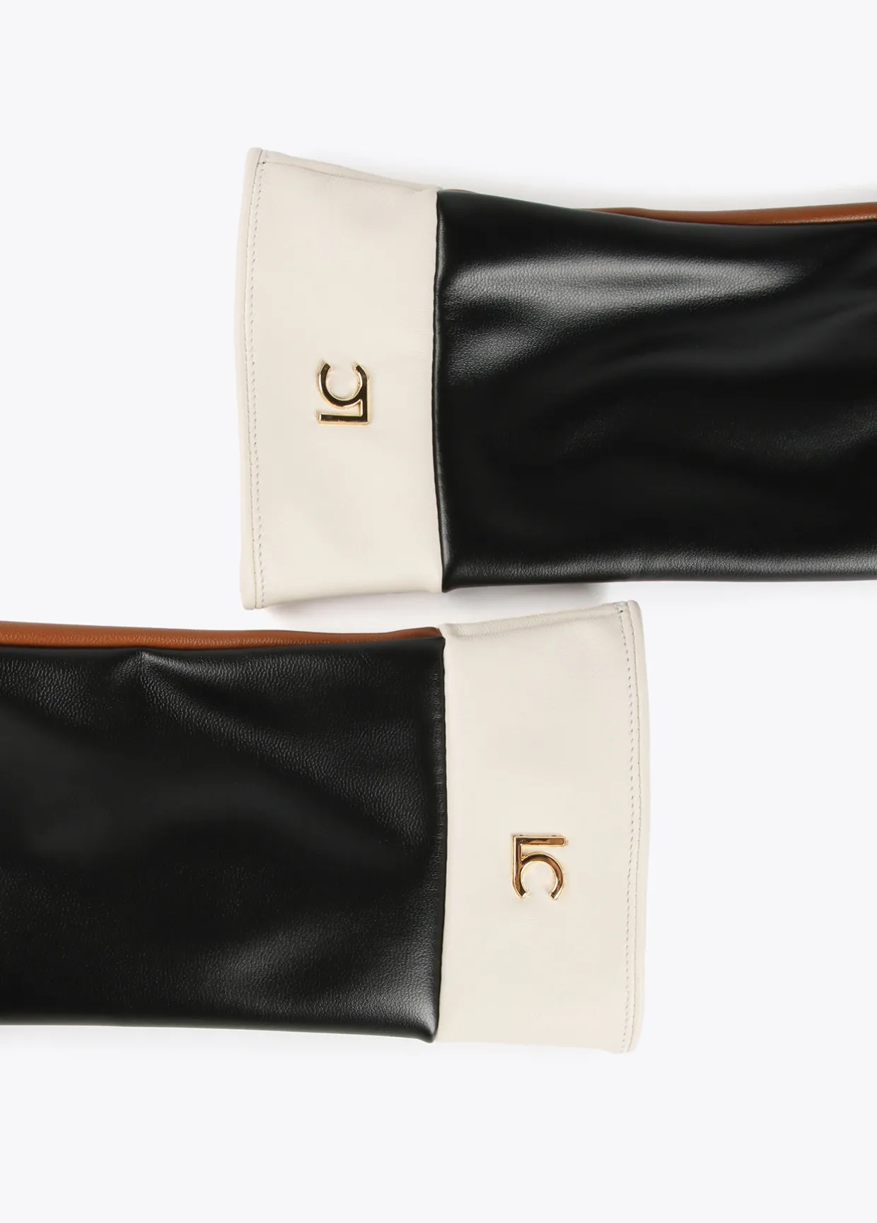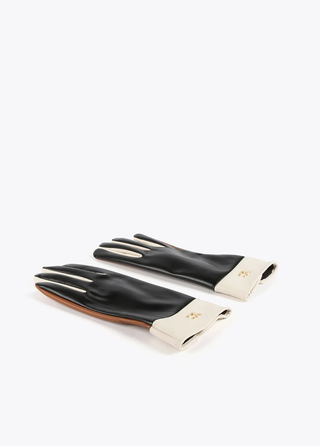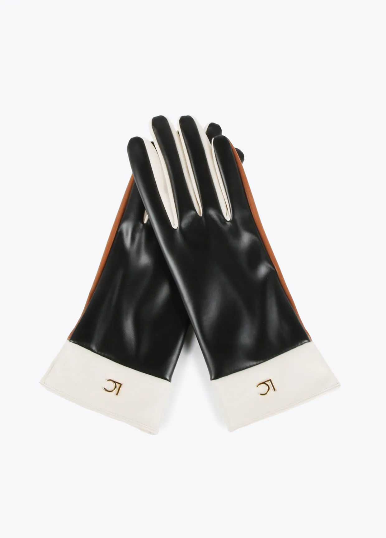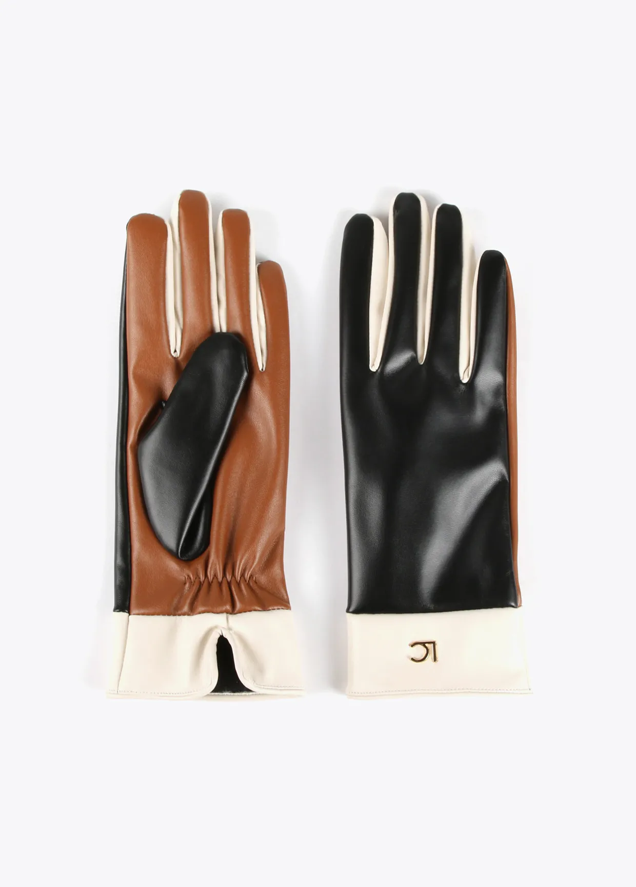 Guantes en efecto piel en tres colore combinados. Letra logo doradas en parte frontal.