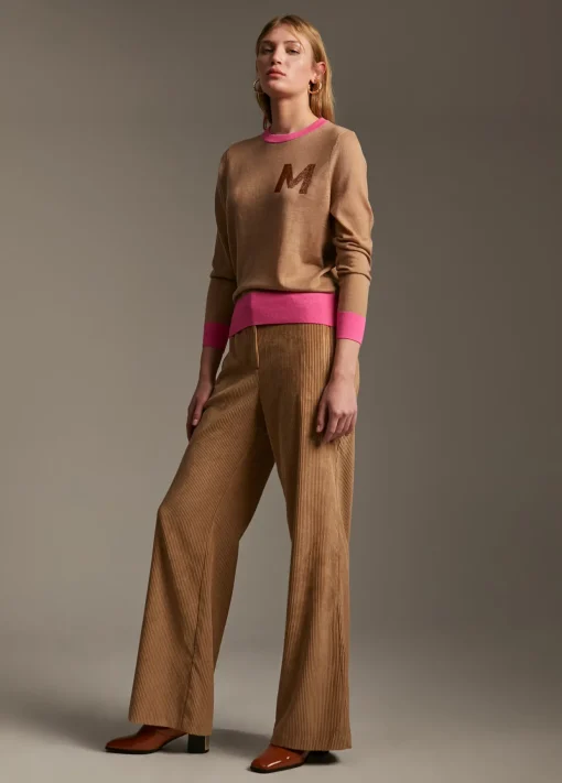 Jersey cuello caja y manga larga. Detalle de M en strass a tono en frontal. Rib de cuello, puños y bajo contrastado en otro color.