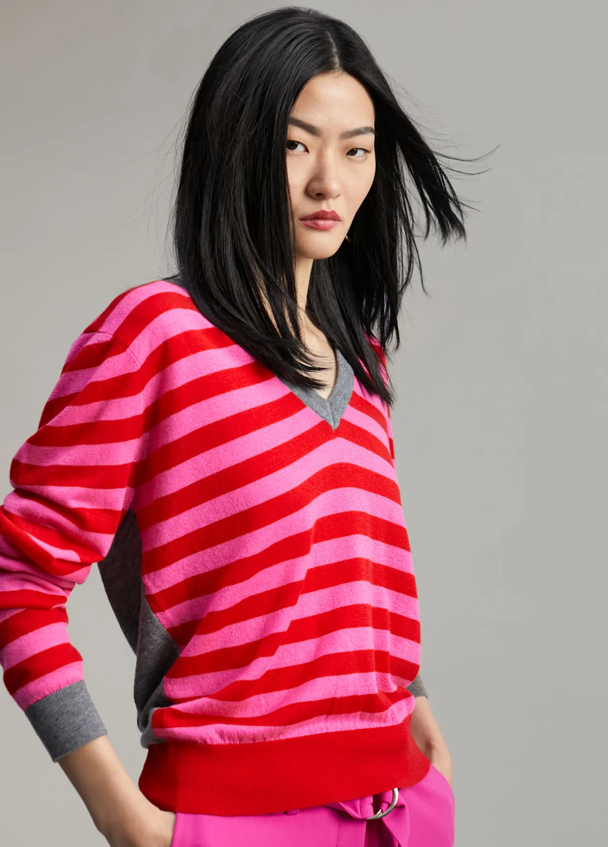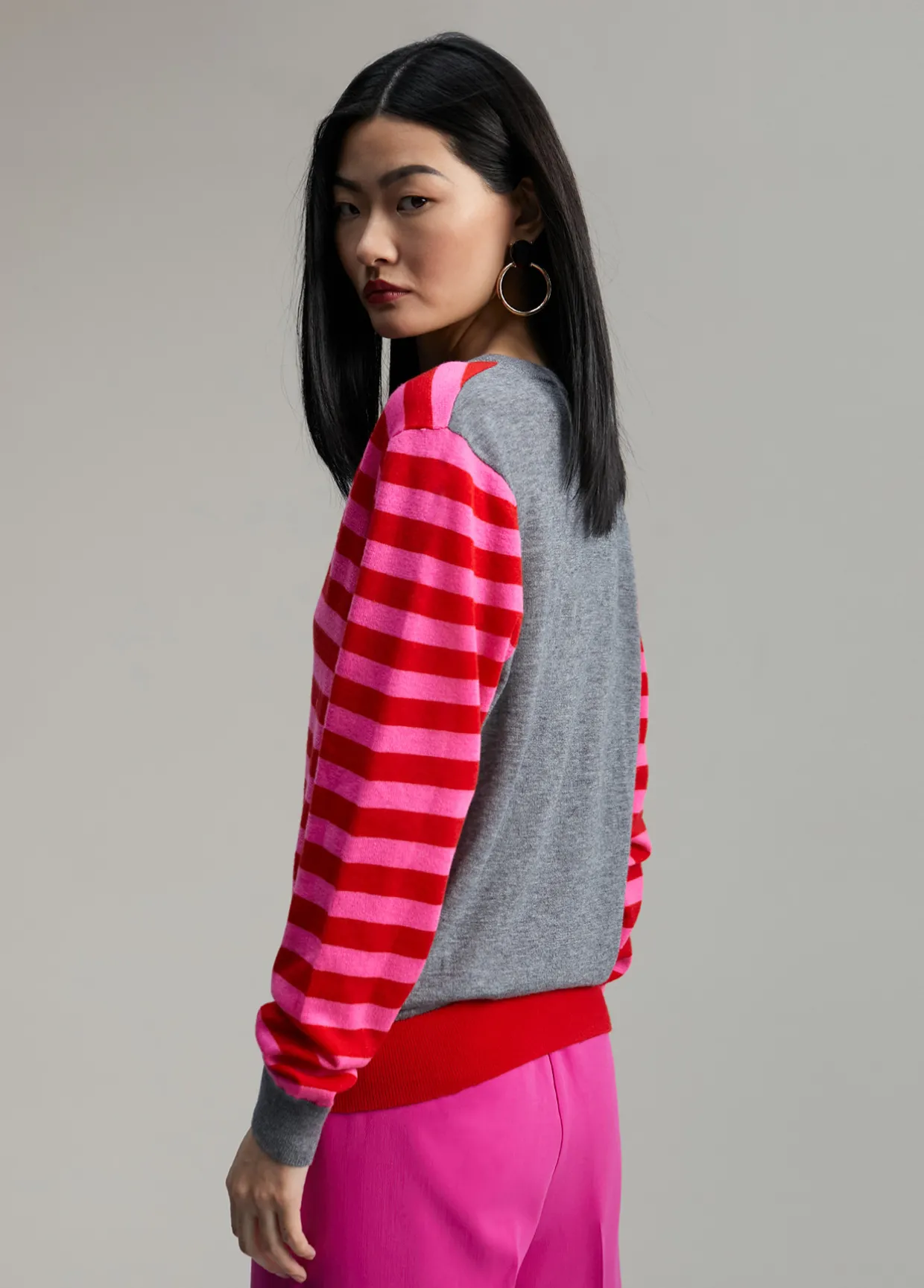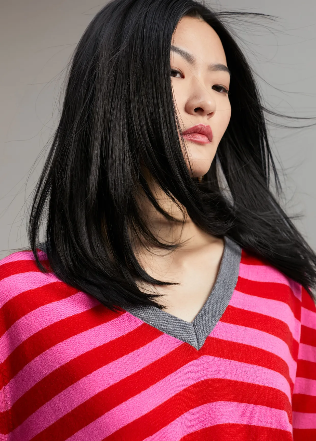 Jersey de punto en rayas bicolor. Detalle de color a contraste en rib cuello, puños y bajo.