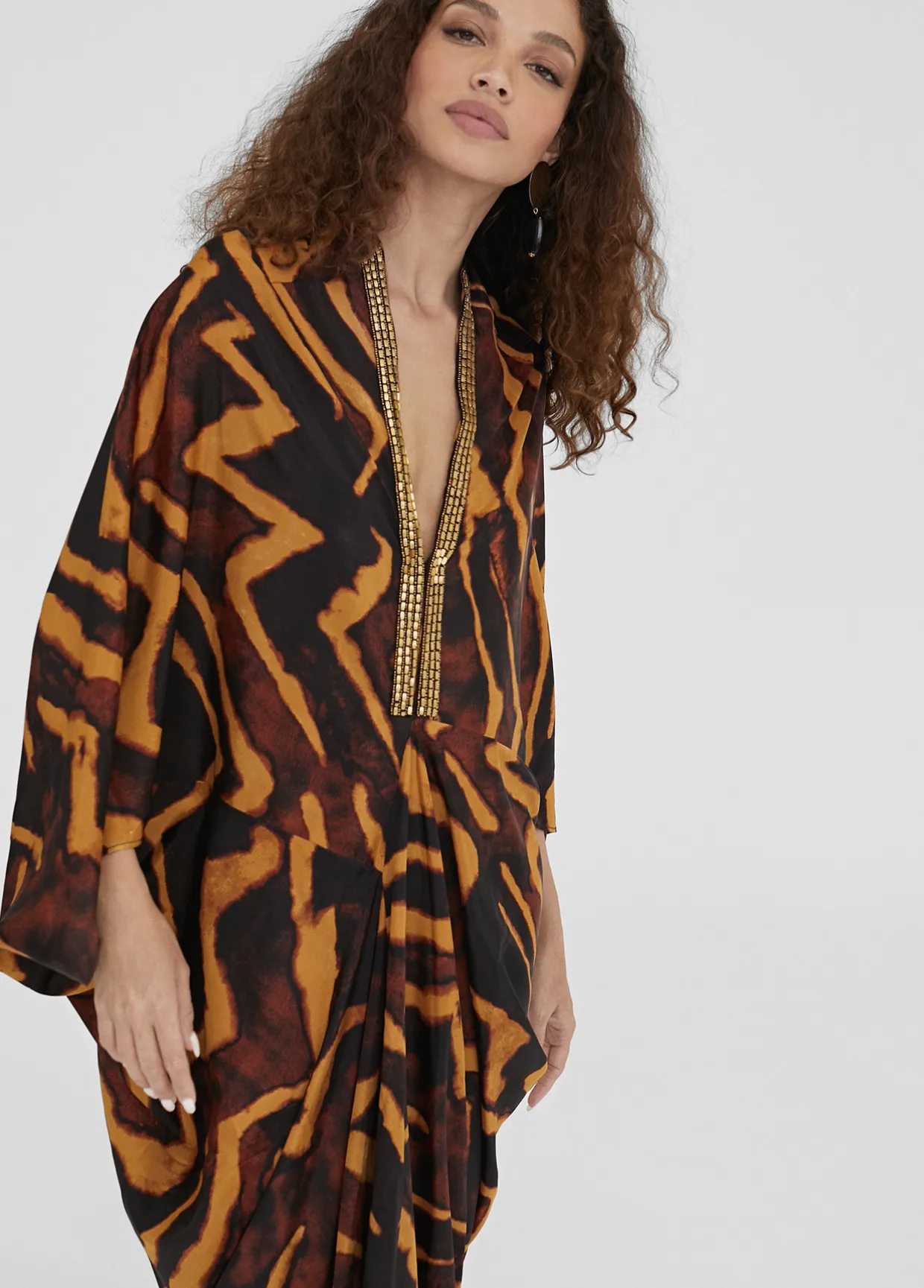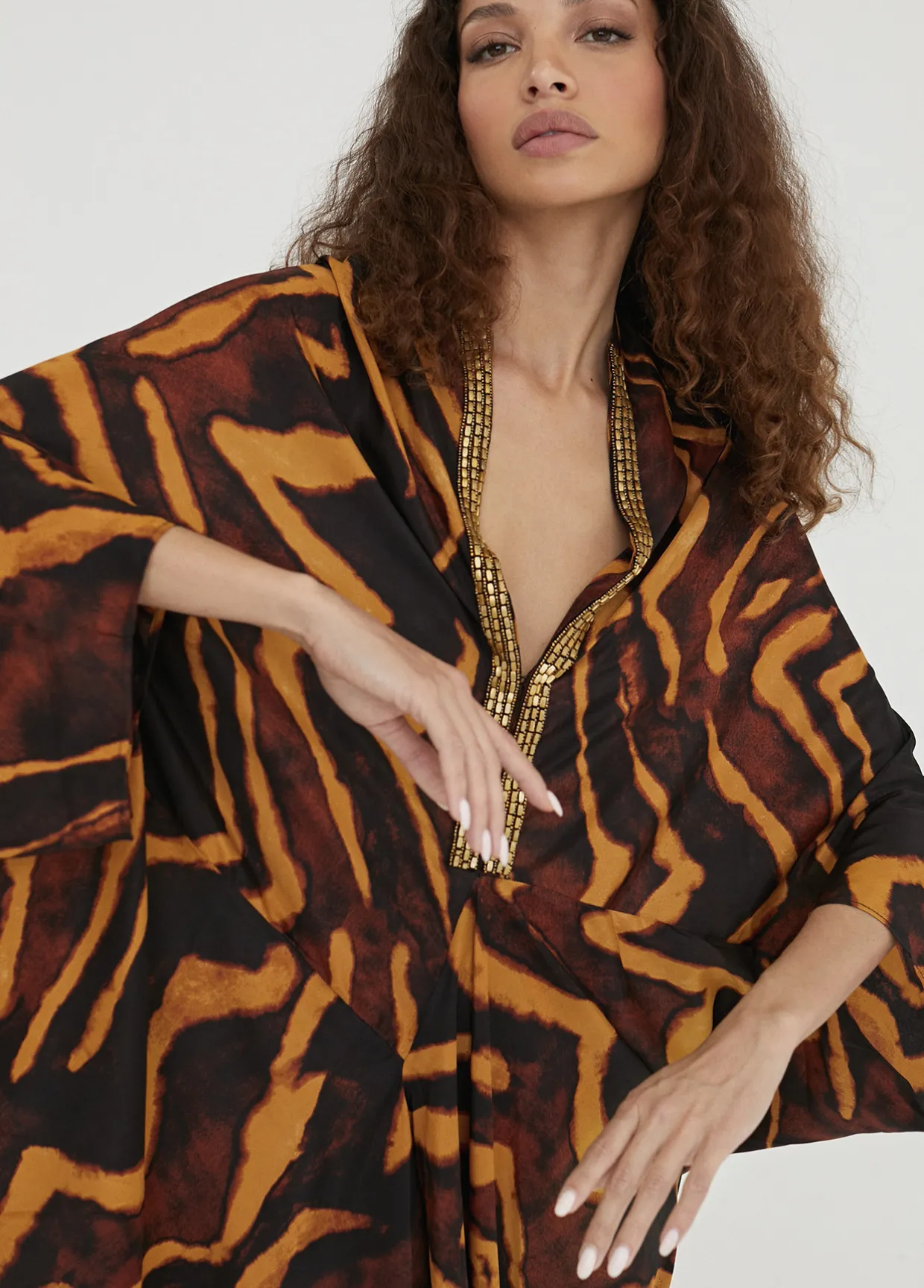 Caftan estilo kimono en estampado cebra bicolor. Escote pico bordado y manga ancha.