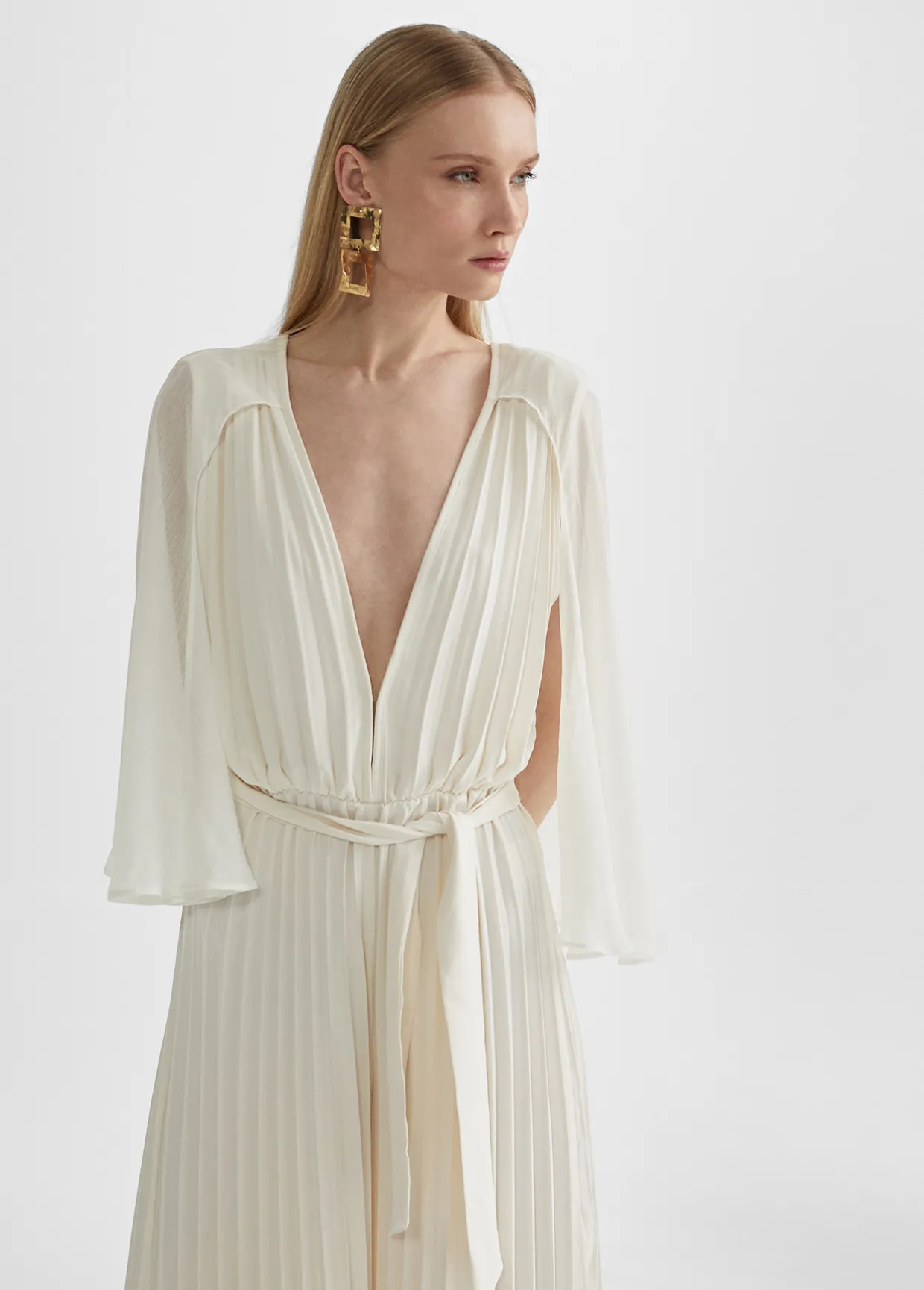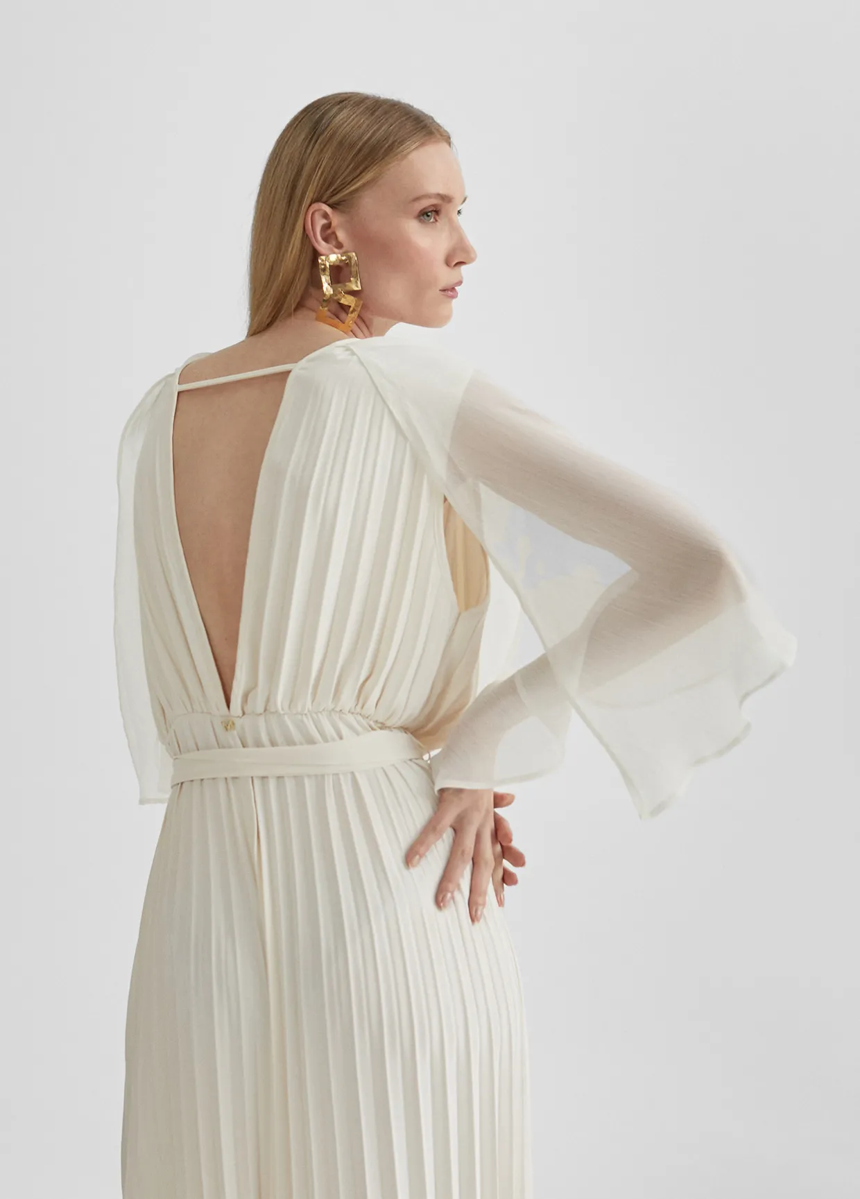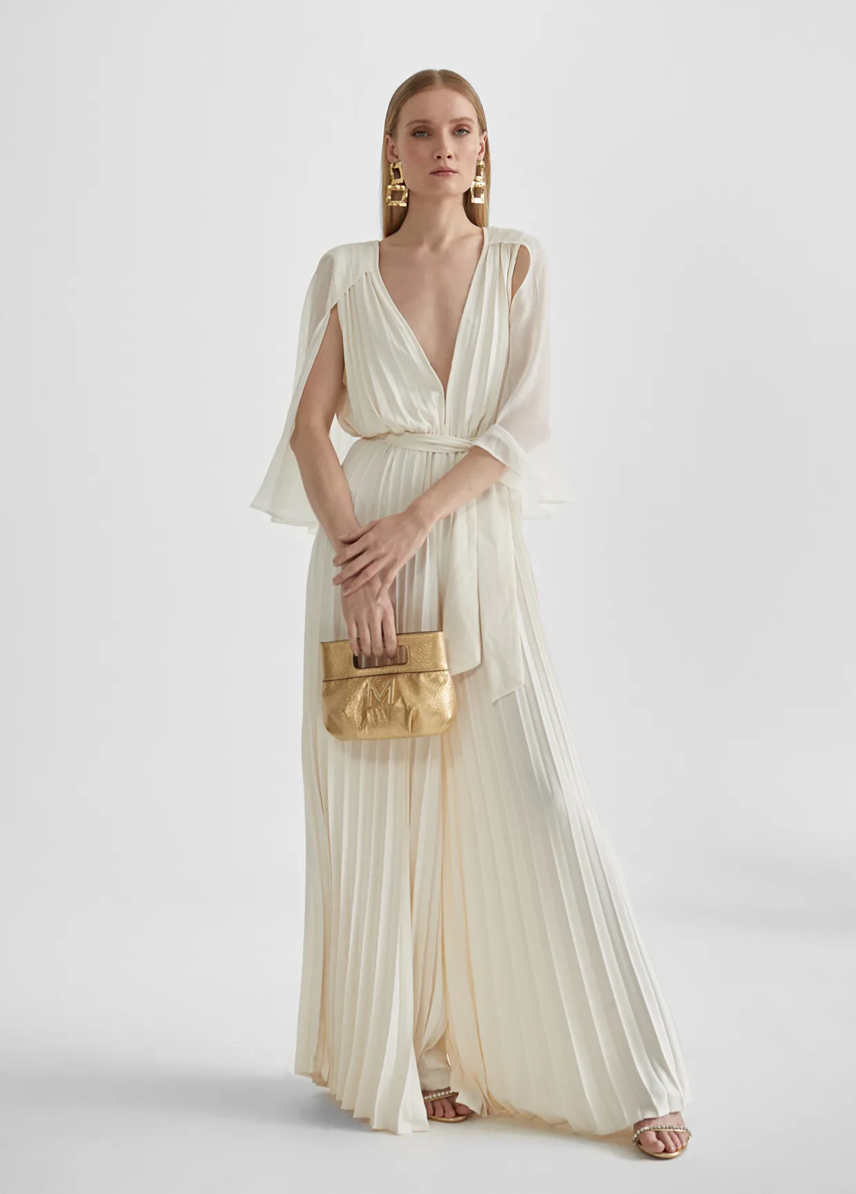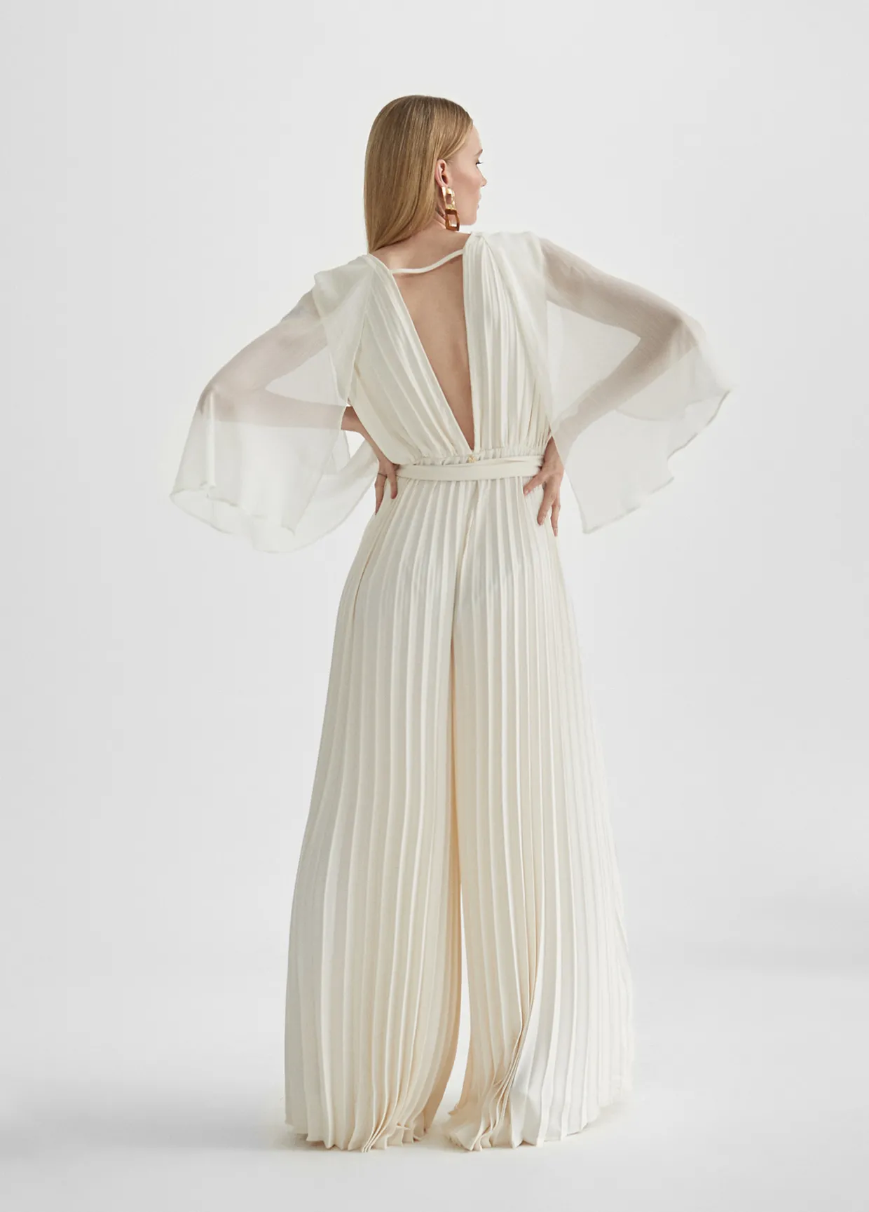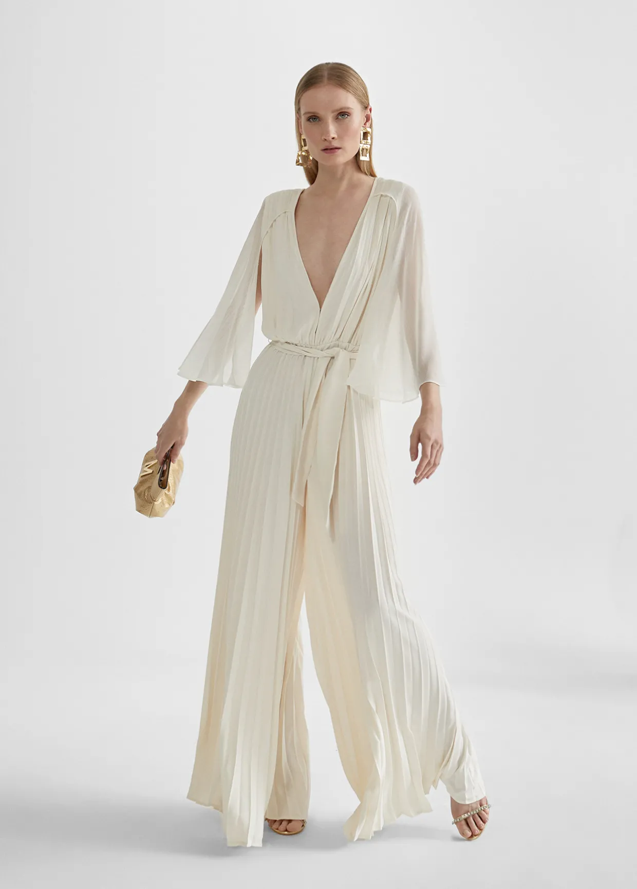 Mono largo plisado de tejido fluido. Escote pico en frontal y espalda. Cinturilla elástica. Mangas efecto capa. Cinturón del mismo tejido y color.