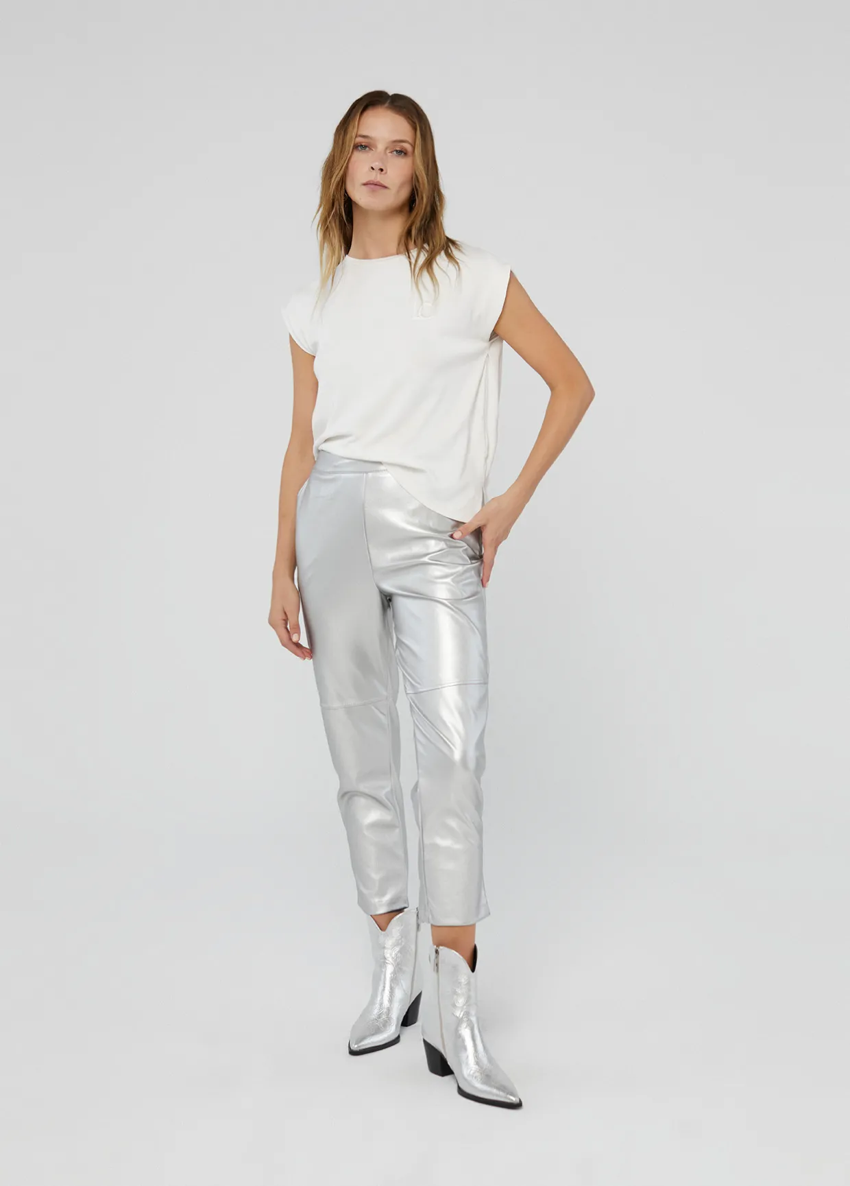 Pantalón plateado en efecto piel. Bolsillos y cremallera lateral.