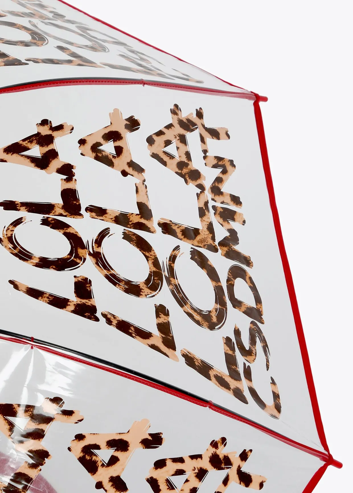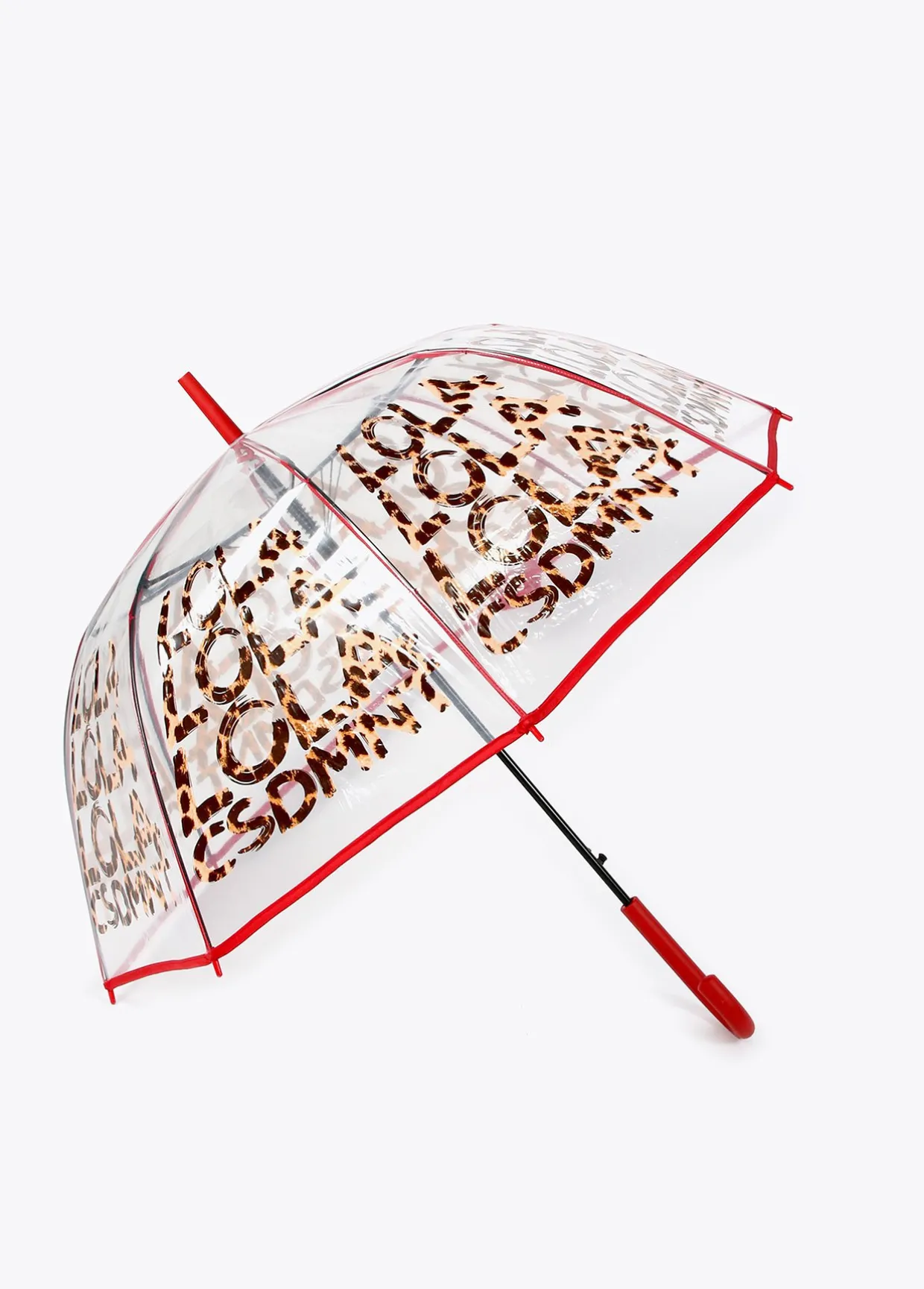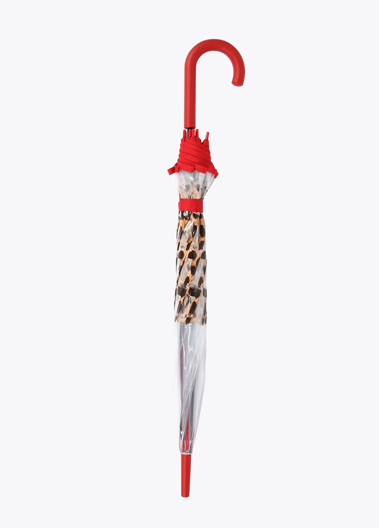Paraguas grande con estampado logotipado en animal print y detalles en rojo. Apertura automática y varillaje de aluminio.