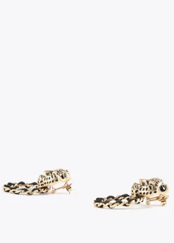 Pendientes dorados de dos piezas con cabeza de leopardo y aro con tejido entrelazado. Doble cierre.