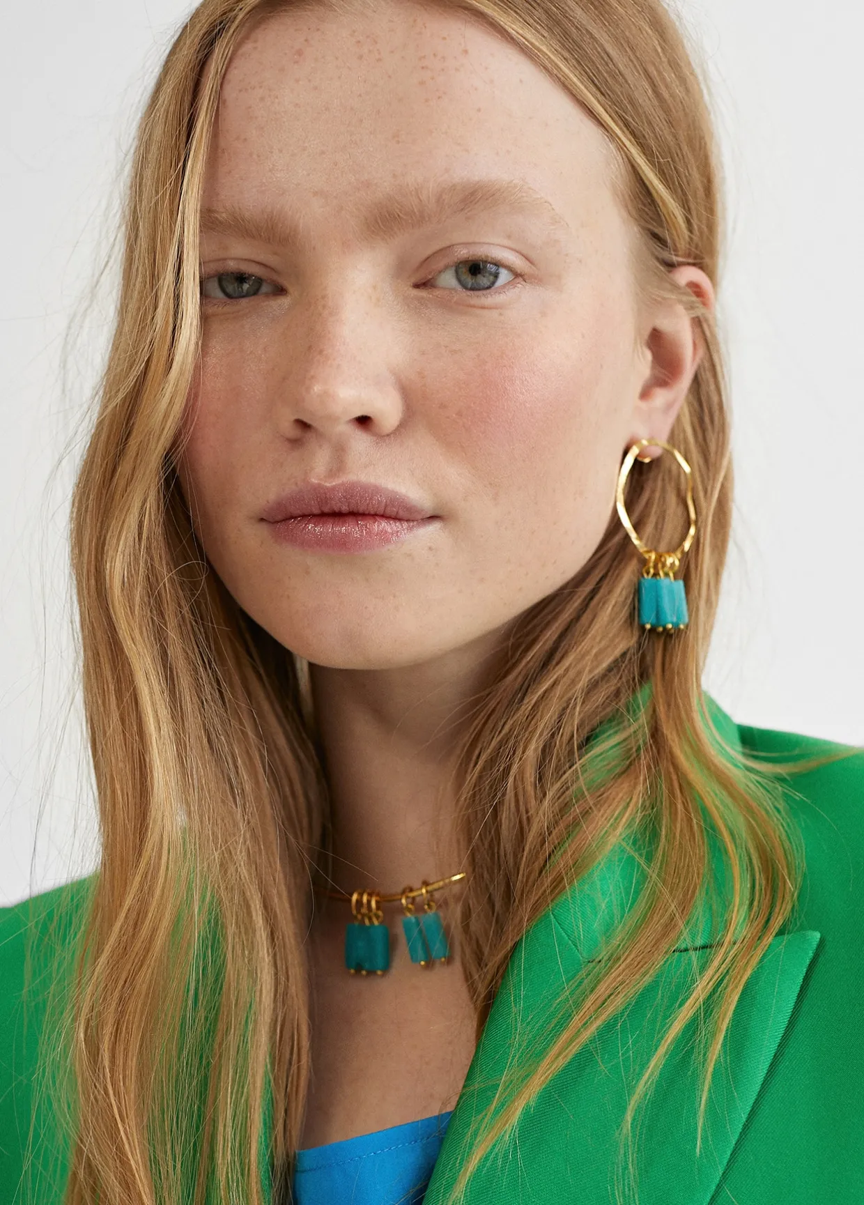 Pendientes de aro dorados con mini piedras colgantes color turquesa.