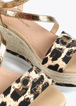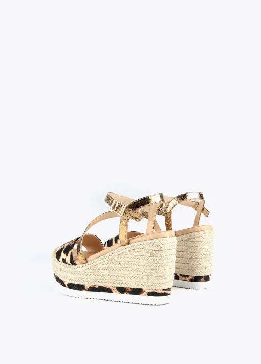 Sandalia tipo cuña en animal print con detalles en color dorado. Detalle letras logo de cristales y plantilla logotipada.