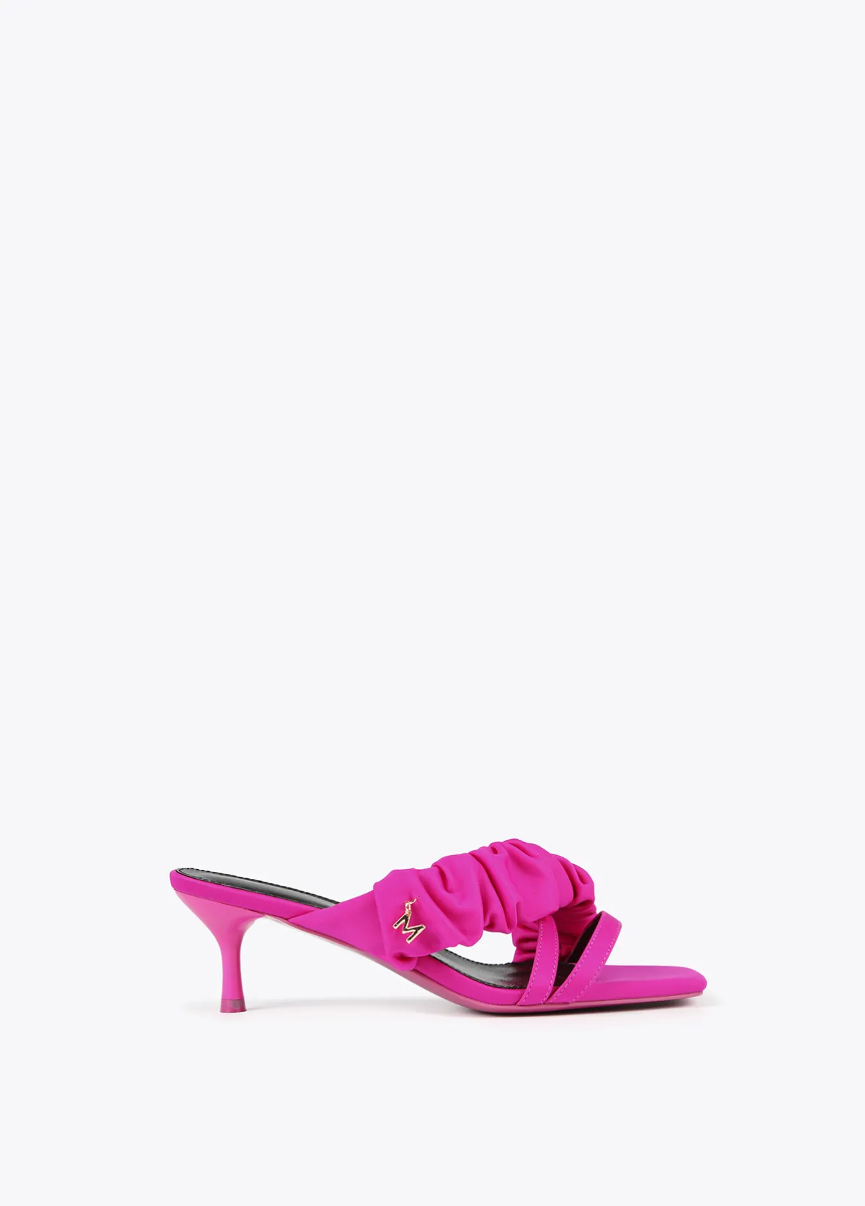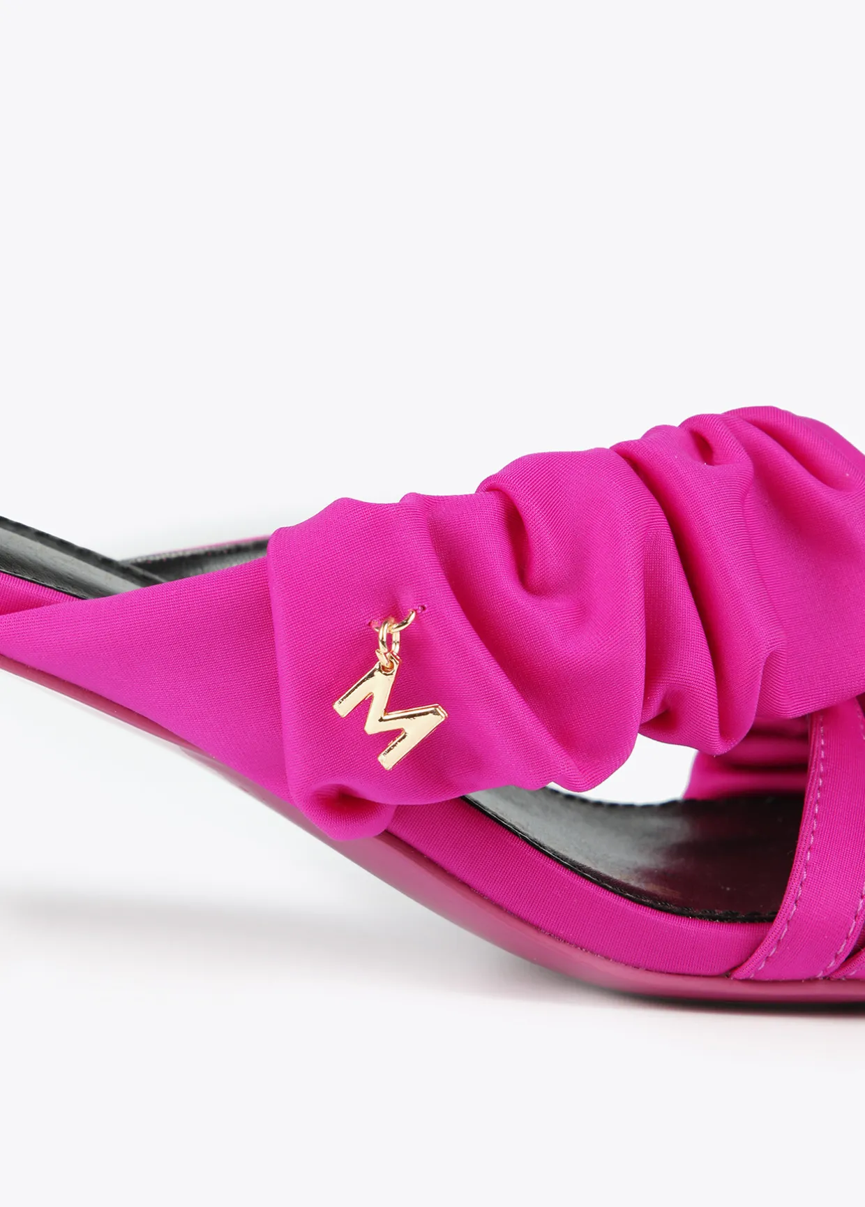 Sandalia de tacón medio con dos tiras y tira fruncida con detalle letra M dorada en su lateral. Plantilla logotipada.