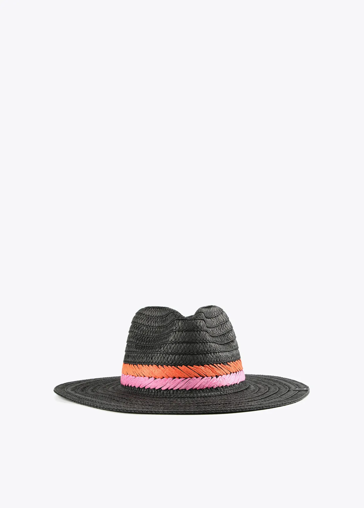 Sombrero negro con detalle bordado trenzado en colores rosa y naranja. Logo en efecto piel en la ala.