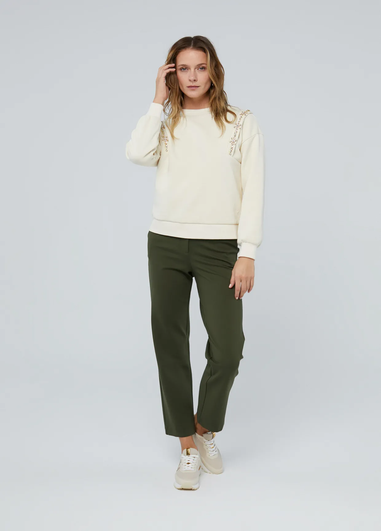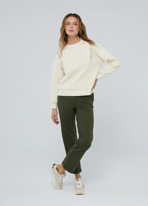 Sudadera con detalle de pedrería a tono. Cuello caja y manga caída.