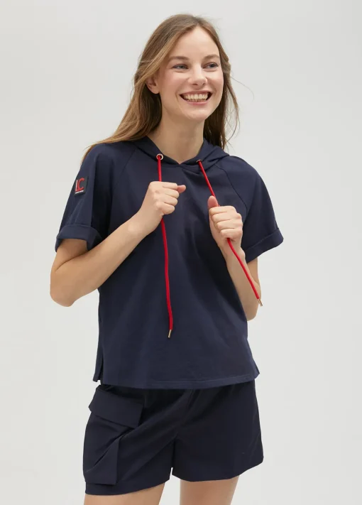 Sudadera de cuello con capucha ajustable y manga corta acabada en vuelta. Tejido en hilatura de algodón 100%. Logo estampado a contraste en lateral. Acabados en detalle en tirador de capucha.
