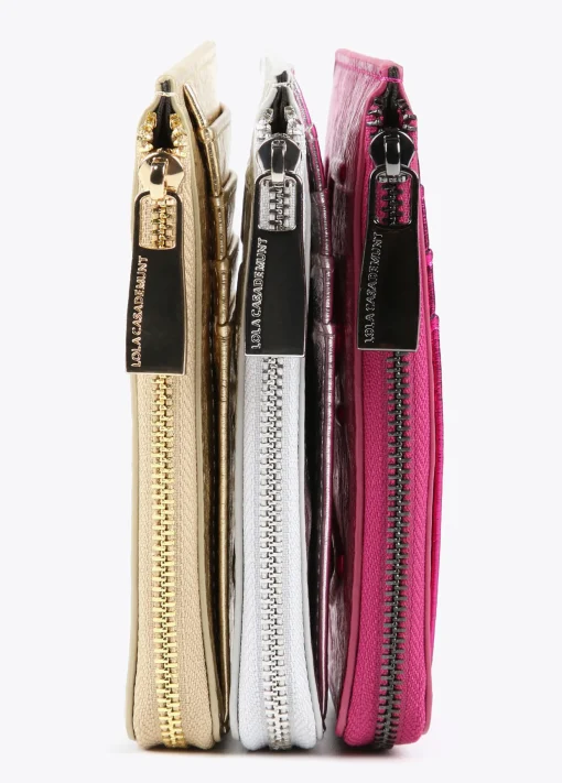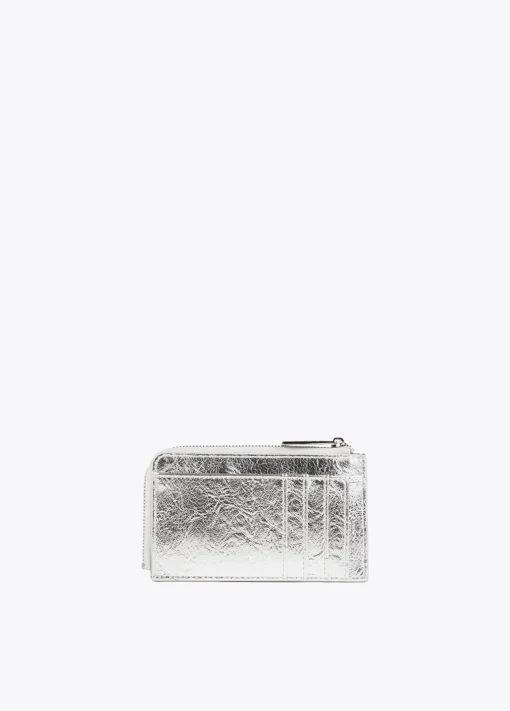 Tarjetero metalizado. Cierre con cremallera para monedas y logo grabado en parte frontal.