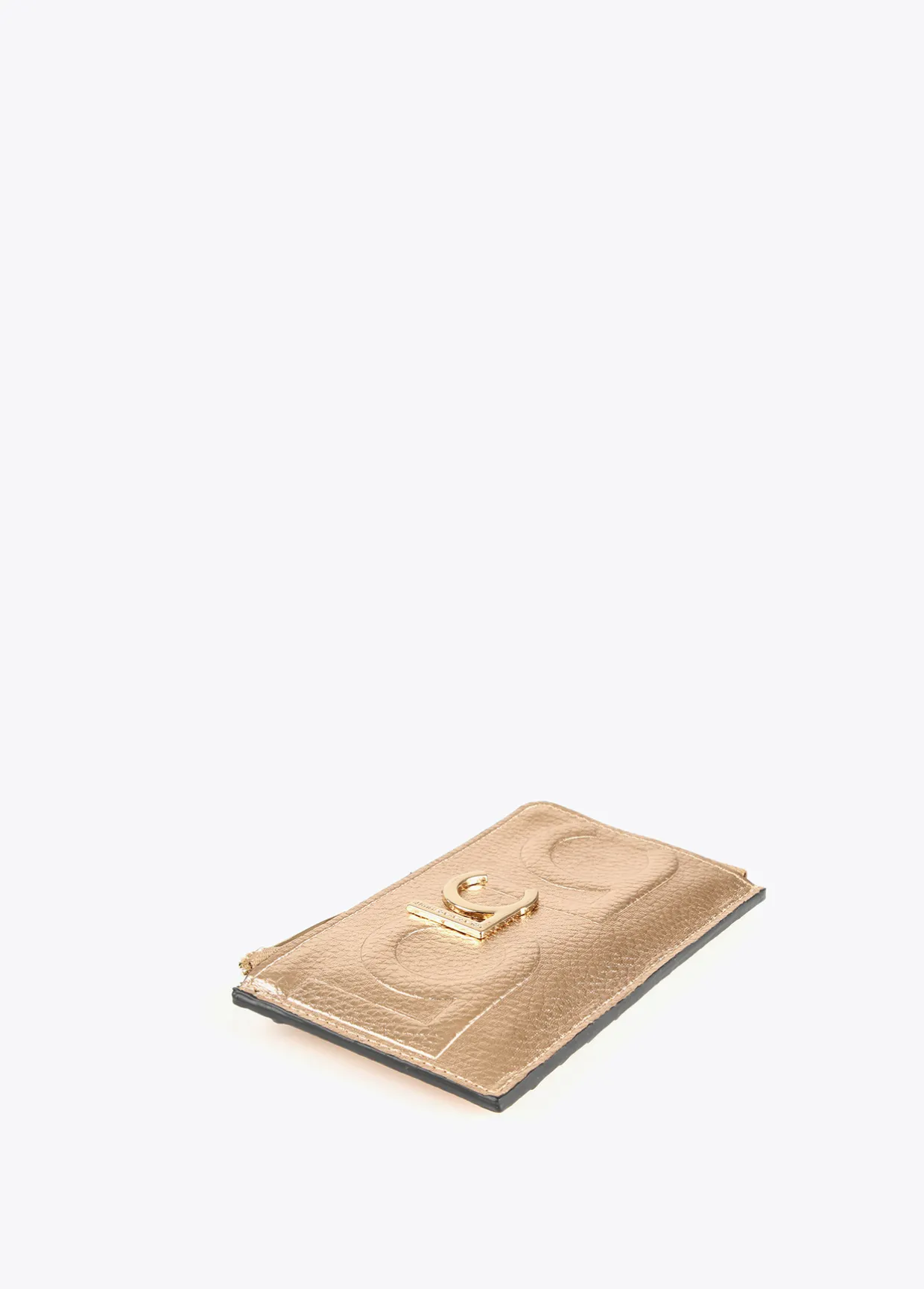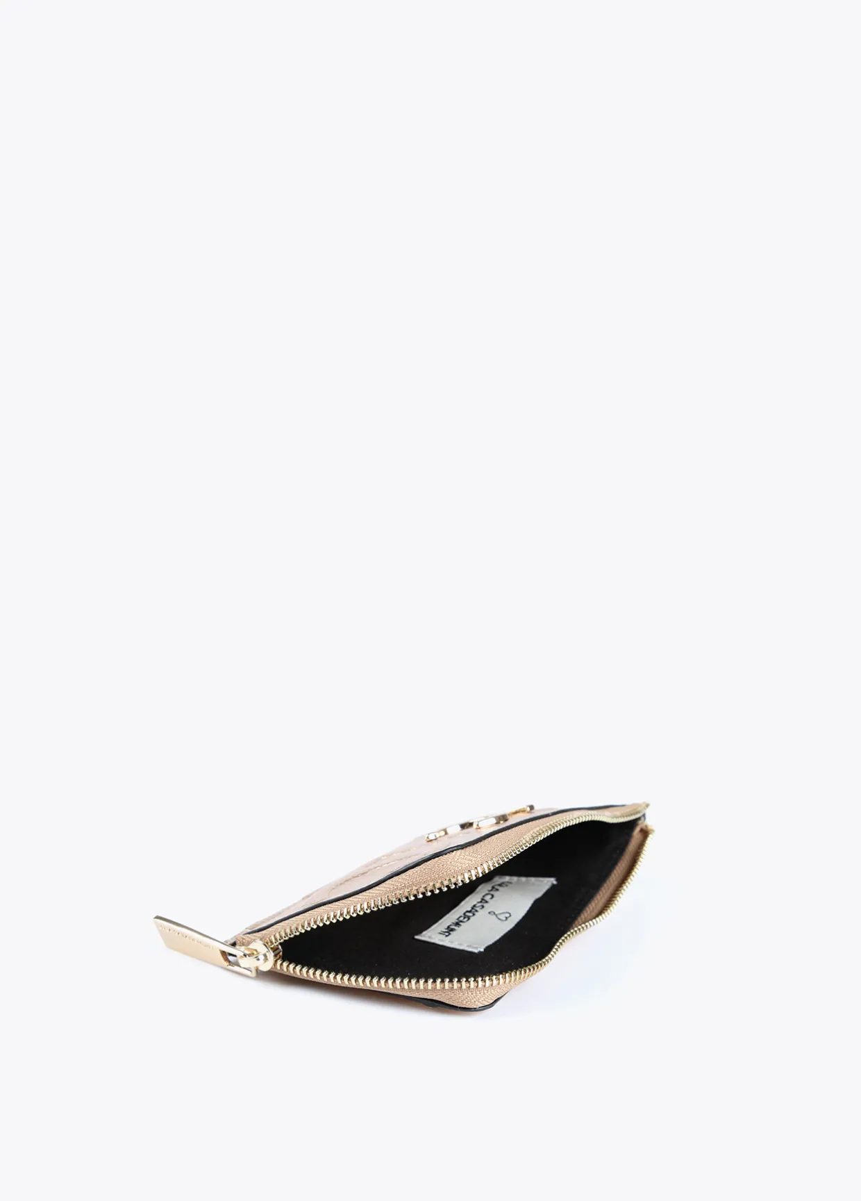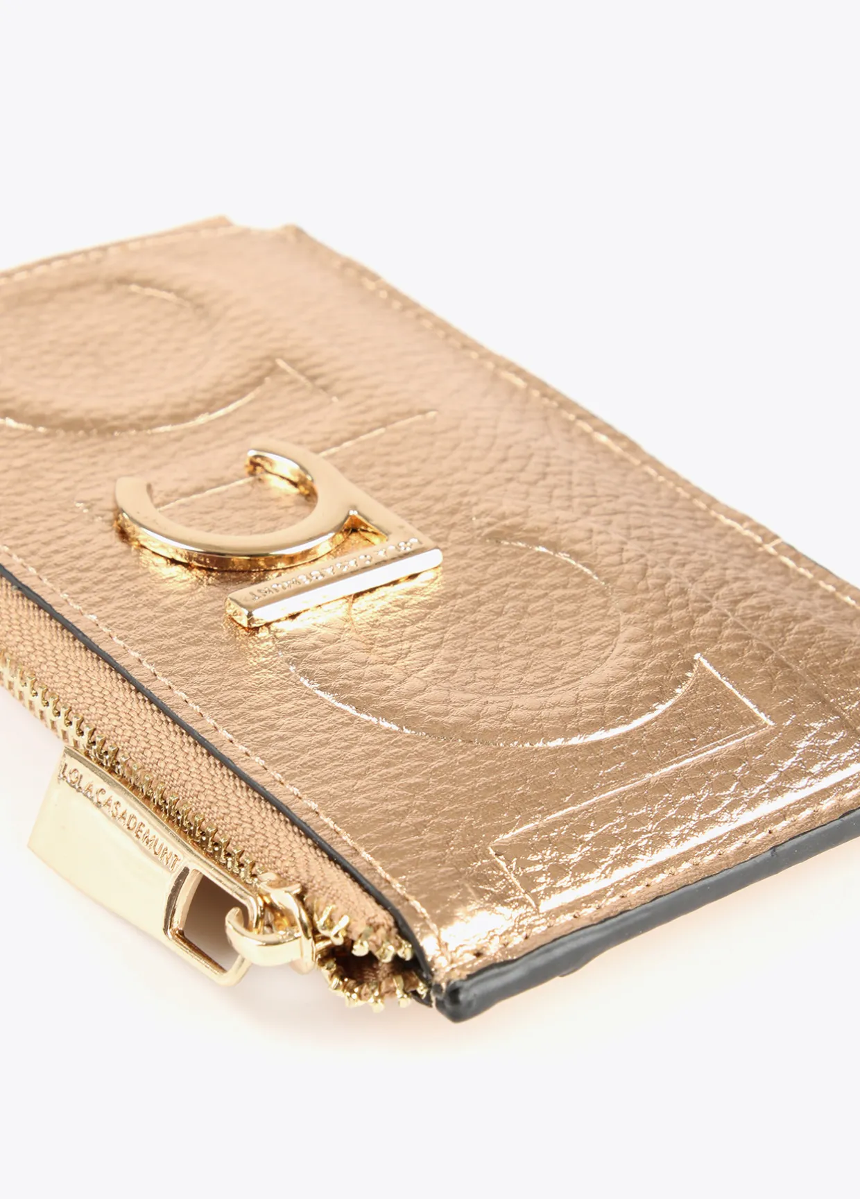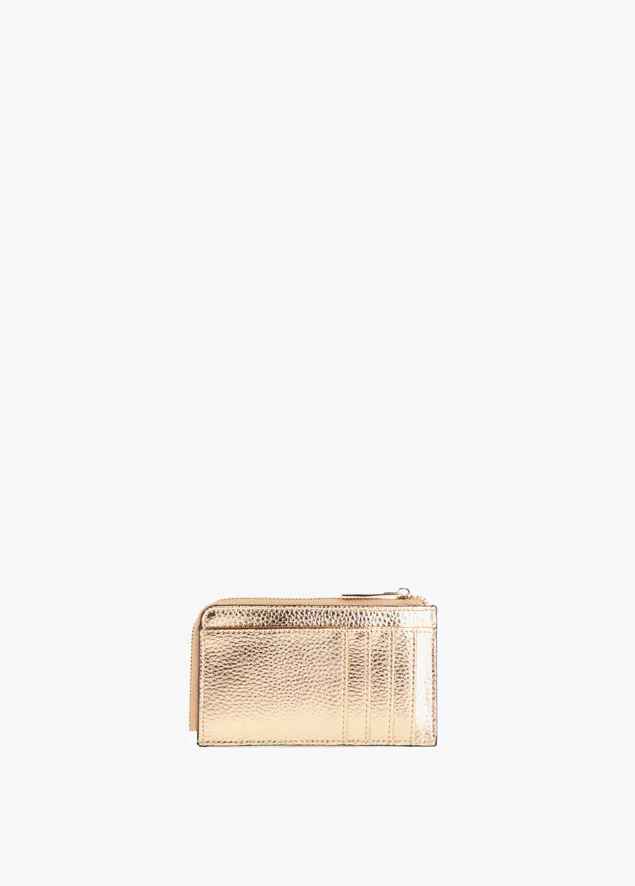 Tarjetero en efecto piel metalizado y logo grabado. Logo metalizado en parte frontal. Bolsillo con cierre de cremallera.