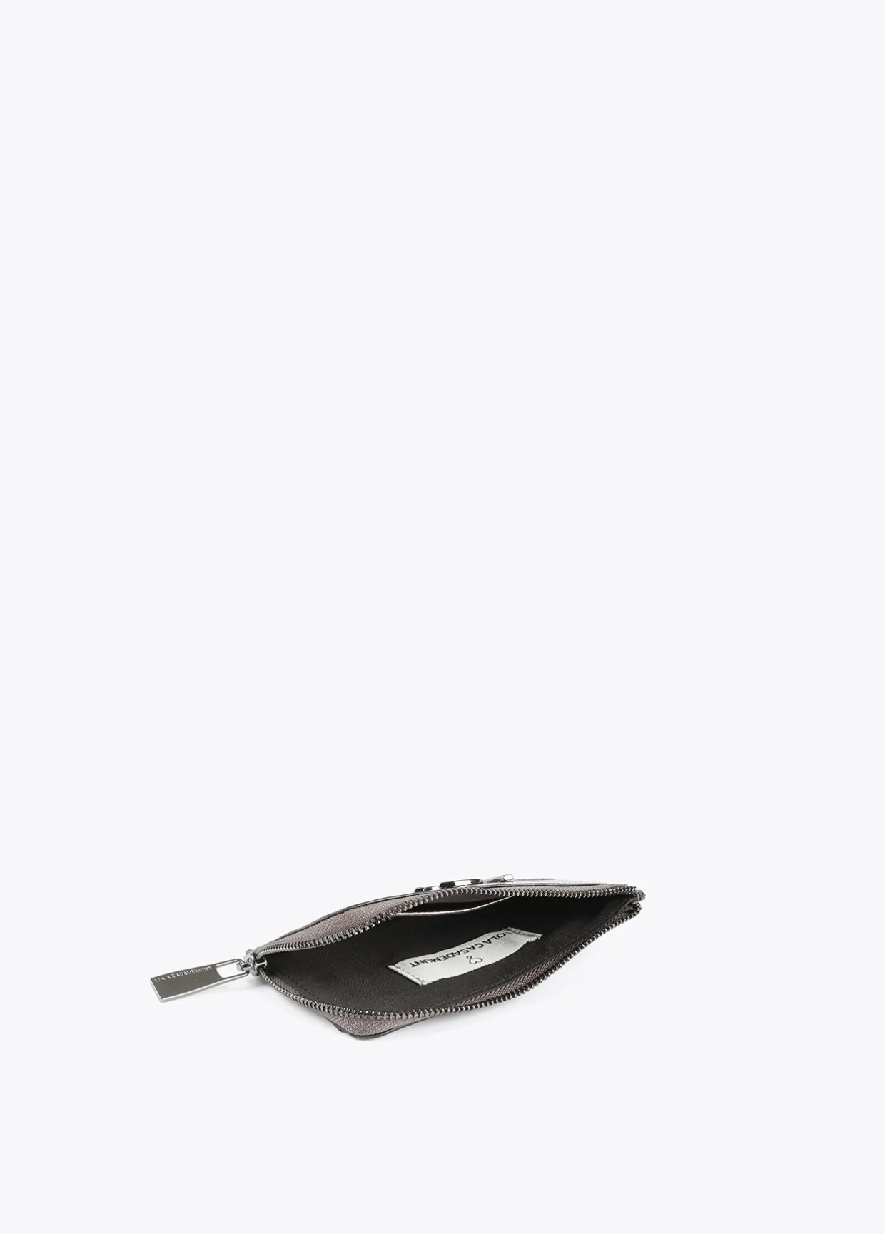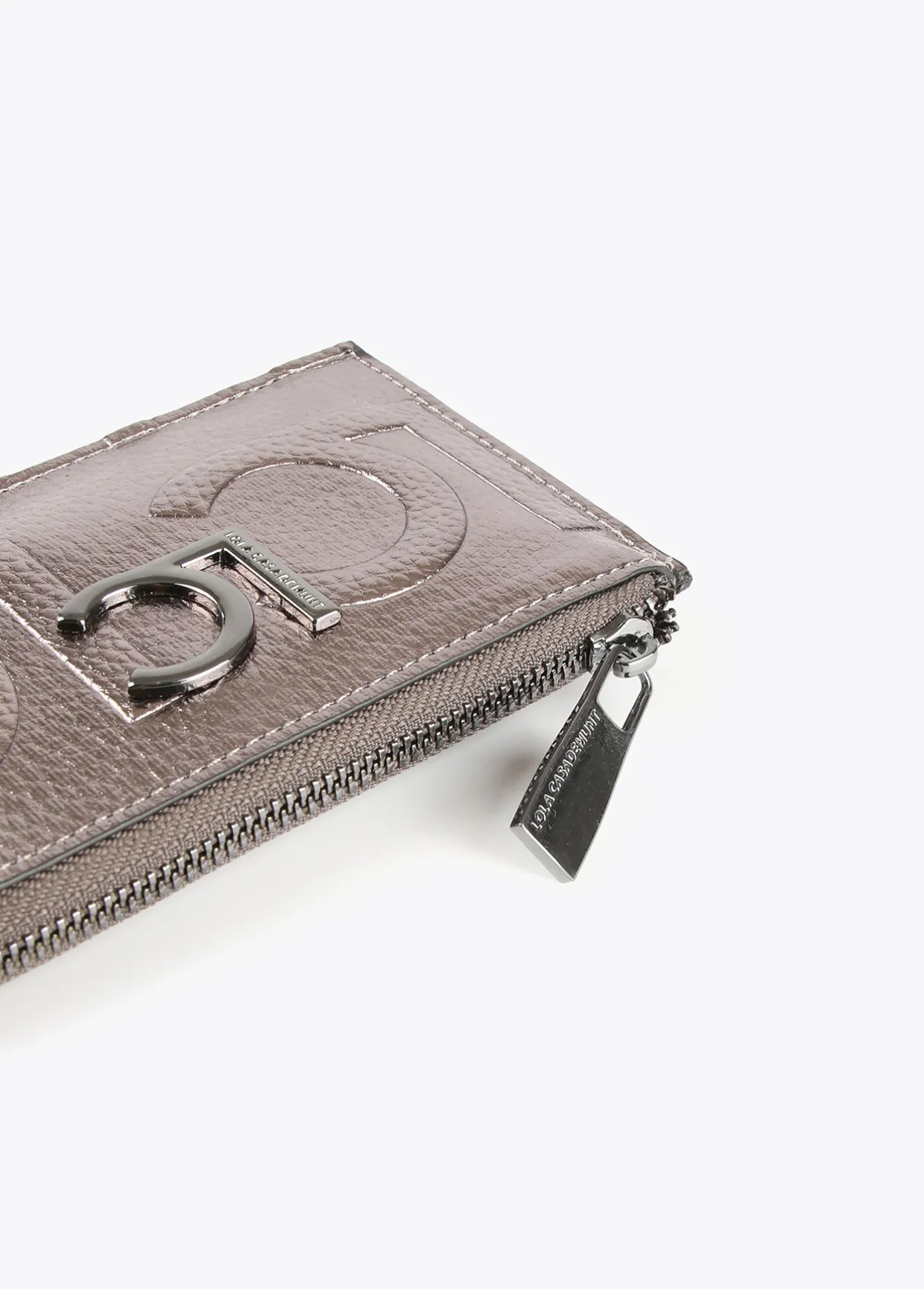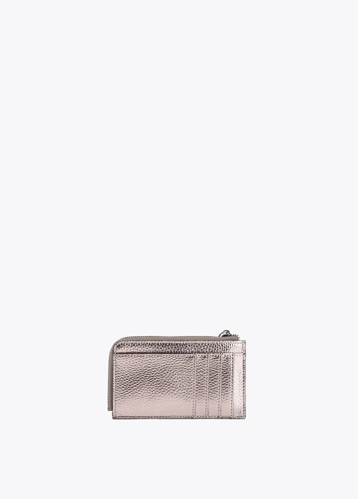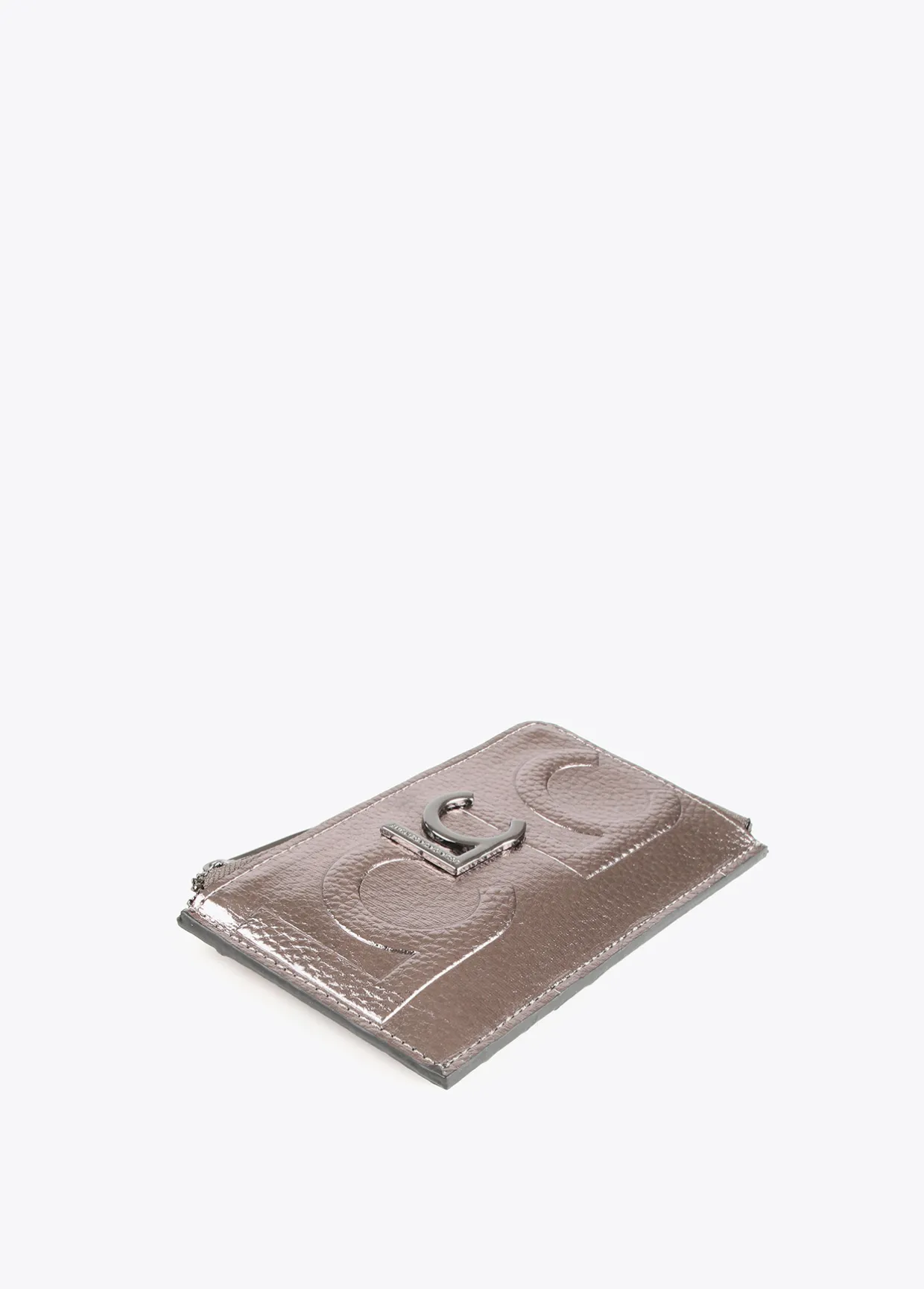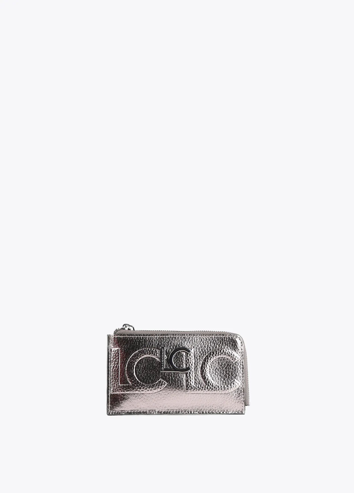 Tarjetero en efecto piel metalizado y logo grabado. Logo metalizado en parte frontal. Bolsillo con cierre de cremallera.
