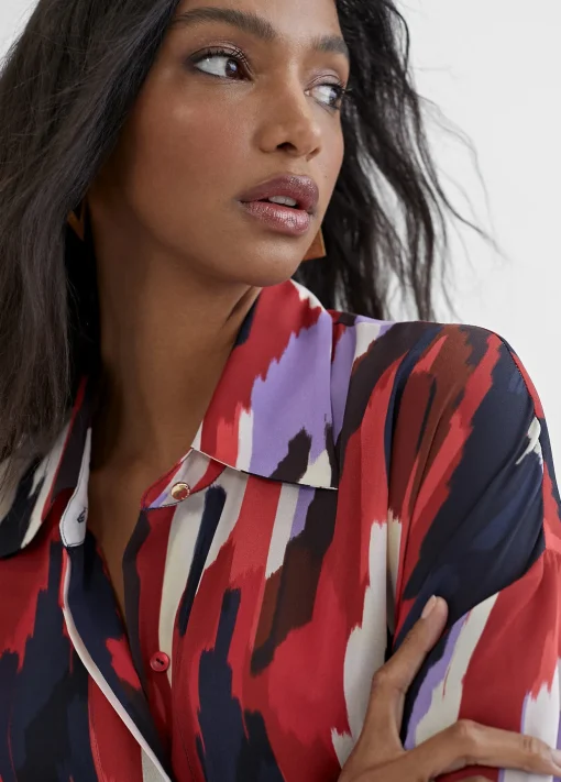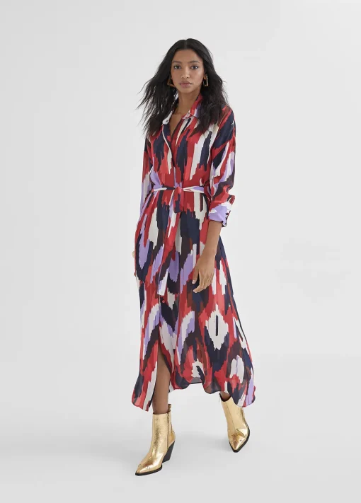 Vestido largo y fluido estilo camisero con estampado multicolor. Cierre con botones invisibles y cinta a modo de cinturón.