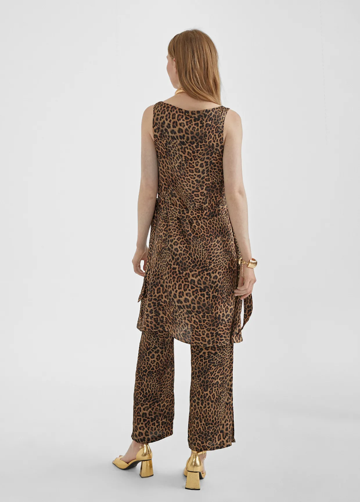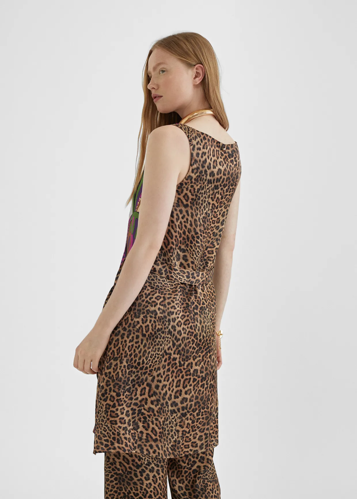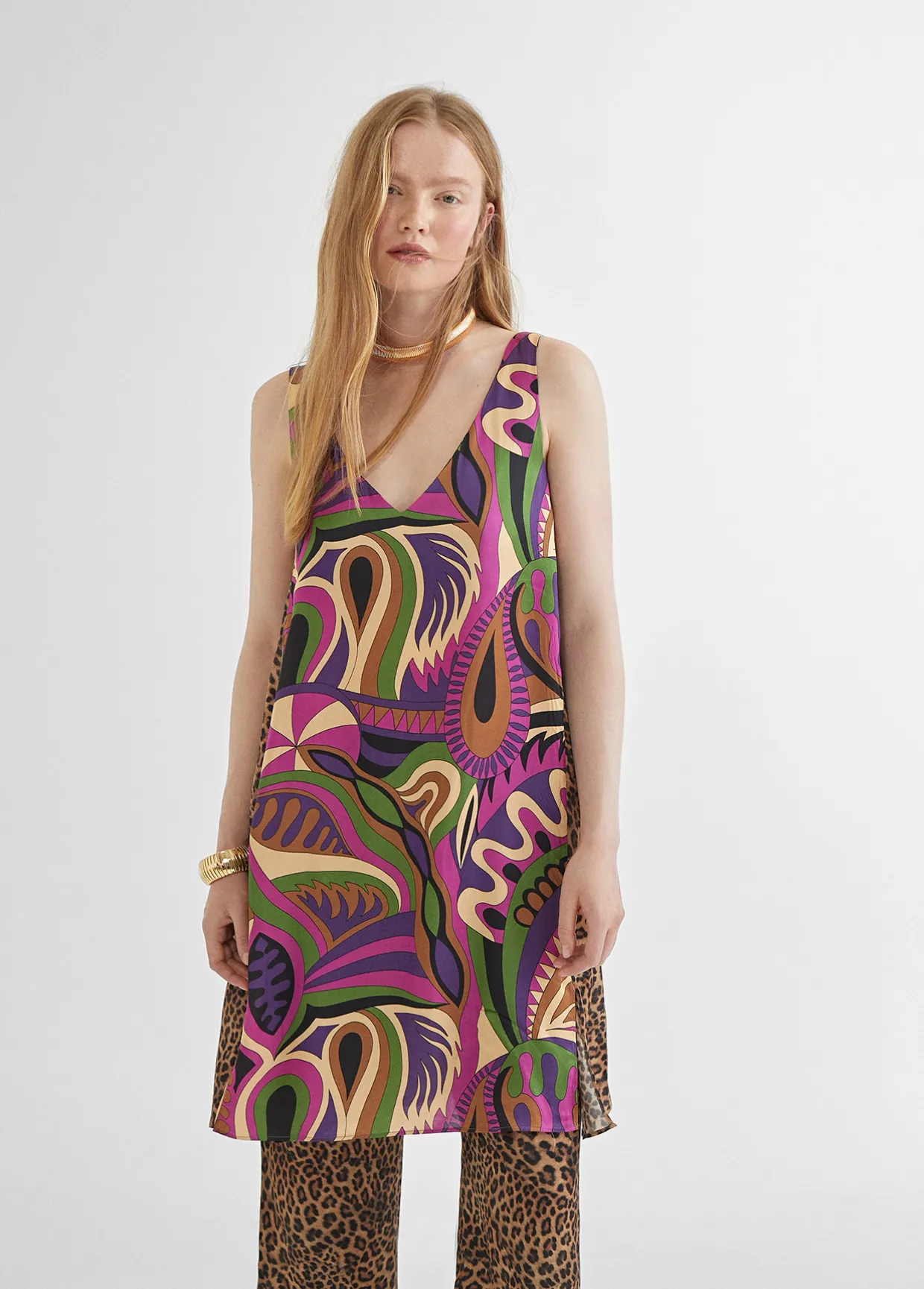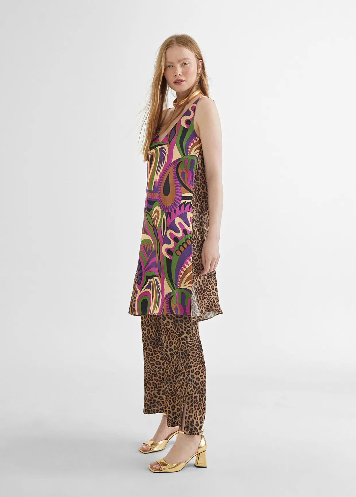 Vestido de tirantes o camisola larga con estampado pashley y animal print combinados. Cuello con escote en pico y tirante grueso.