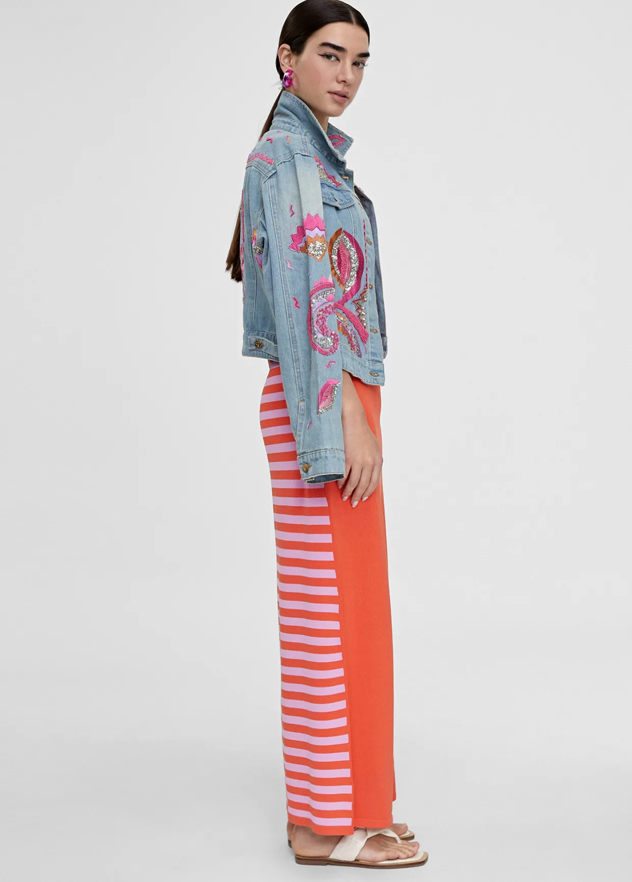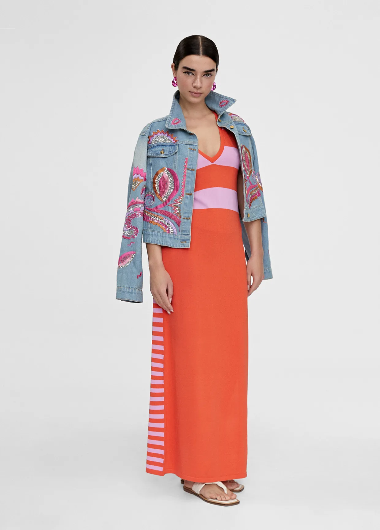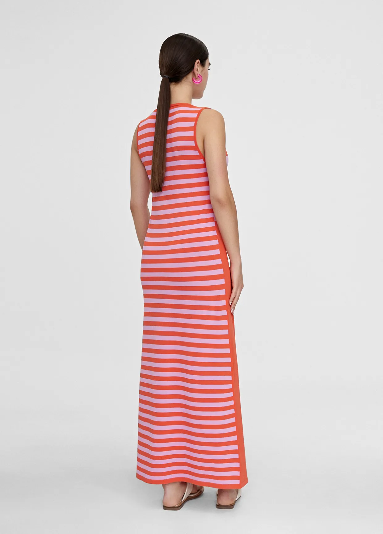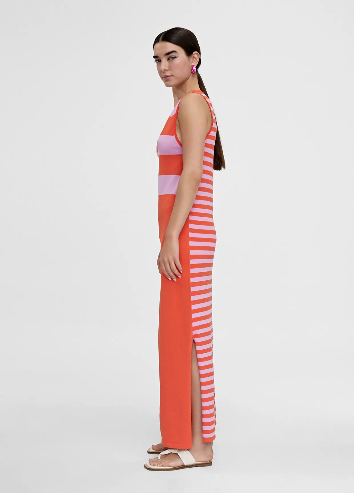 Vestido largo de punto. Rayas anchas bicolor en frontal cuerpo. Falda lisa. Escote pico y manga sisa. Aberturas laterales y espalda en rayas estrechas bicolor.