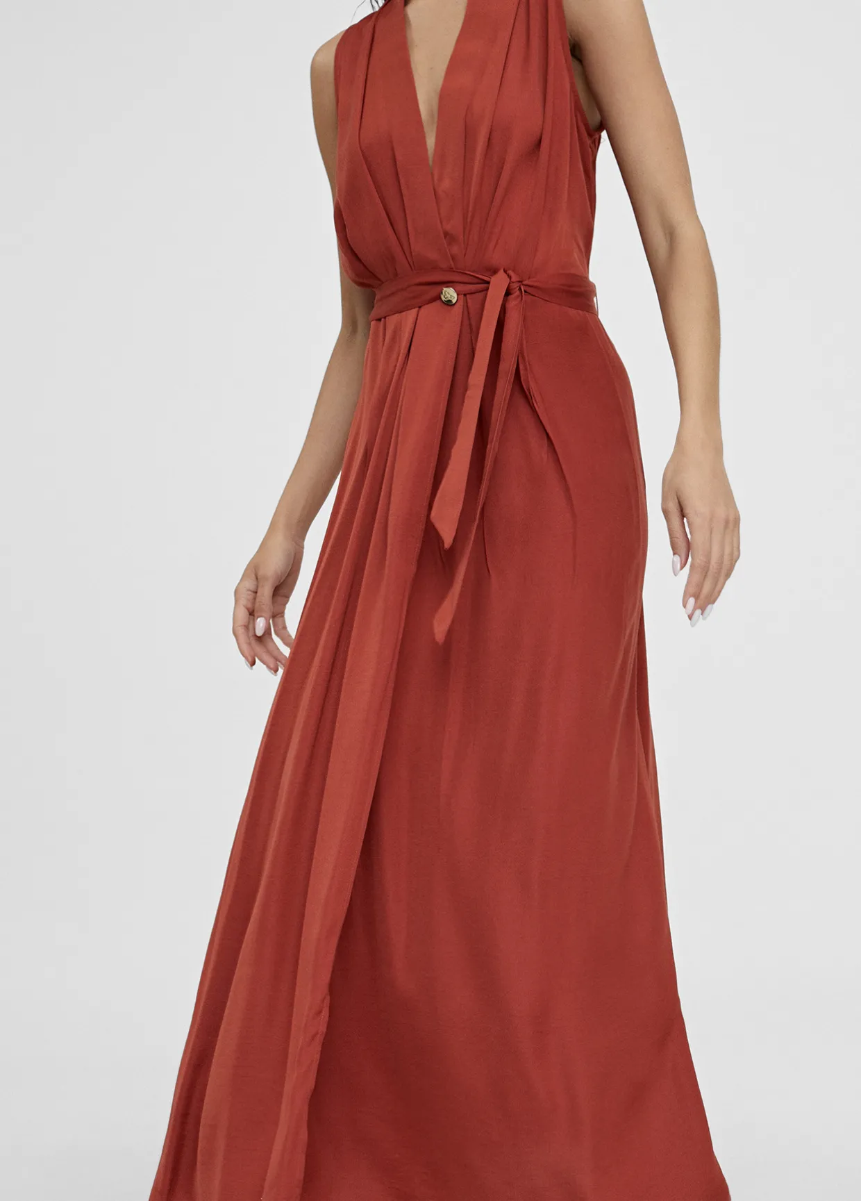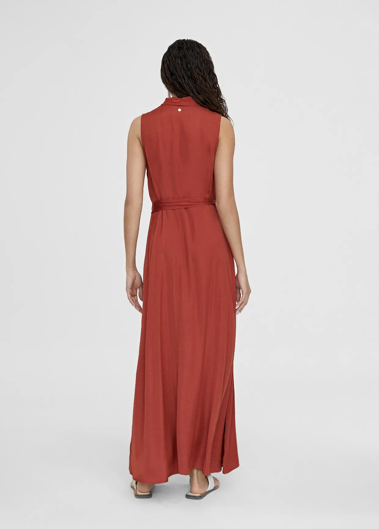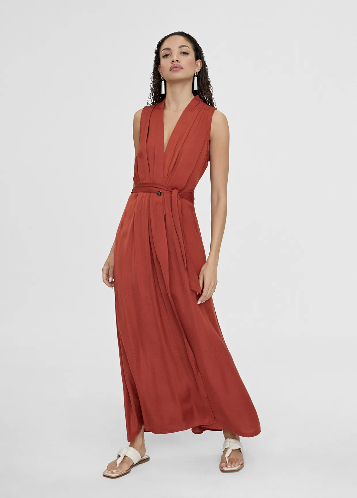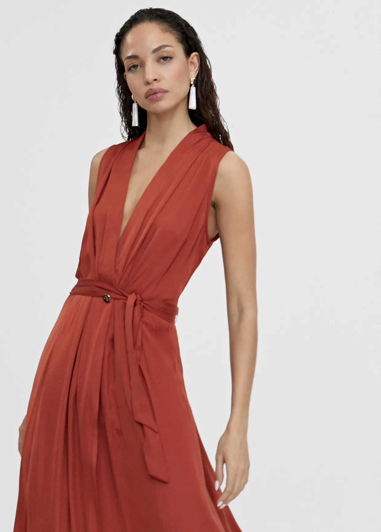 Vestido fluido monocolor. Escote pico y manga sisa. Cinturon del mismo tejido y color. Falda cruzada.