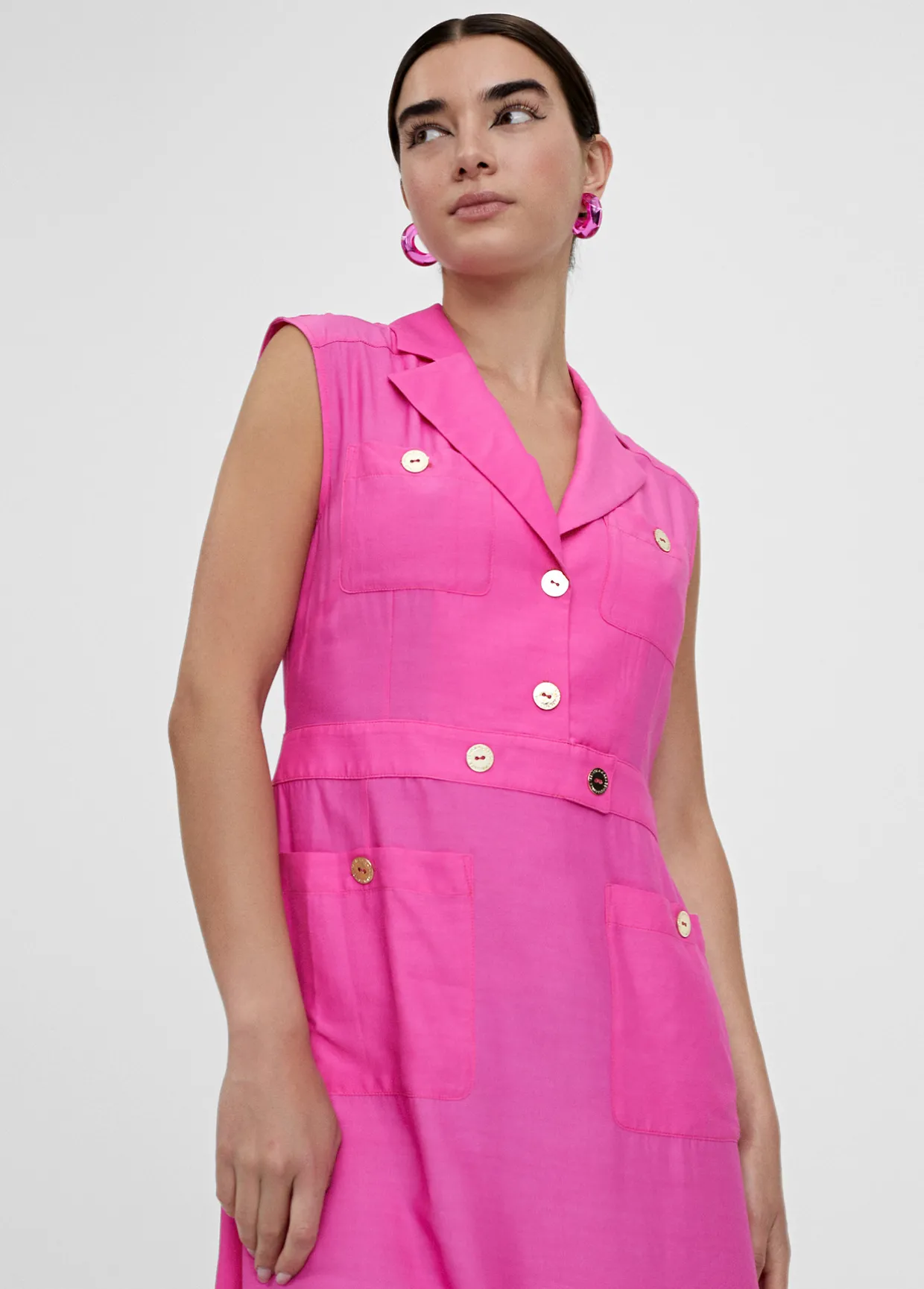 Vestido midi fluido. Cuello solapa con escote pico. Cierre delantero con botones hasta cintura. Bolsillos frontales tipo plastrón con boton dorado.